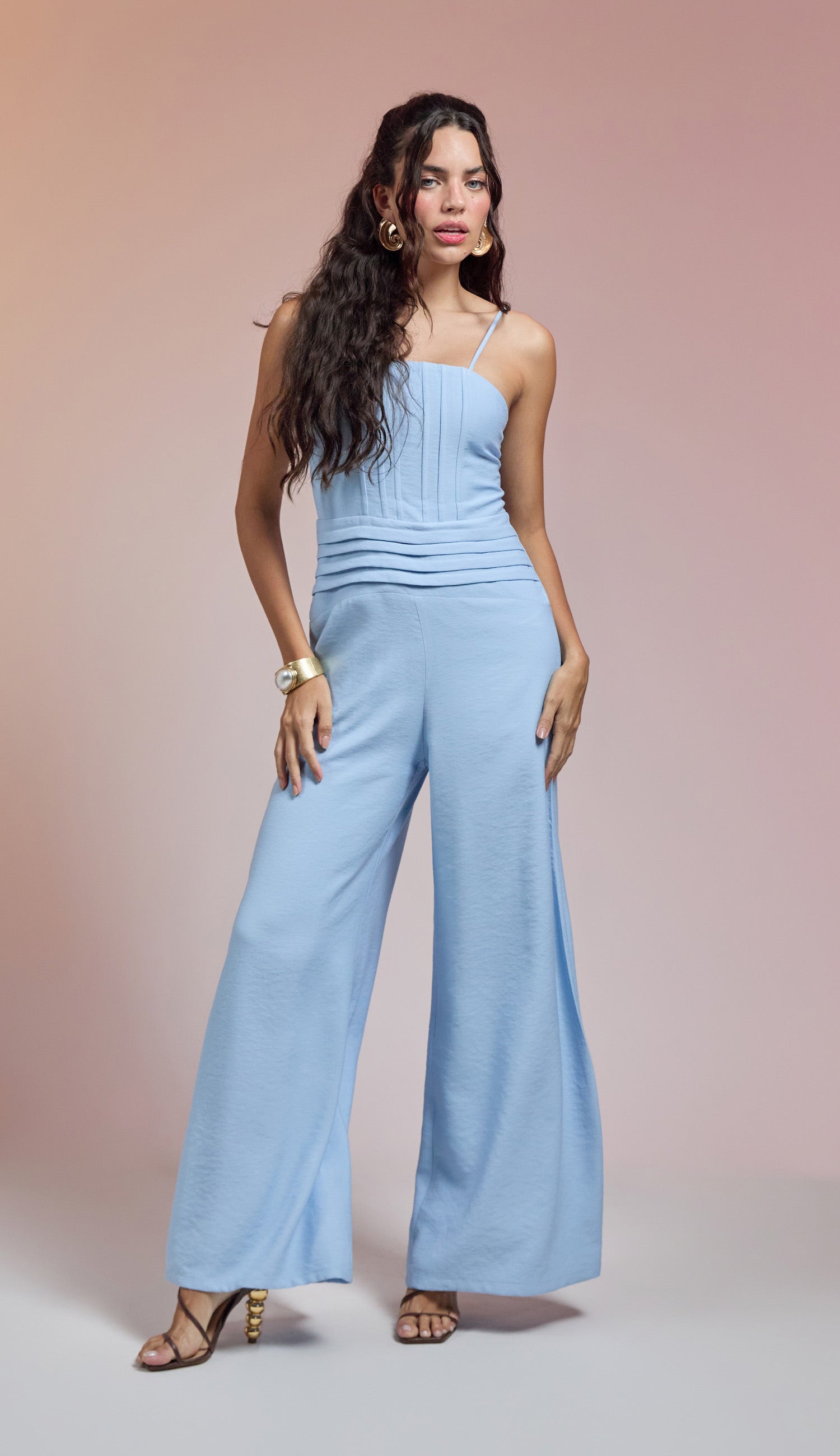Macacão pantalona com forro, confeccionado em sarja de alfaiataria em viscose twill mais encorpada com aspecto amassadinho. Possui decote reto com elástico franzido; barbatanas frontais no busto, que estruturam a peça; pala larga na cintura com detalhe pregueado; alcinhas reguláveis e fechamento traseiro por zíper de metal.