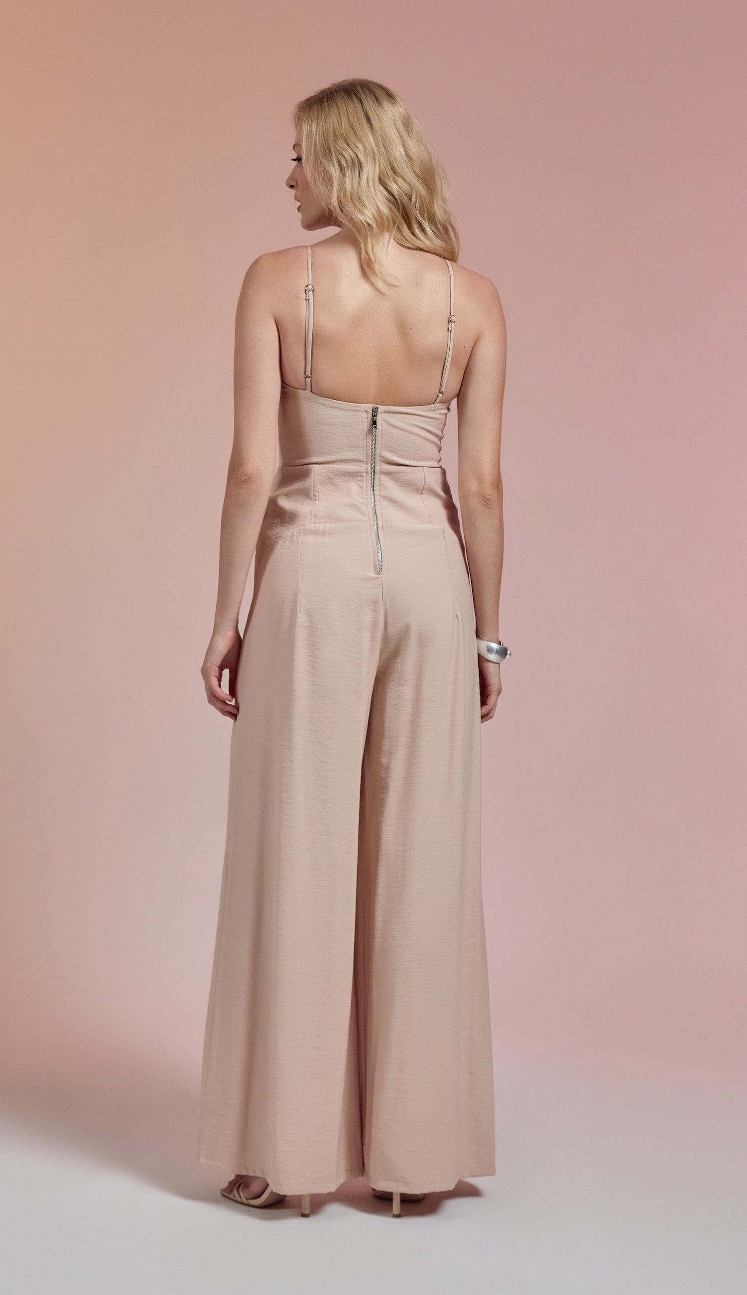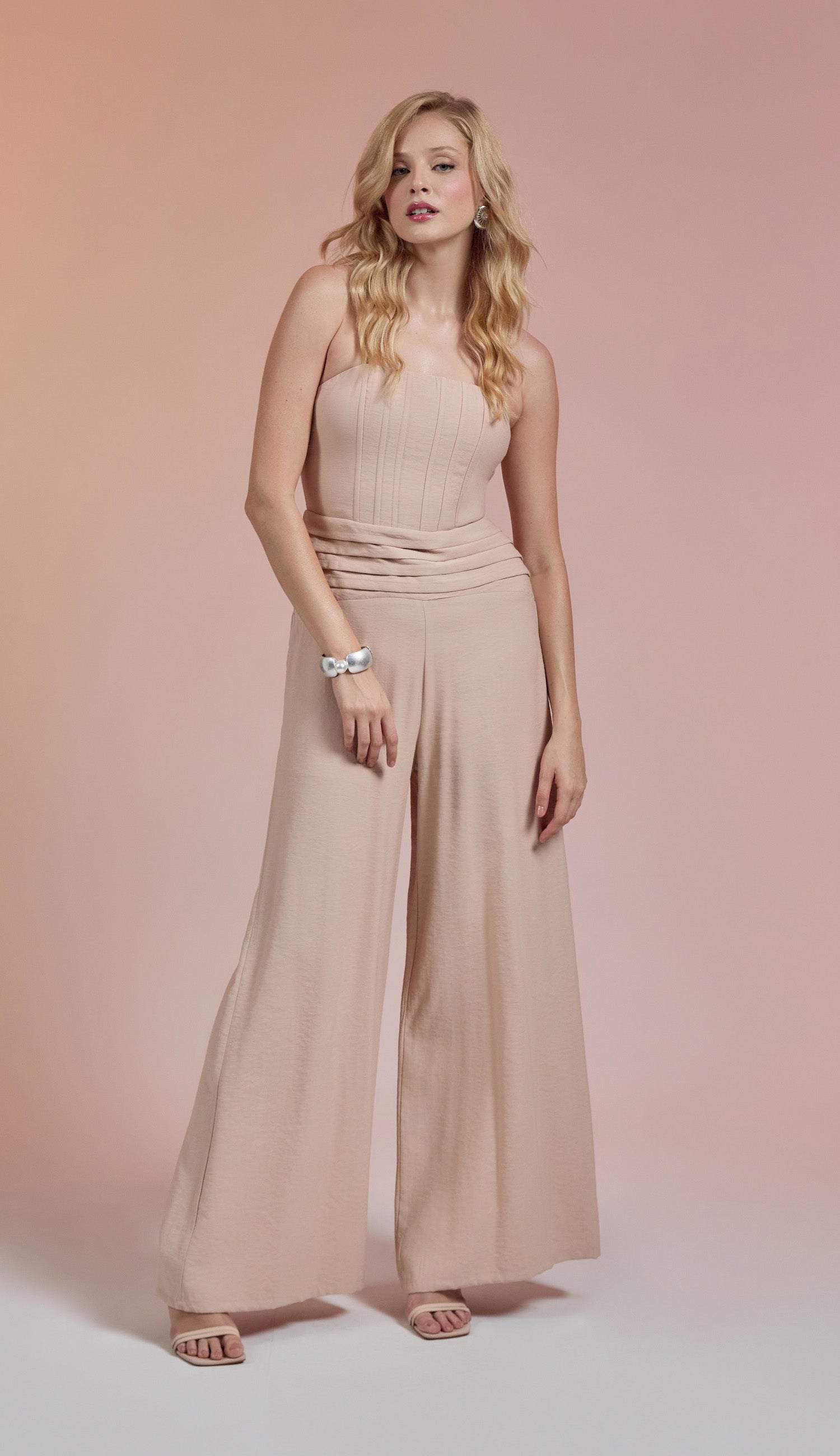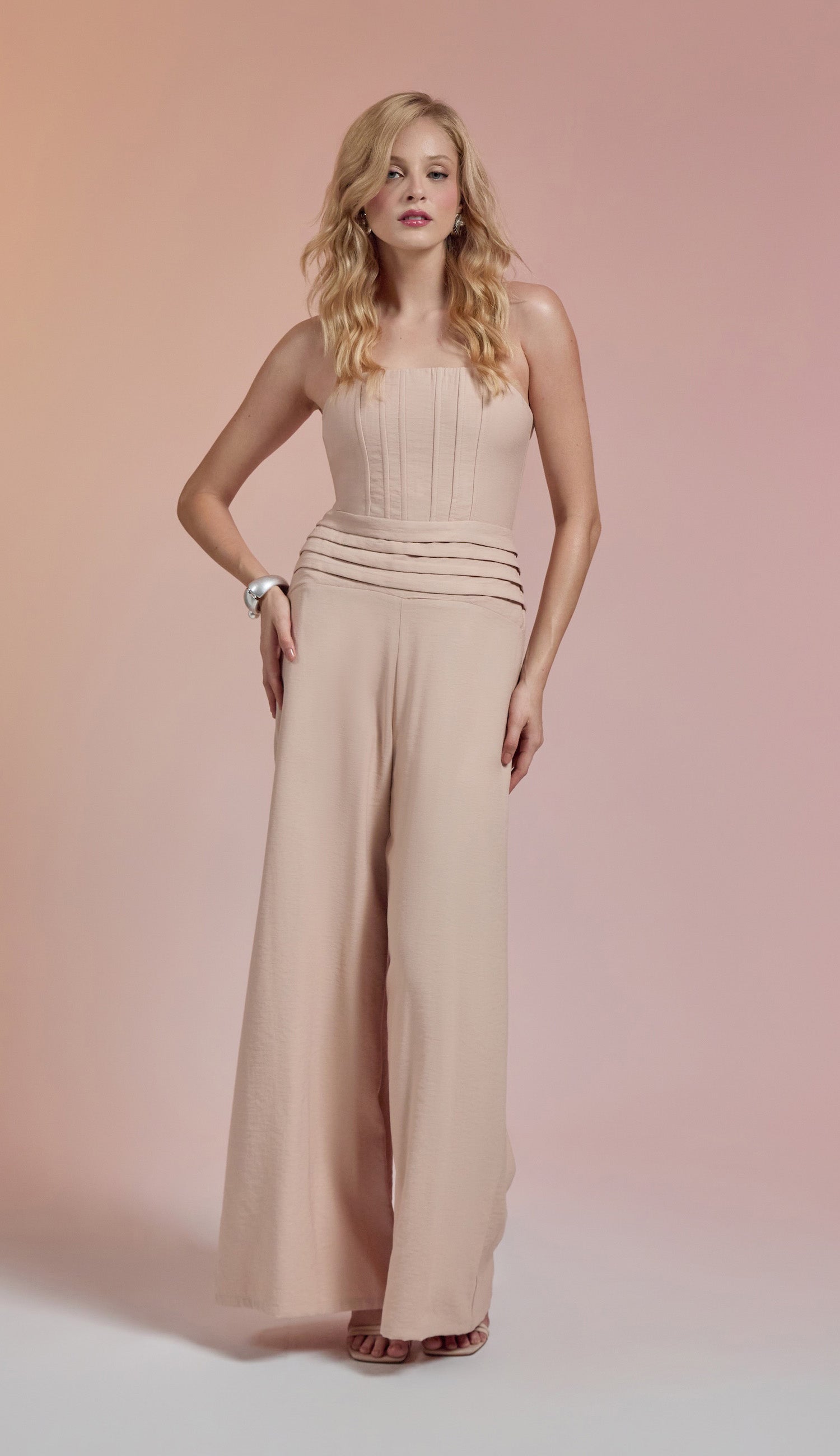 Macacão pantalona com forro, confeccionado em sarja de alfaiataria em viscose twill mais encorpada com aspecto amassadinho. Possui decote reto com elástico franzido; barbatanas frontais no busto, que estruturam a peça; pala larga na cintura com detalhe pregueado; alcinhas reguláveis e fechamento traseiro por zíper de metal.