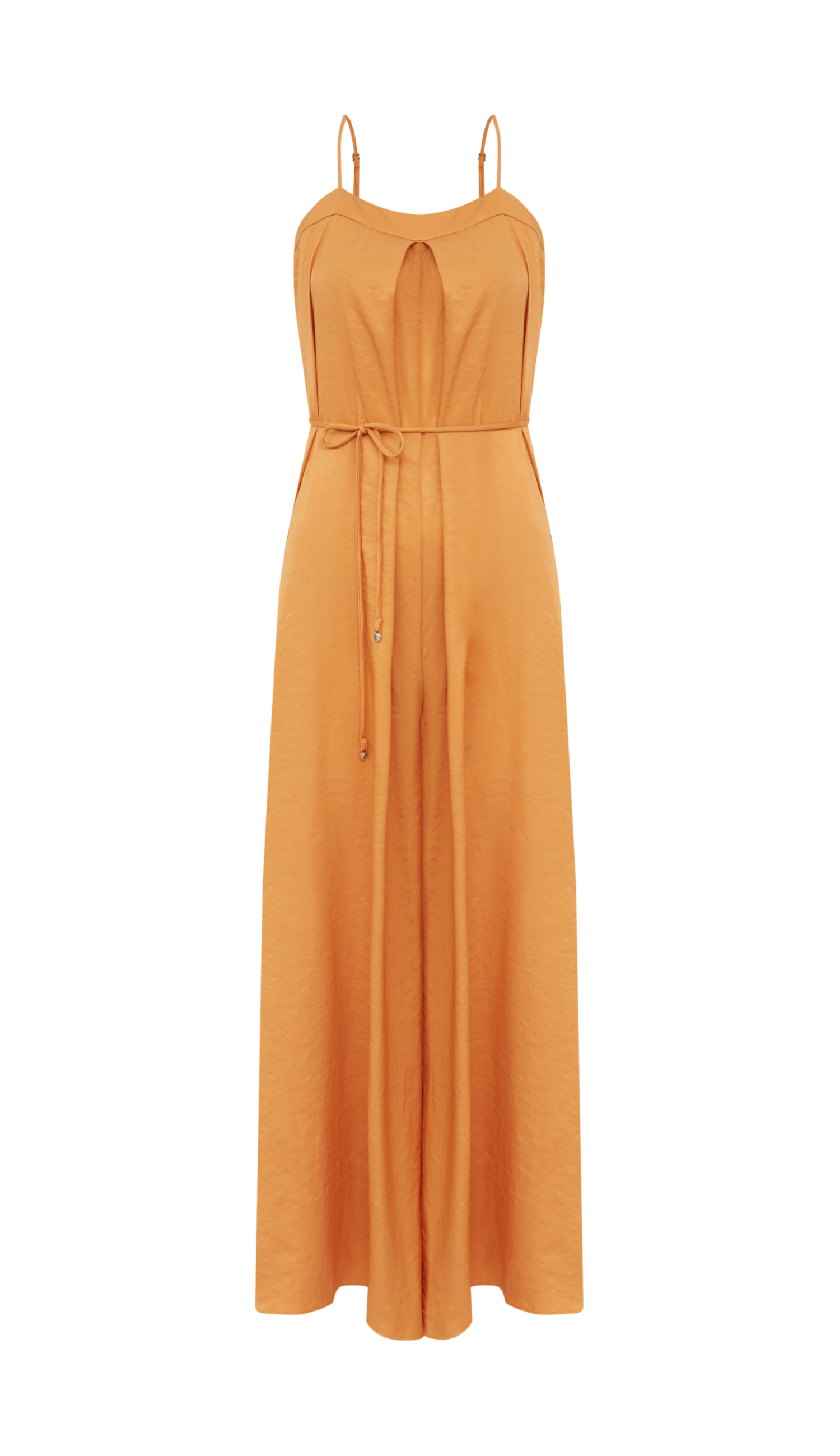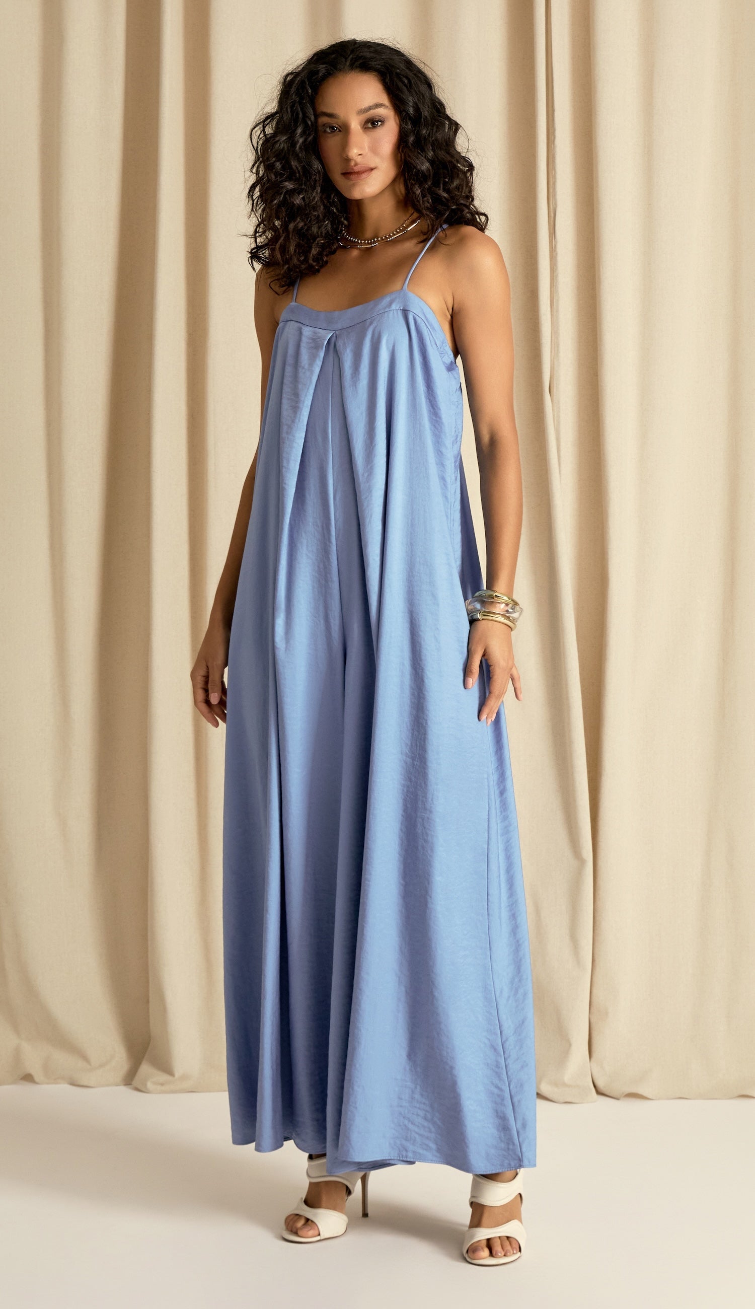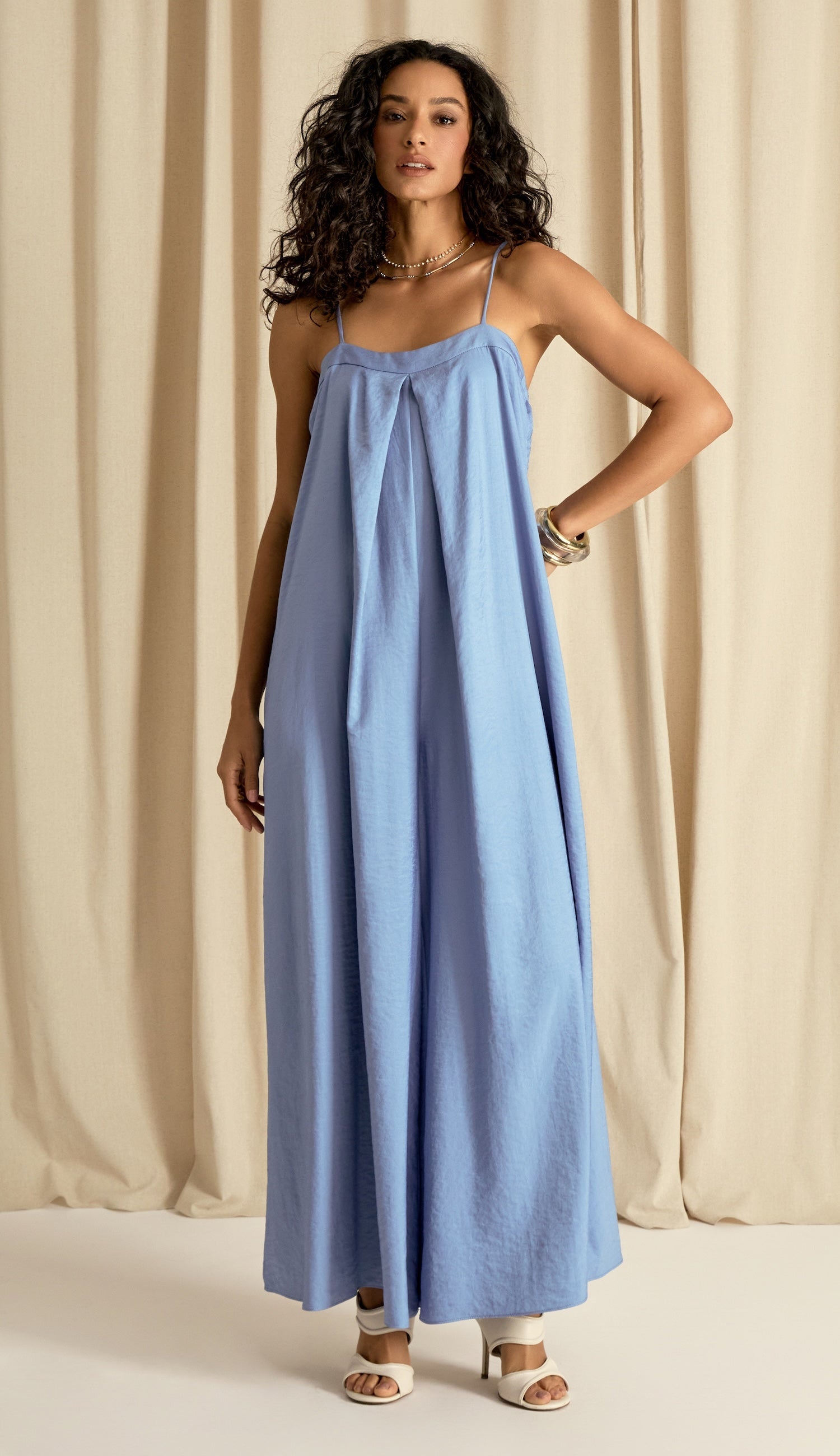 Macacão confeccionado em alfaiataria acetinada com efeito amassadinho. Possui modelagem ampla, que dá movimento ao look; alças finas e reguláveis, decote princesa com pala e prega que cria um volume super elegante à peça e tira comprida embutida nas costas para ajuste e amarração.