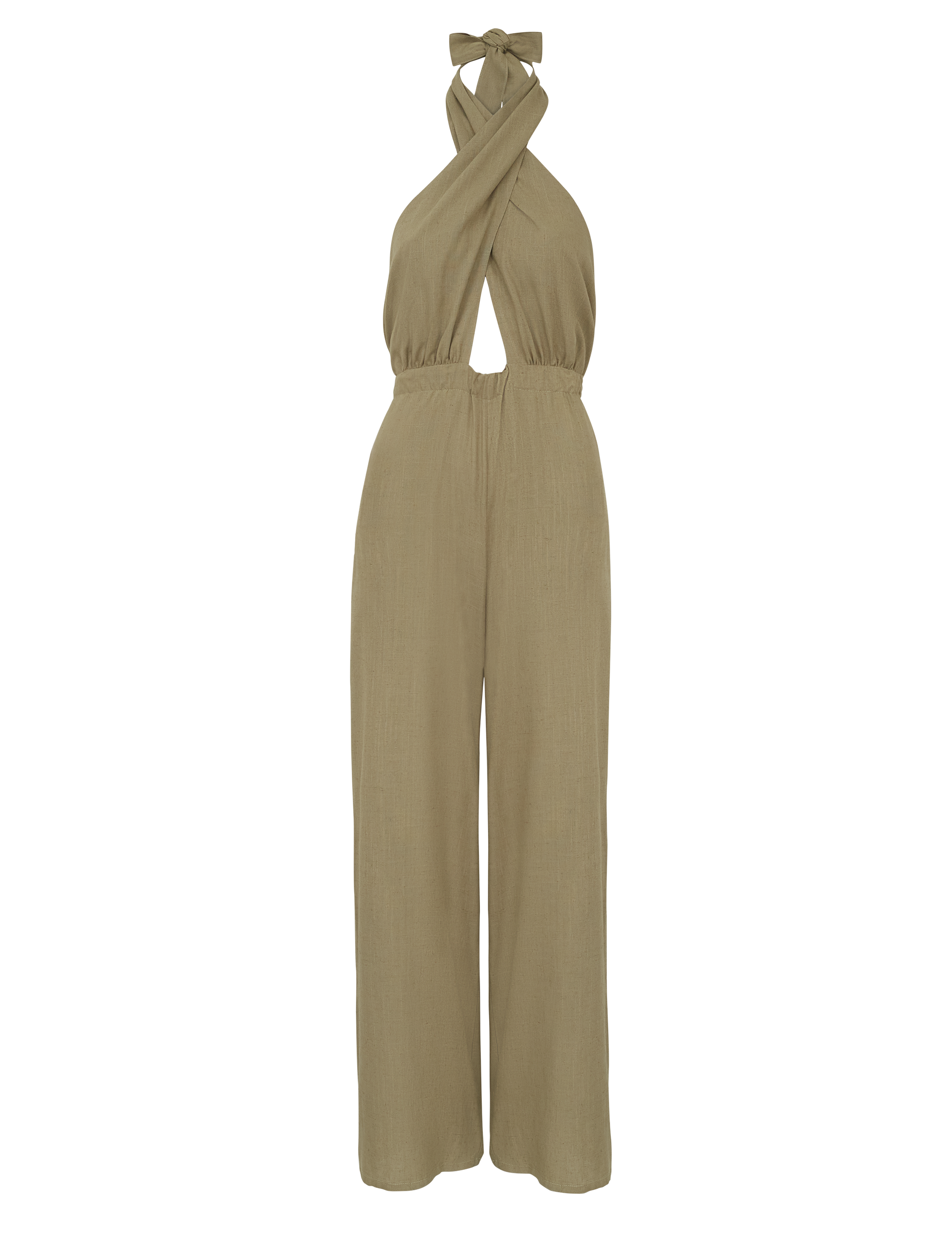 Macacão confeccionado em linho. Possui forro na parte de baixo, tecido duplo no busto para não ficar transparente, modelagem frente única com duas faixas fixas compridas que saem da cintura para amarrar e fechar o decote, permitindo diversos tipos de amarração diferentes; conta com elástico franzido na cintura e fechamento traseiro na calça por zíper invisível.