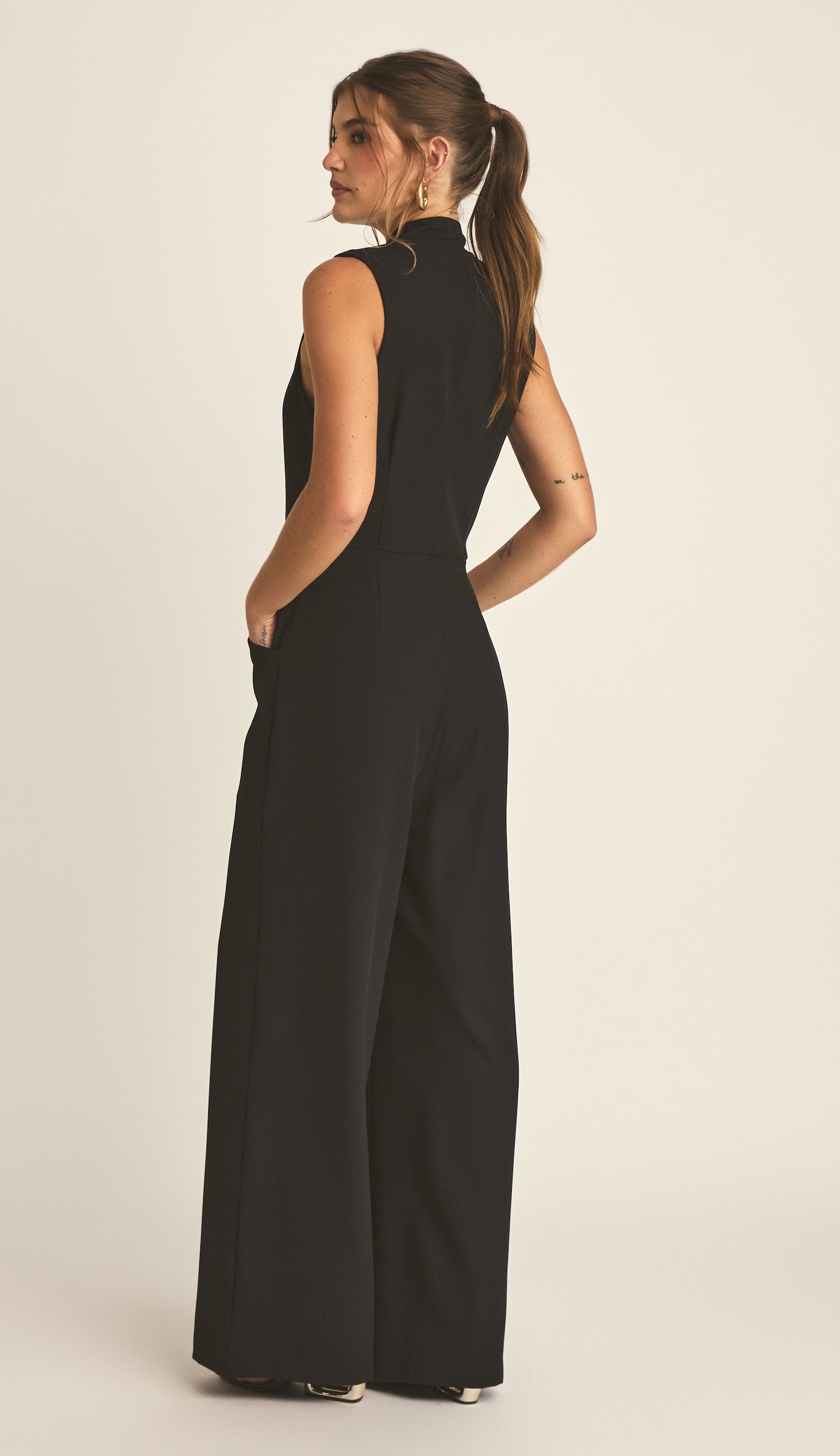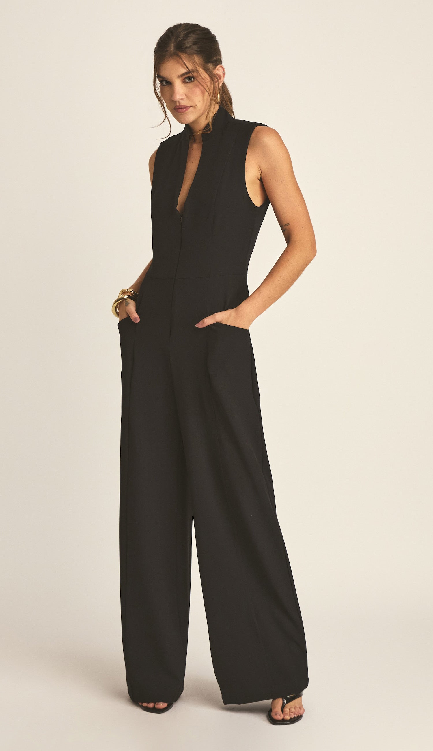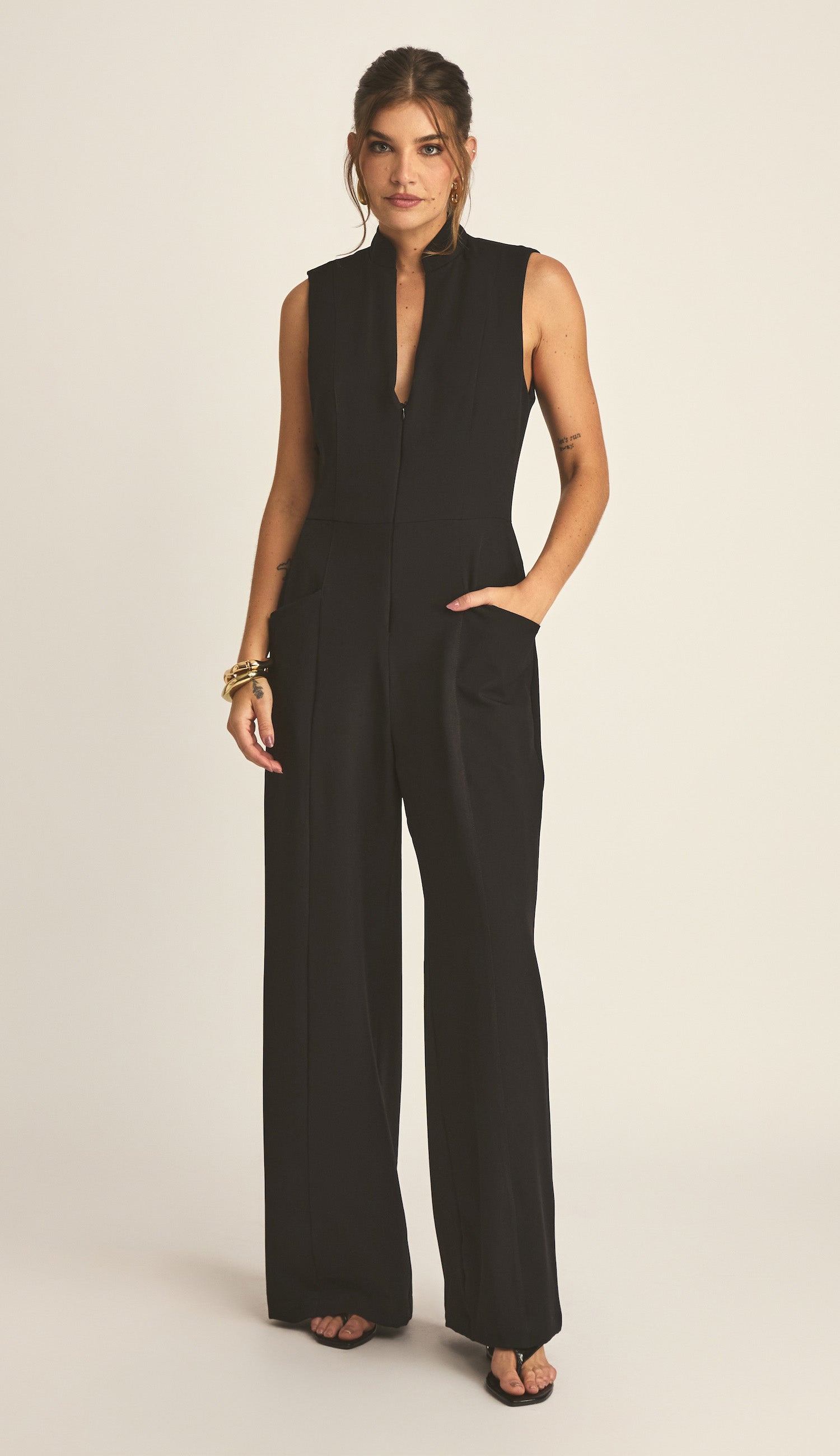 Macacão regata confeccionado em crepe de alfaiataria com forro. Possui gola padre com abertura frontal em V, fechamento frontal por zíper invisível, ombreiras que estruturam a peça, modelagem ajustada no corpo e soltinha nas pernas, com as barras mais amplas; recortes e vincos frontais que desenham a silhueta, bolsões laterais e acompanha faixa solta para amarrar na cintura.