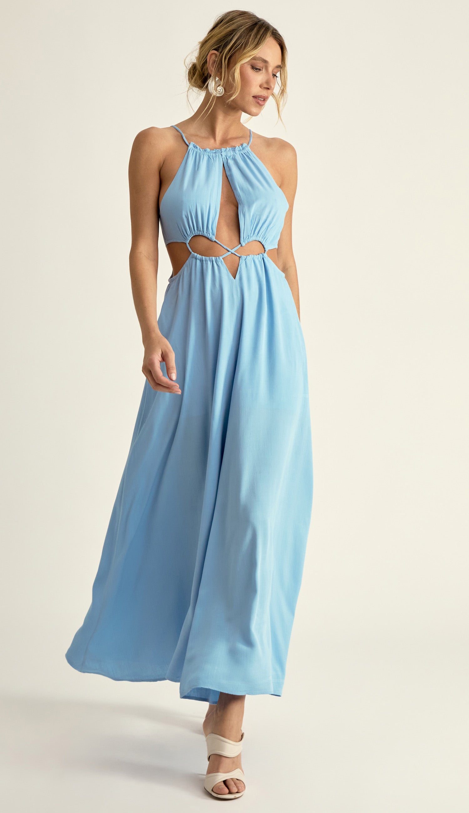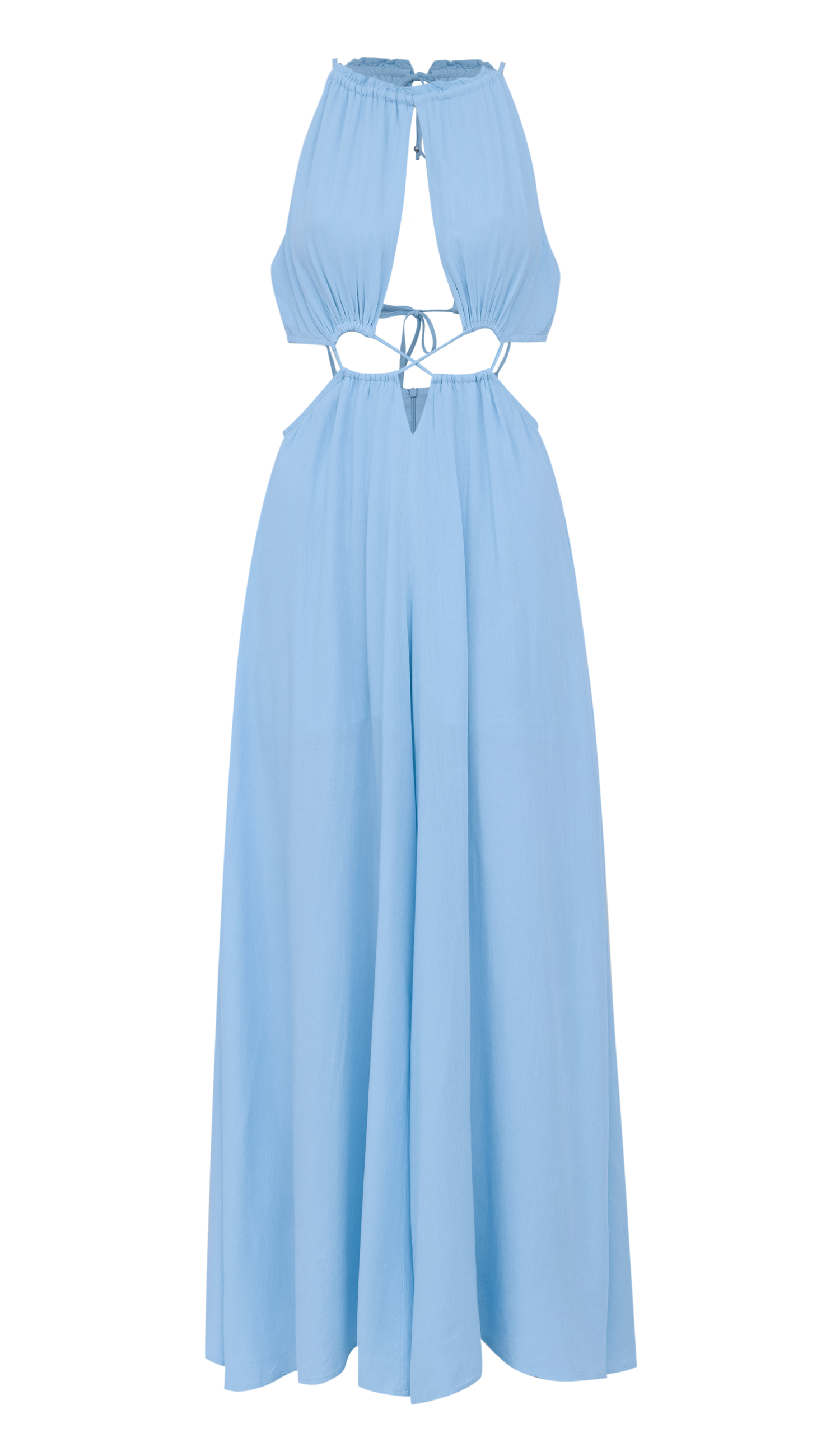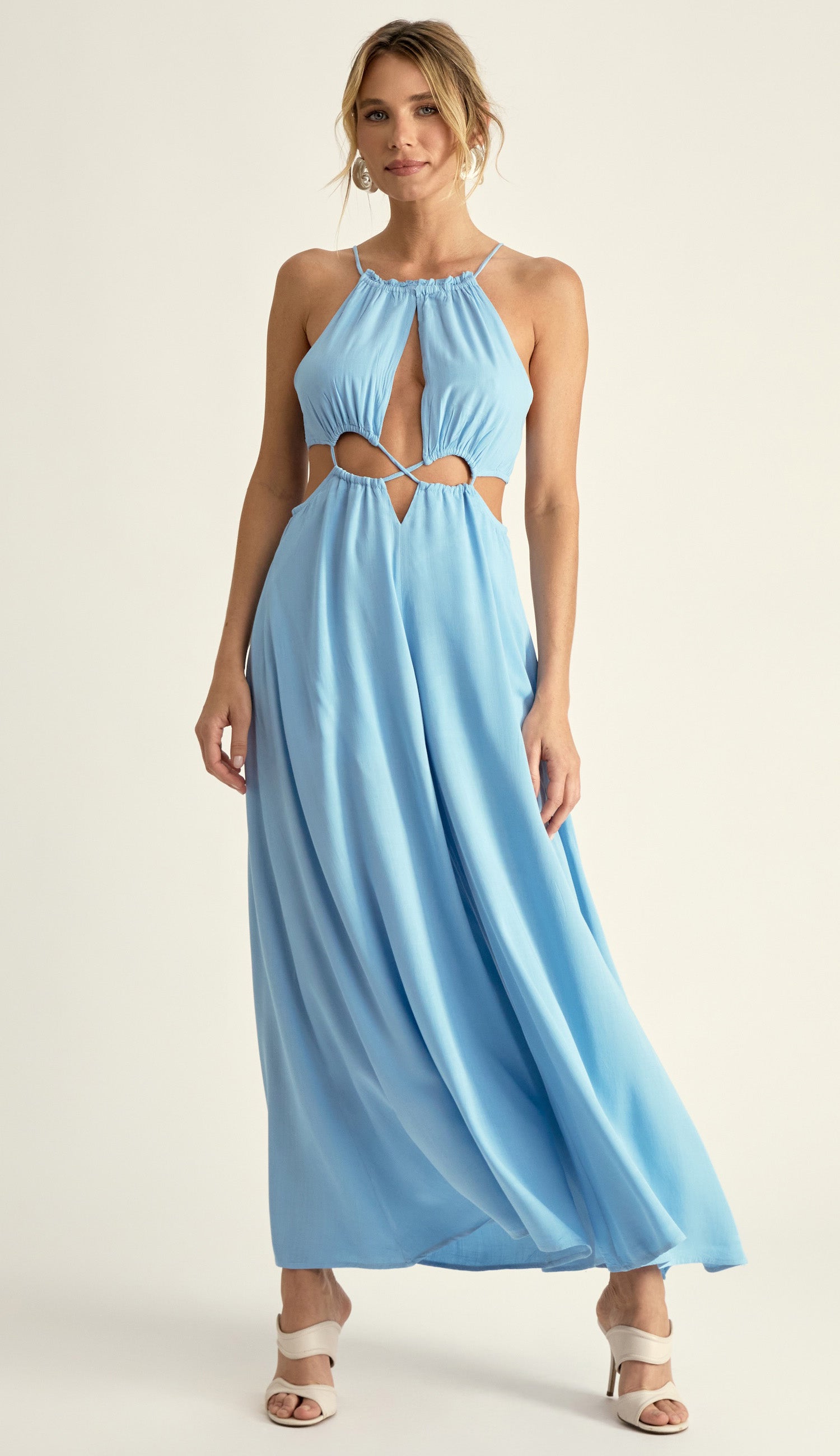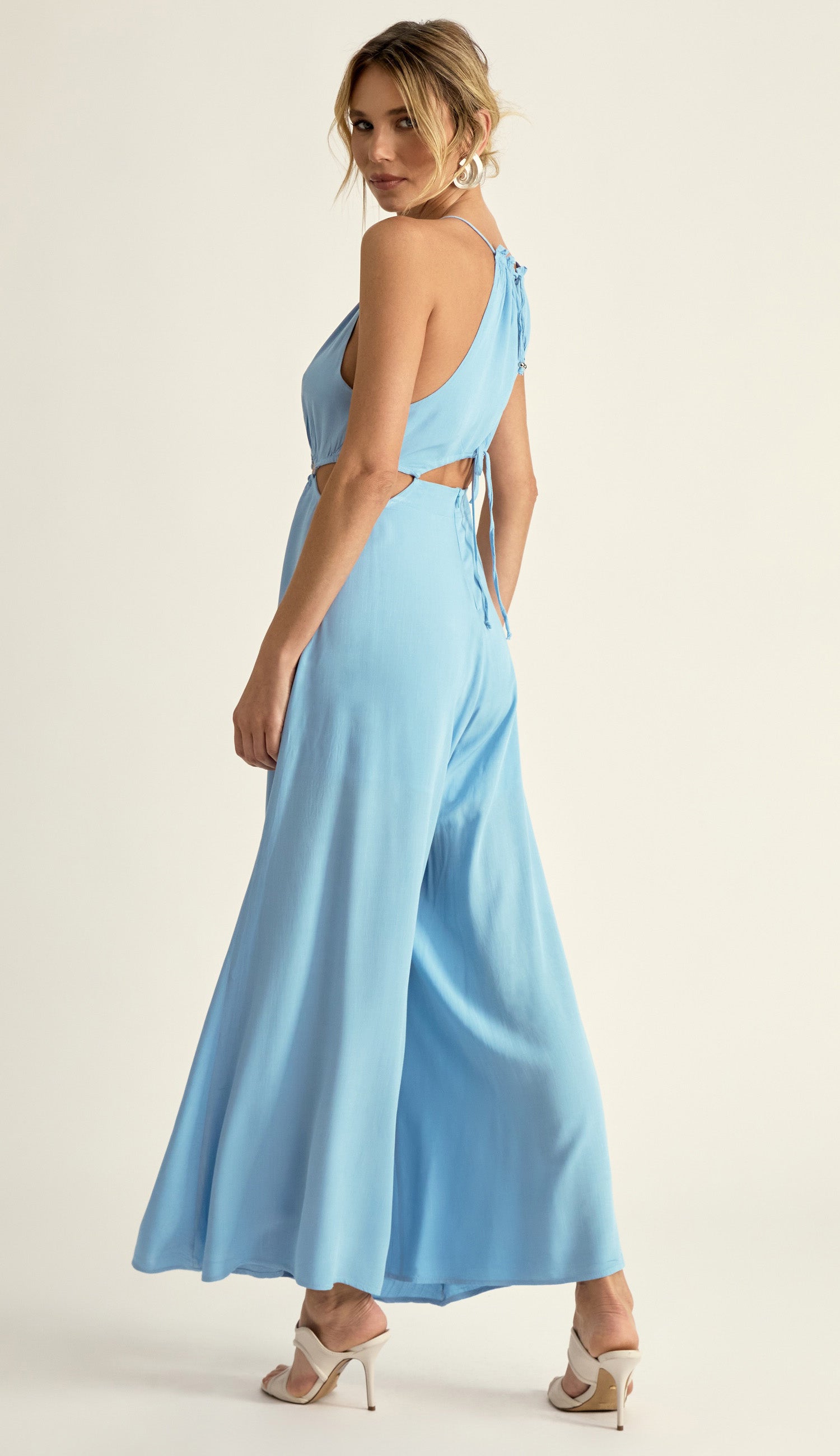 Macacão confeccionado em viscose com forro. Possui decote alto com franzidinho e vazado, aberturas na cintura com leve franzido por conta do elástico. A calça é pantalona trazendo movimento e leveza ao look. Nas costas o fechamento é por zíper invisível na calça e amarração por tirinhas na blusa.