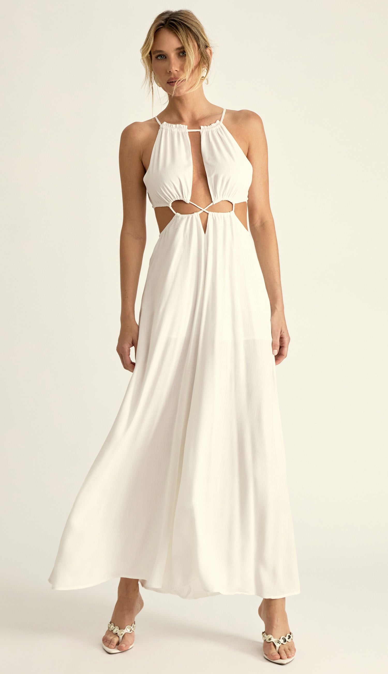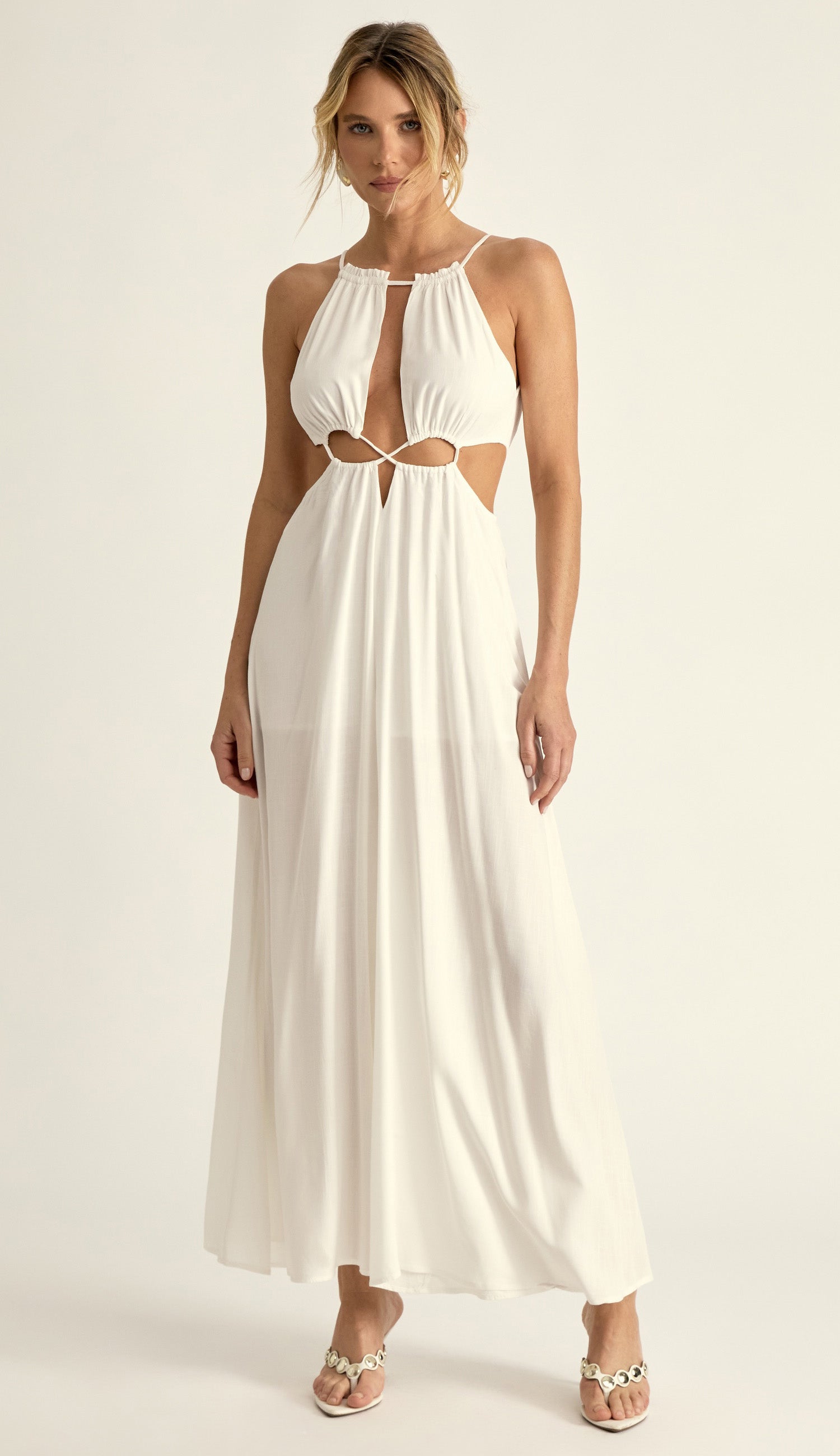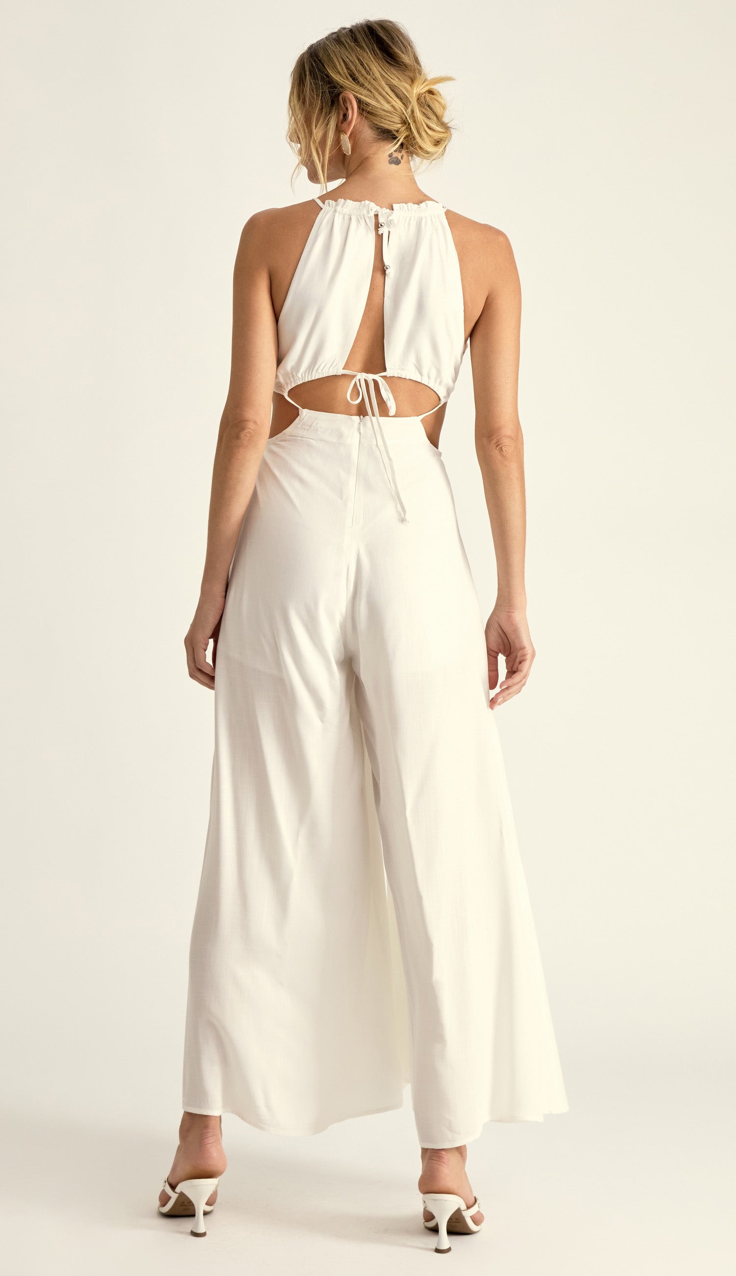 Macacão confeccionado em viscose com forro. Possui decote alto com franzidinho e vazado, aberturas na cintura com leve franzido por conta do elástico. A calça é pantalona trazendo movimento e leveza ao look. Nas costas o fechamento é por zíper invisível na calça e amarração por tirinhas na blusa.