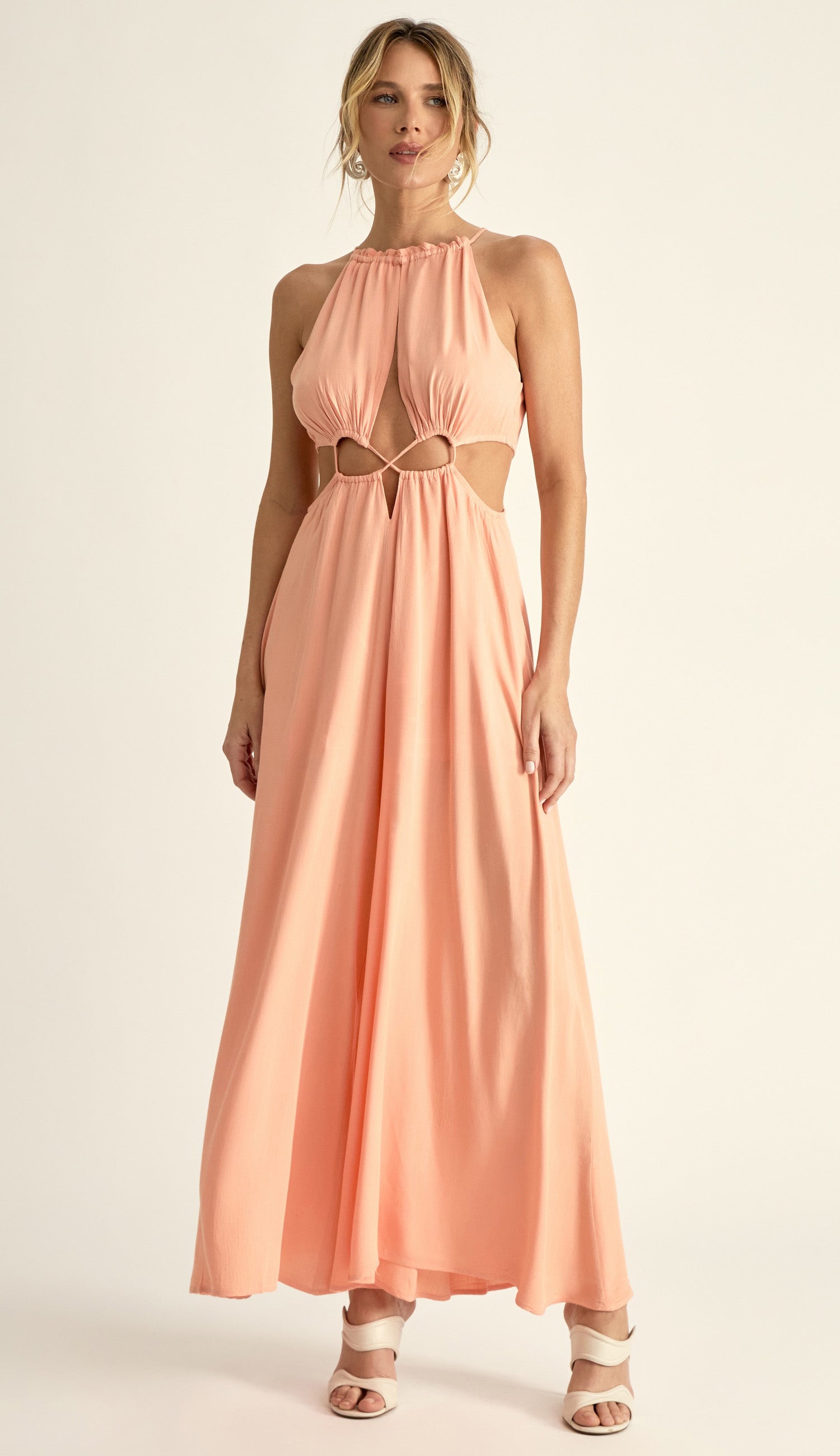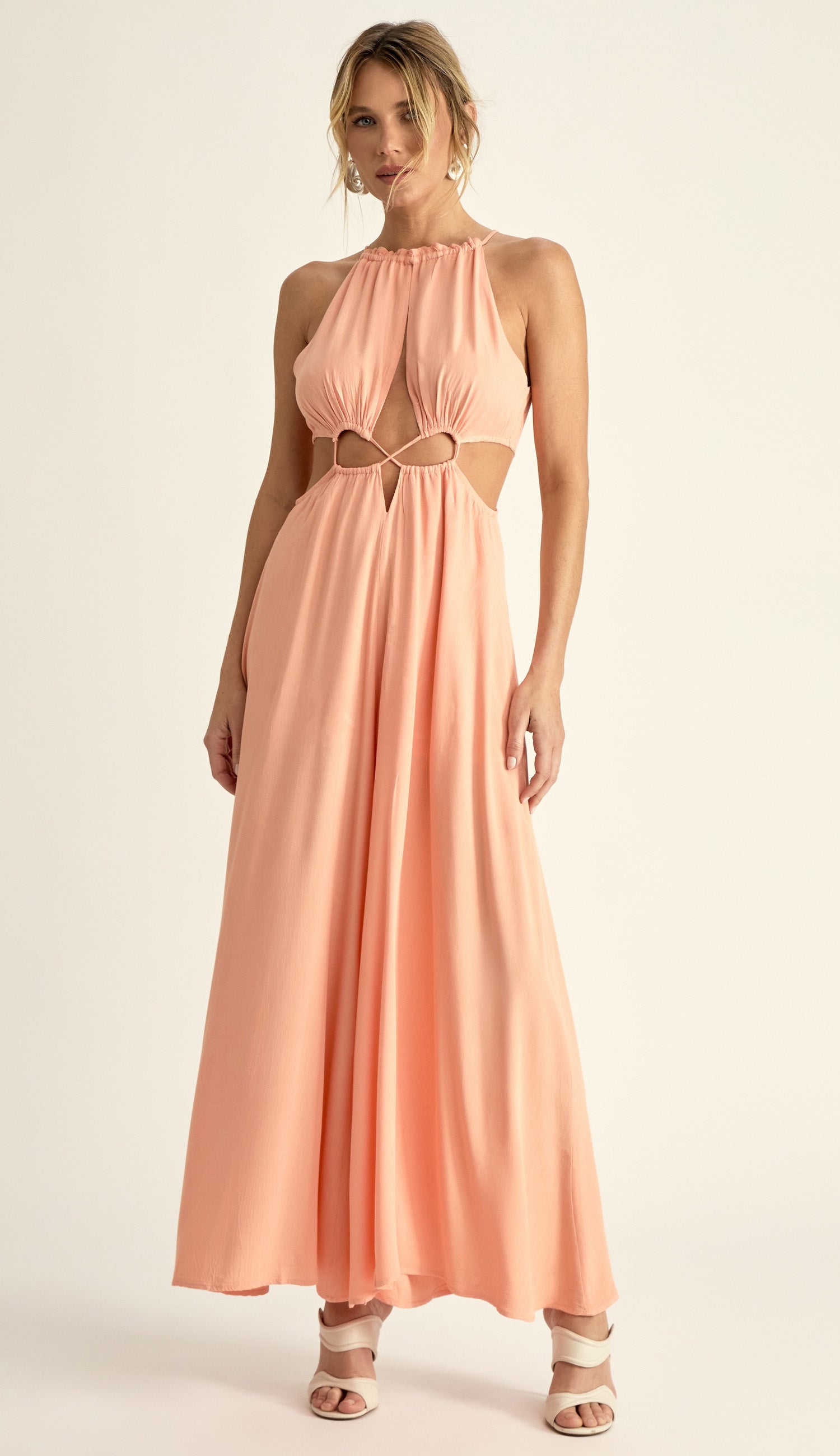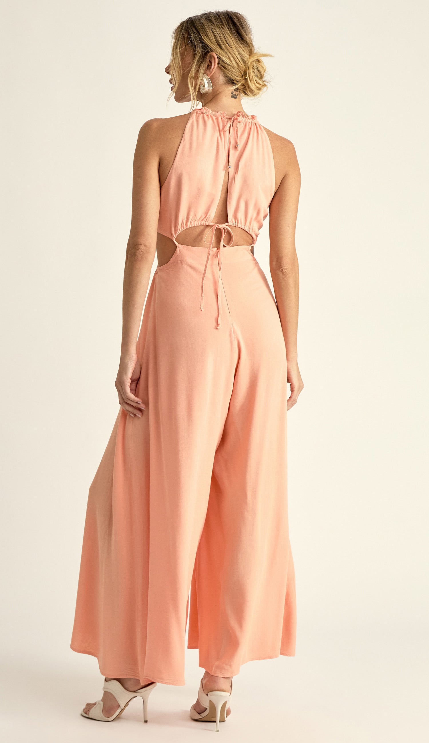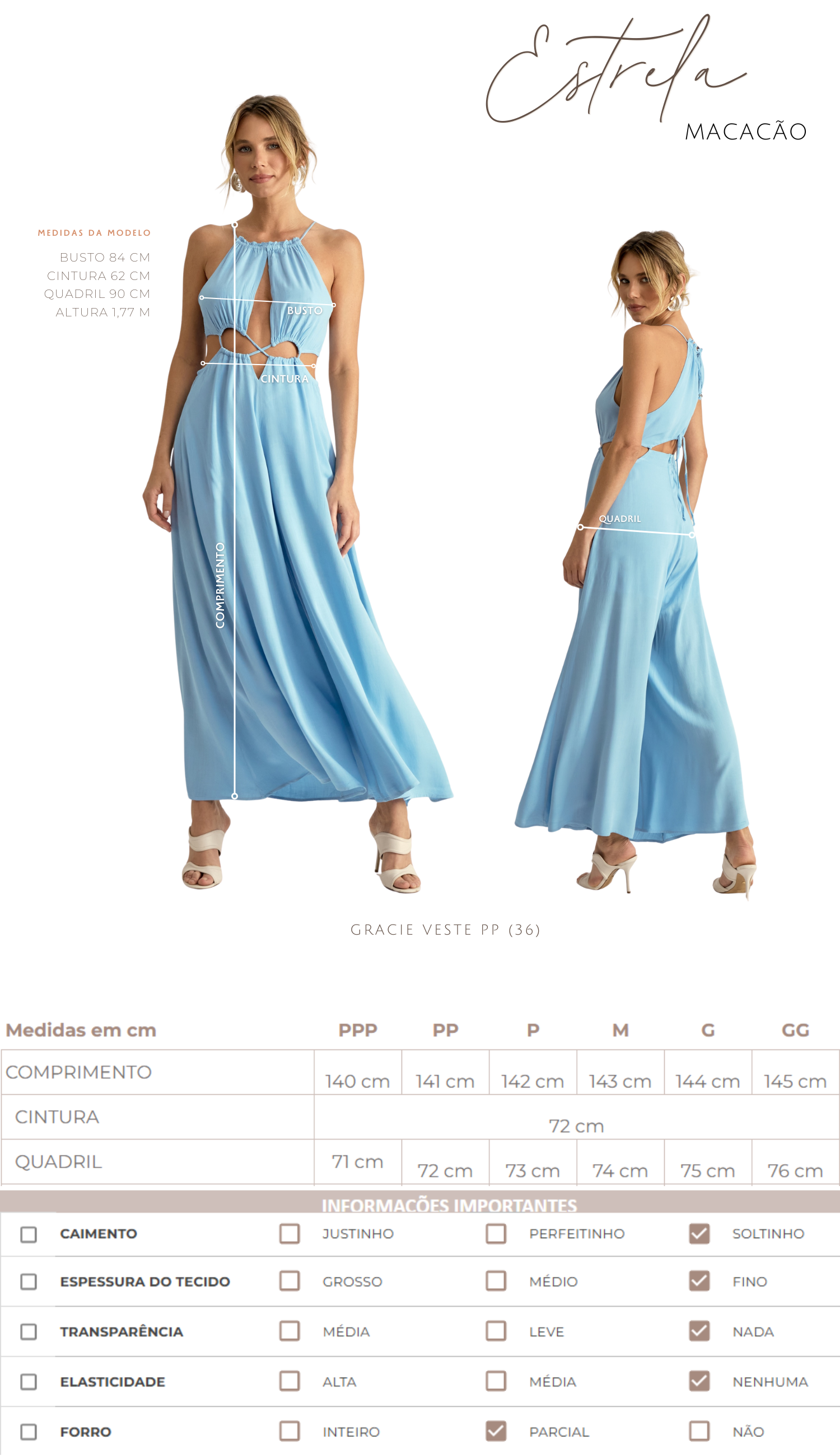 Macacão confeccionado em viscose com forro. Possui decote alto com franzidinho e vazado, aberturas na cintura com leve franzido por conta do elástico. A calça é pantalona trazendo movimento e leveza ao look. Nas costas o fechamento é por zíper invisível na calça e amarração por tirinhas na blusa.
