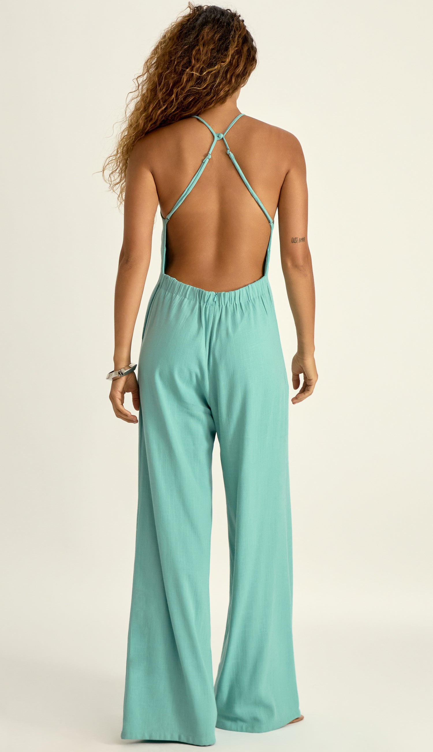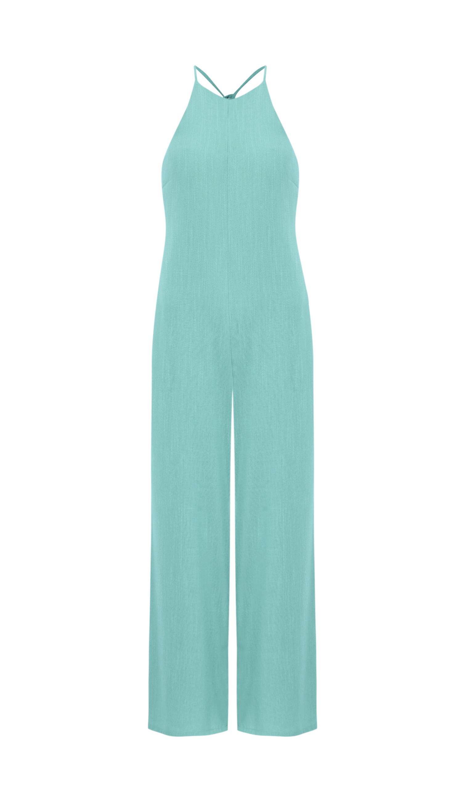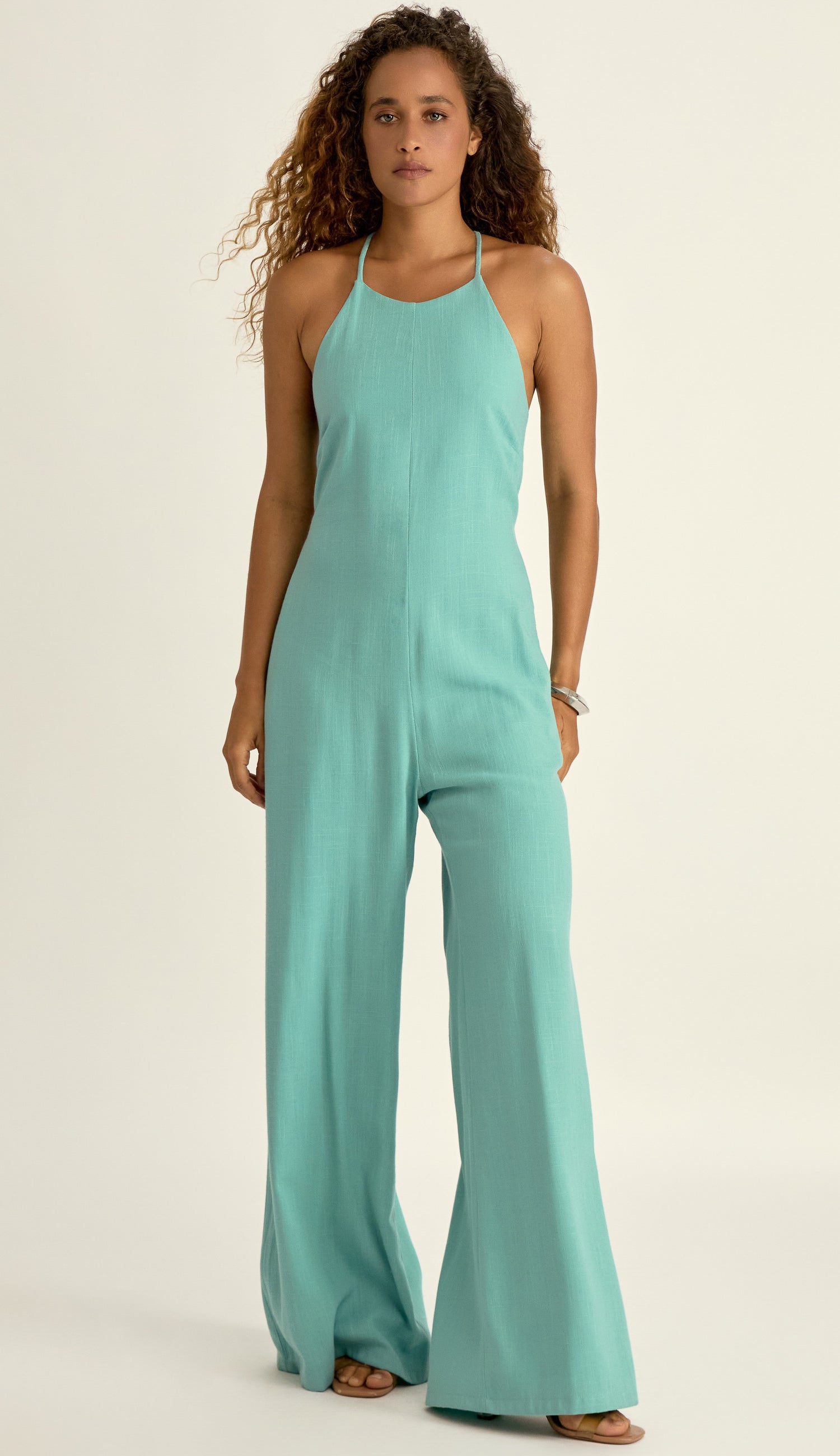 Macacão confeccionado em linho texturizado com forro na peça inteira. Possui decote halter, alcinhas reguláveis com botãozinho esmaltado para cruzar as alças nas costas criando um lindo decote profundo nessa região, deixando as costas nuas; pernas soltas estilo wide, bolsos laterais, recorte frontal no centro que alonga a silhueta e elástico franzido na parte traseira do cós com fechamento por zíper invisível. Por sua composição mista do tecido, possui a aparência e toque elegantes do linho, mas com a vantagem de não amassar com tanta facilidade; tornando a peça muito prática e confortável.