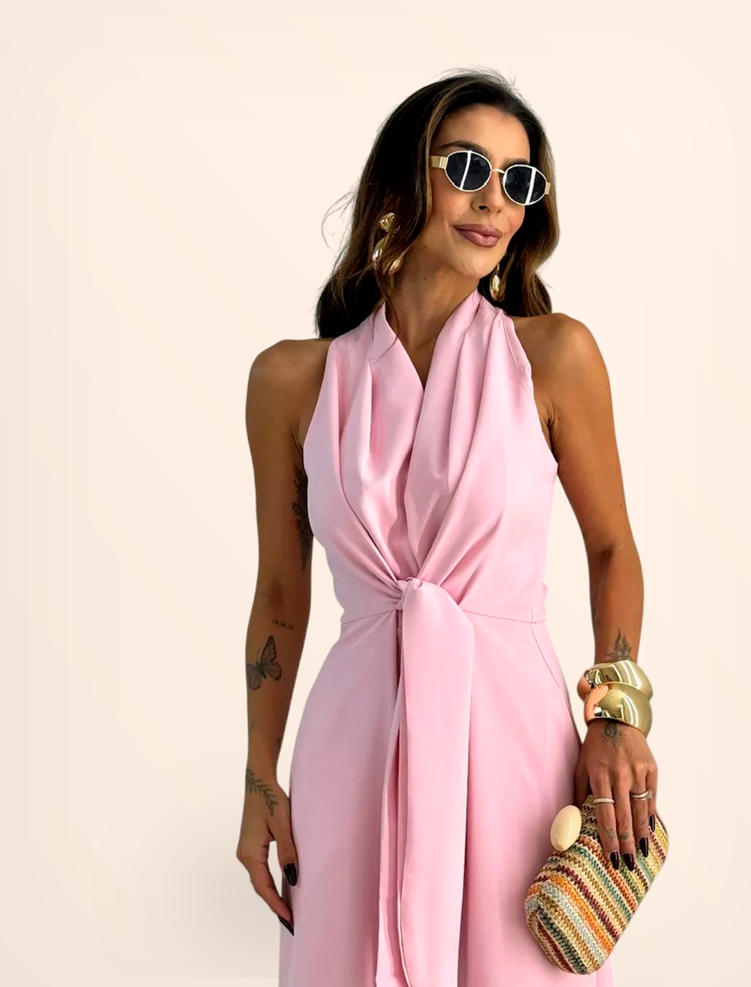 O charme principal reside no seu decote V profundo com amarração transpassada frontal, criando um efeito de nó ou laço na cintura que define e valoriza a região, adicionando um toque de feminilidade e estilo. A parte superior é cavada (regata).