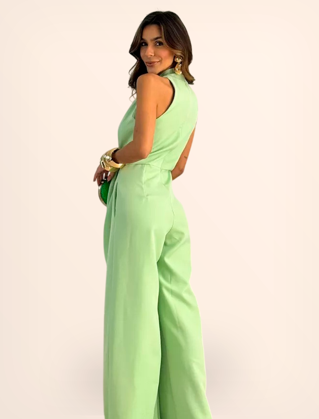 Para garantir a funcionalidade sem comprometer a elegância, o macacão possui bolsos laterais discretos e práticos. O fechamento em zíper invisível nas costas assegura um acabamento limpo e refinado.