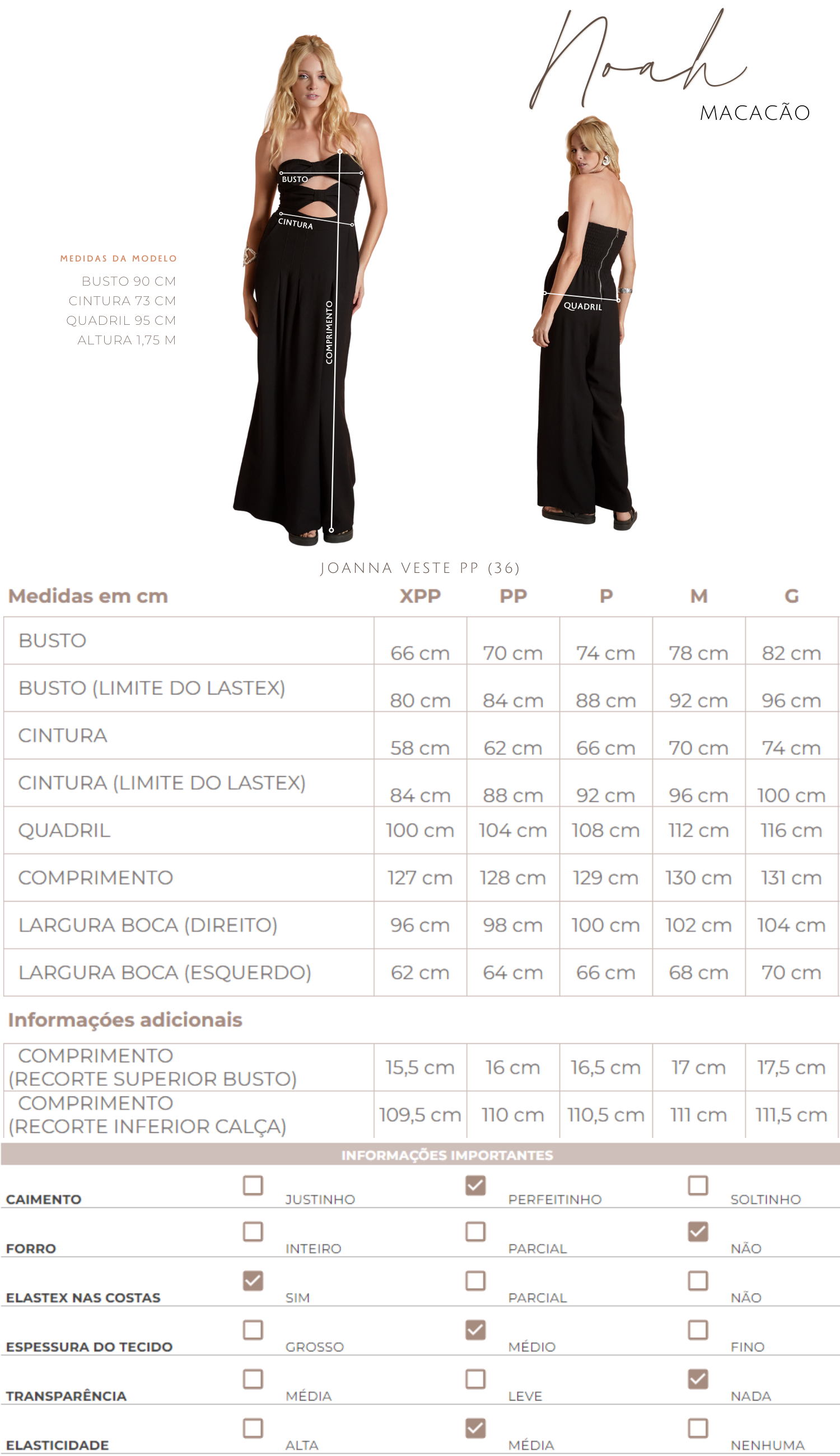 Macacão sem mangas confeccionado em sarja de alfaiataria em viscose mais encorpada. Possui decote coração com elástico; recortes vazados frontais, abaixo do busto e na cintura, com detalhe parecendo dois laços; pernas soltas estilo pantalona com pregas frontais com sobreposição de tecido partindo de uma delas; bolsos laterais; lastex franzido nas costas para melhor ajuste ao corpo e fechamento traseiro por zíper de metal com pingente que tem o detalhe da conchinha da Laguna gravada.