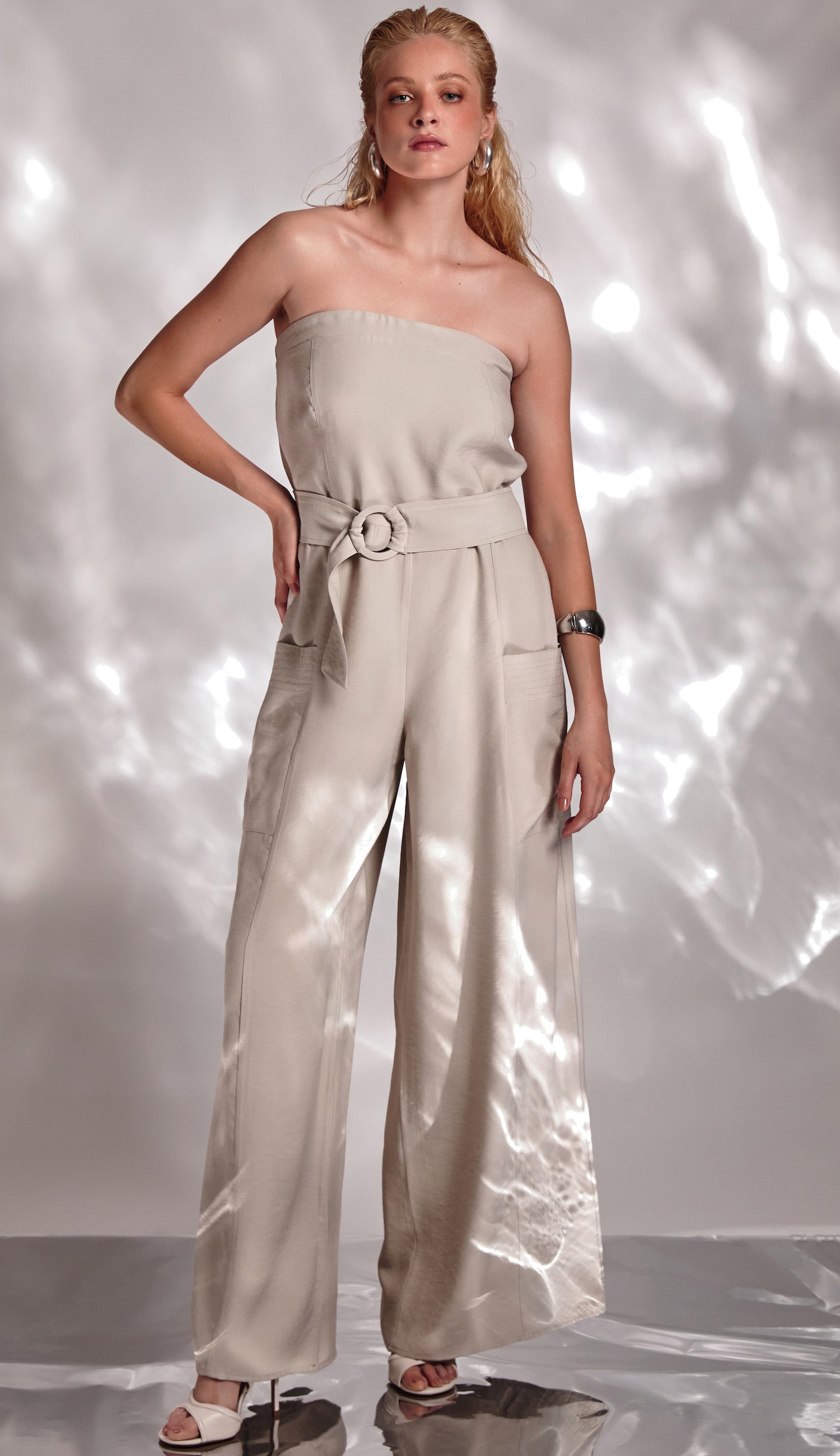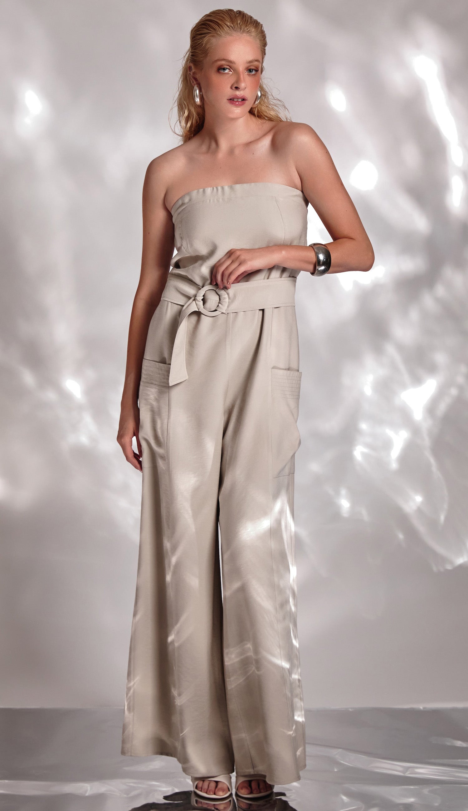 Macacão sem mangas confeccionado em sarja de alfaiataria em viscose mais encorpada. Possui decote reto com silicone interno para maior segurança, elástico mais grosso nas costas para melhor ajuste ao corpo, modelagem soltinha, recortes que modelam a peça, bolsos laterais amplos nas pernas com detalhe pespontado, recortes em riscas frontais que alongam a silhueta e fechamento traseiro por zíper de metal com pingente que tem a conchinha da Laguna gravada. Acompanha faixa no mesmo tecido com argola de metal forrada para ajuste da silhueta.