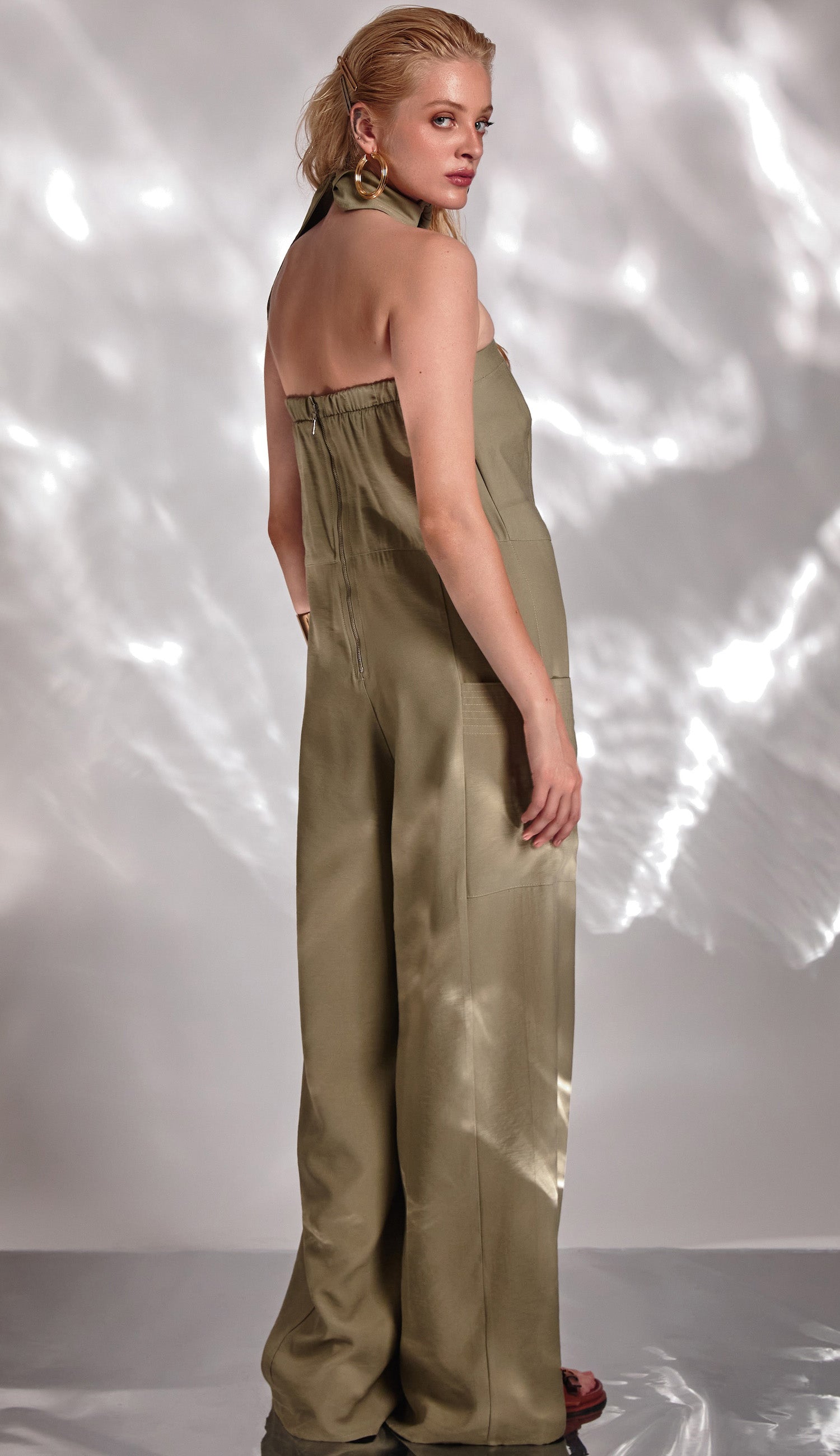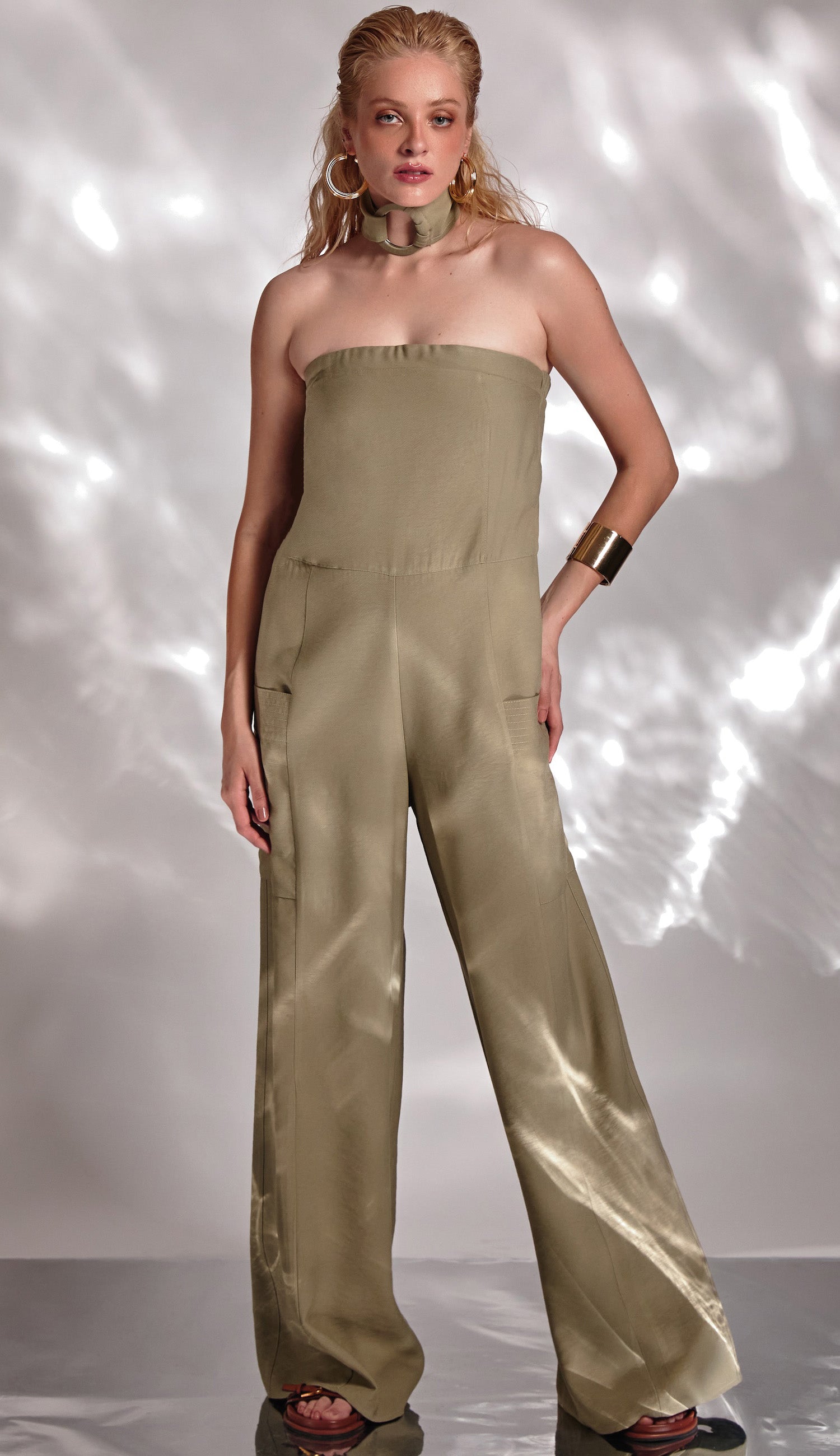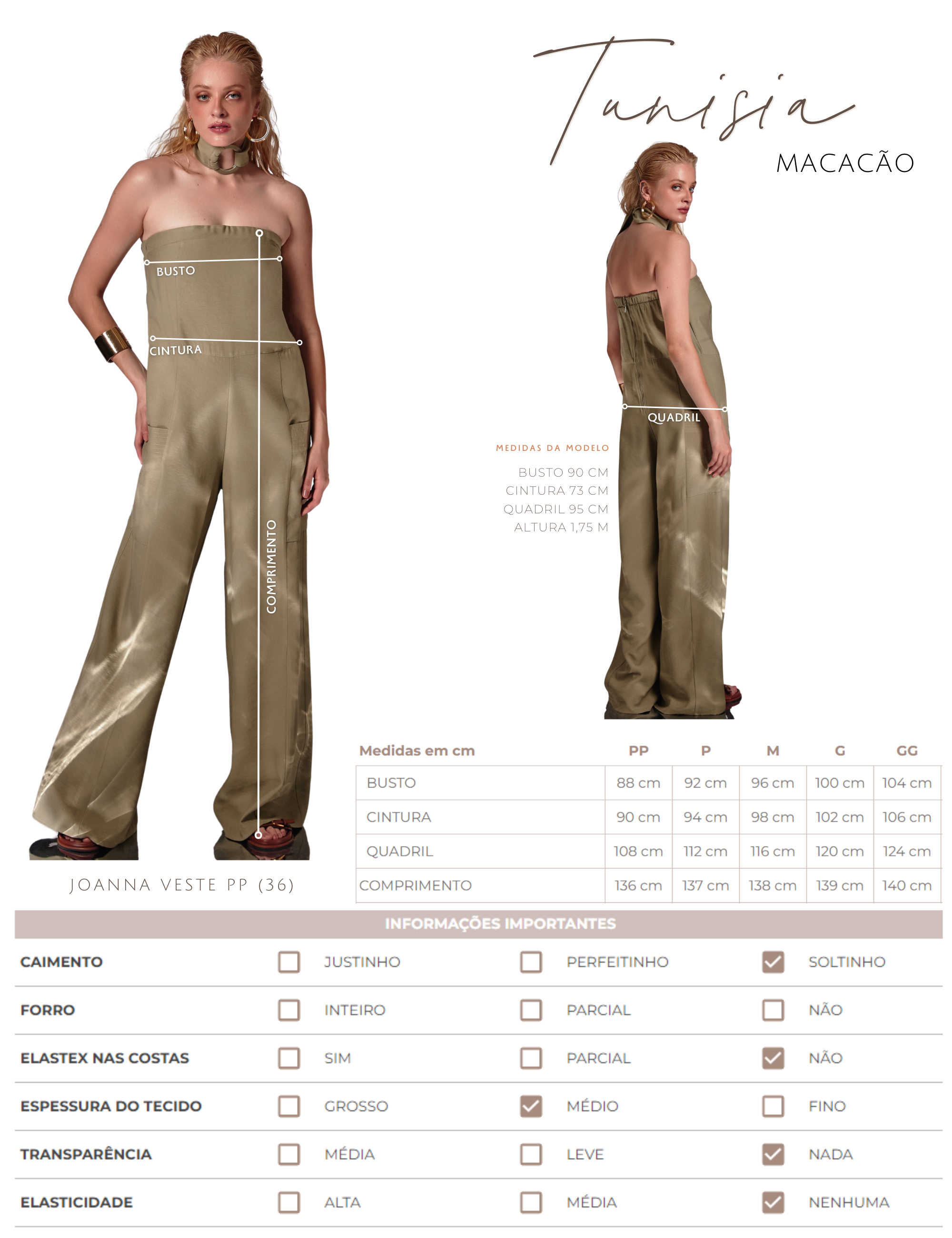Macacão sem mangas confeccionado em sarja de alfaiataria em viscose mais encorpada. Possui decote reto com silicone interno para maior segurança, elástico mais grosso nas costas para melhor ajuste ao corpo, modelagem soltinha, recortes que modelam a peça, bolsos laterais amplos nas pernas com detalhe pespontado, recortes em riscas frontais que alongam a silhueta e fechamento traseiro por zíper de metal com pingente que tem a conchinha da Laguna gravada. Acompanha faixa no mesmo tecido com argola de metal forrada para ajuste da silhueta.