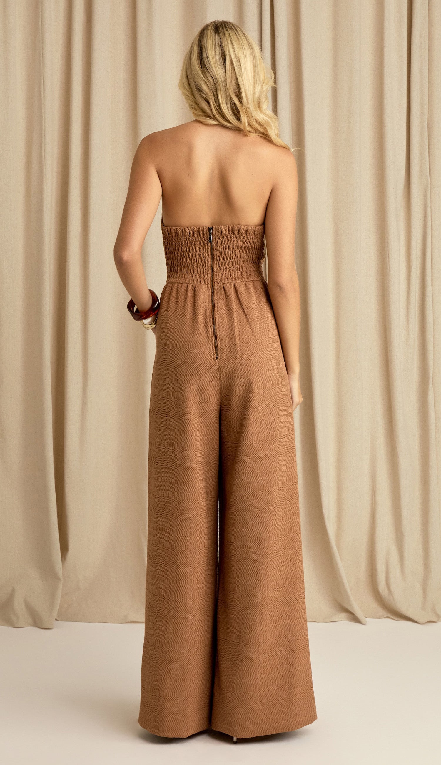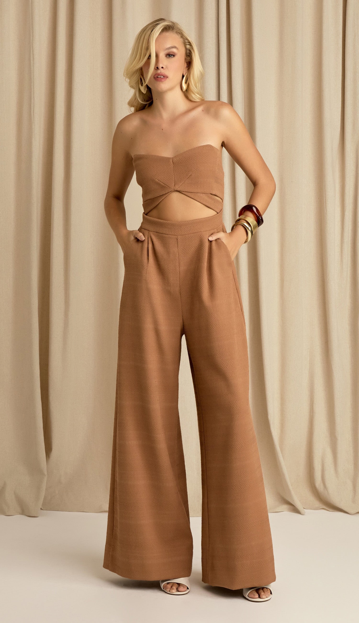 Macacão confeccionado em alfaiataria de algodão maquinetado mais encorpado com textura. Não possui mangas; conta com decote geométrico com pontas e recortes que desenham o busto; silicone interno no decote para maior segurança; pernas soltinhas; recortes vazados frontais na região da cintura seguido de preguinhas; bolsos laterais; lastex franzido nas costas para melhor ajuste e fechamento traseiro por zíper de metal com pingente que tem a conchinha da Laguna gravada.