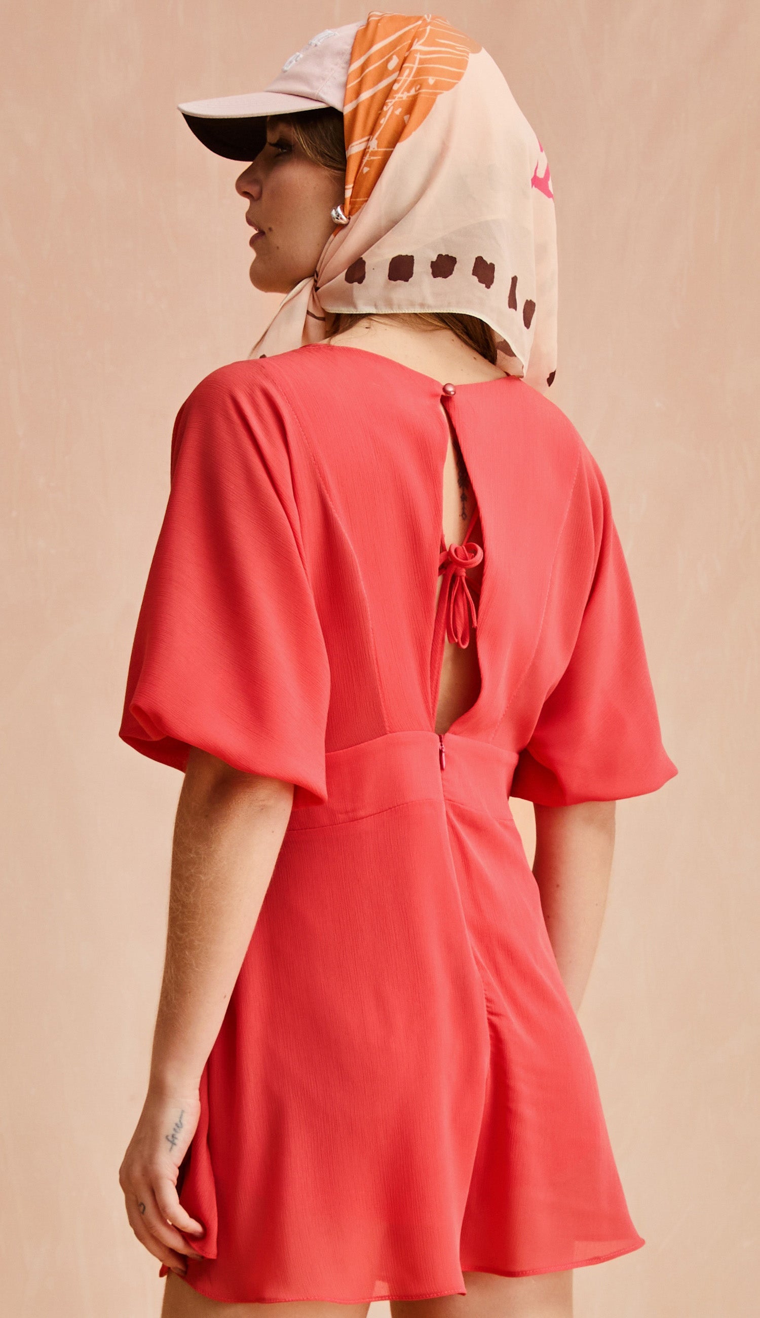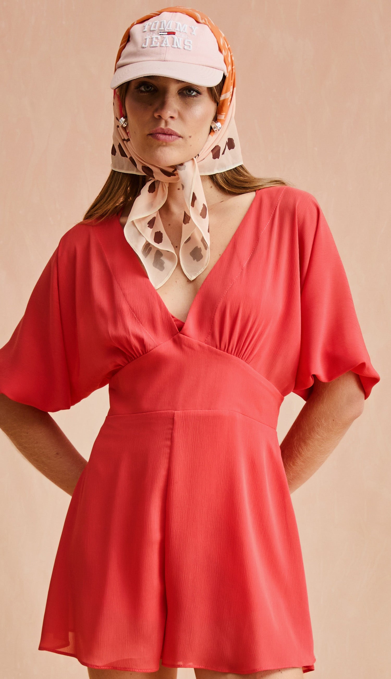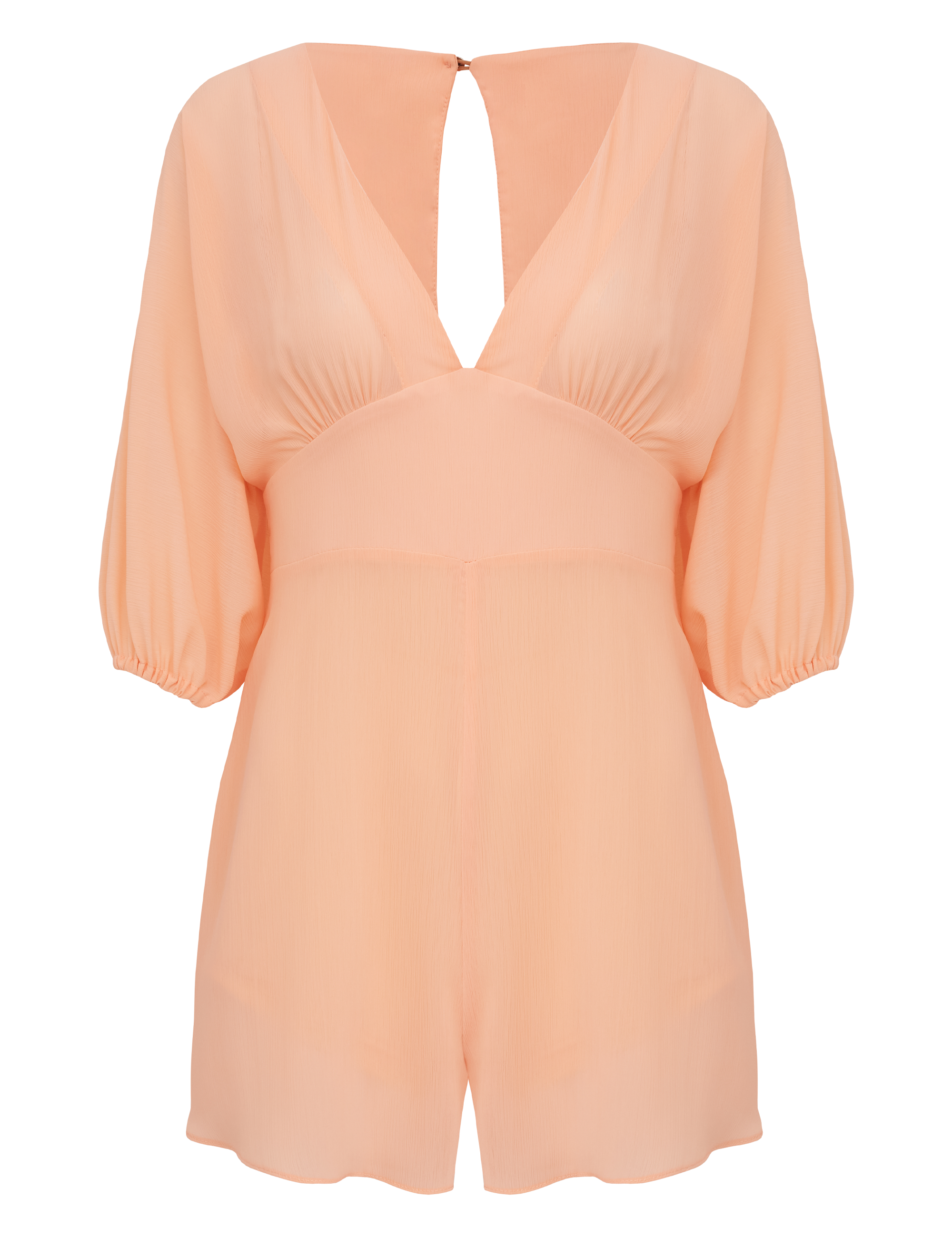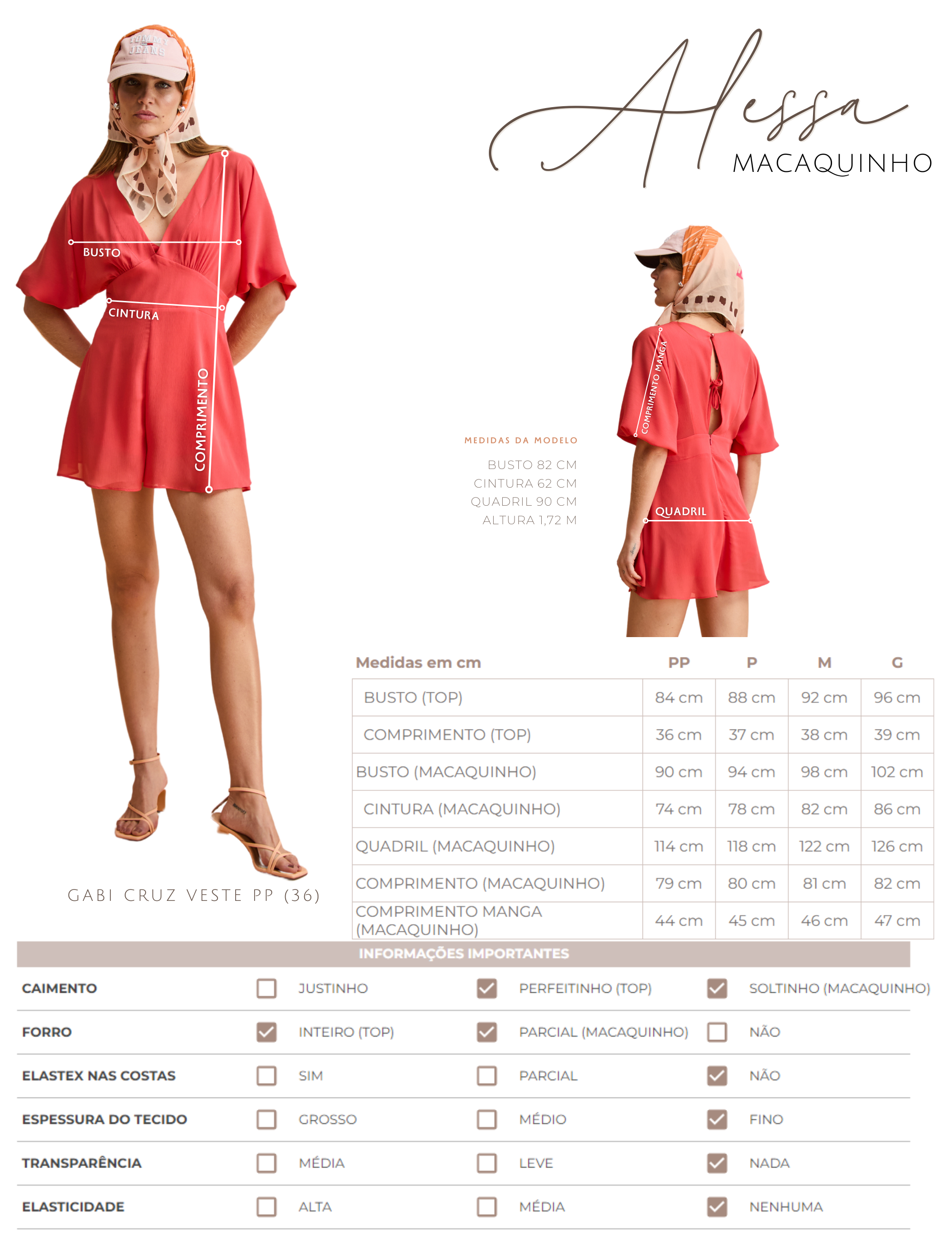 Macaquinho confeccionado em chiffon com forro. Possui decote em "V", mangas 3/4 bufantes com elástico no punho, recorte e pala na cintura, shorts com modelagem soltinha. Acompanha top de amarrar, confeccionado no mesmo tecido com babadinho na frente.