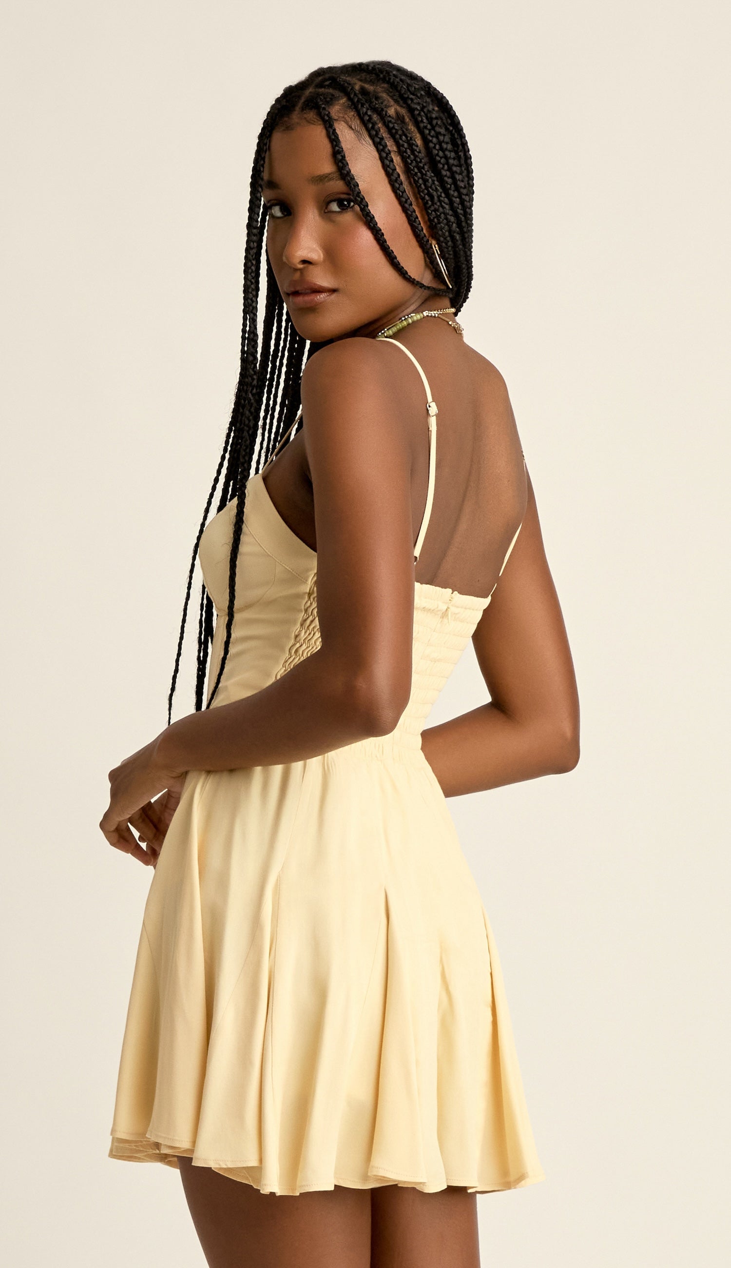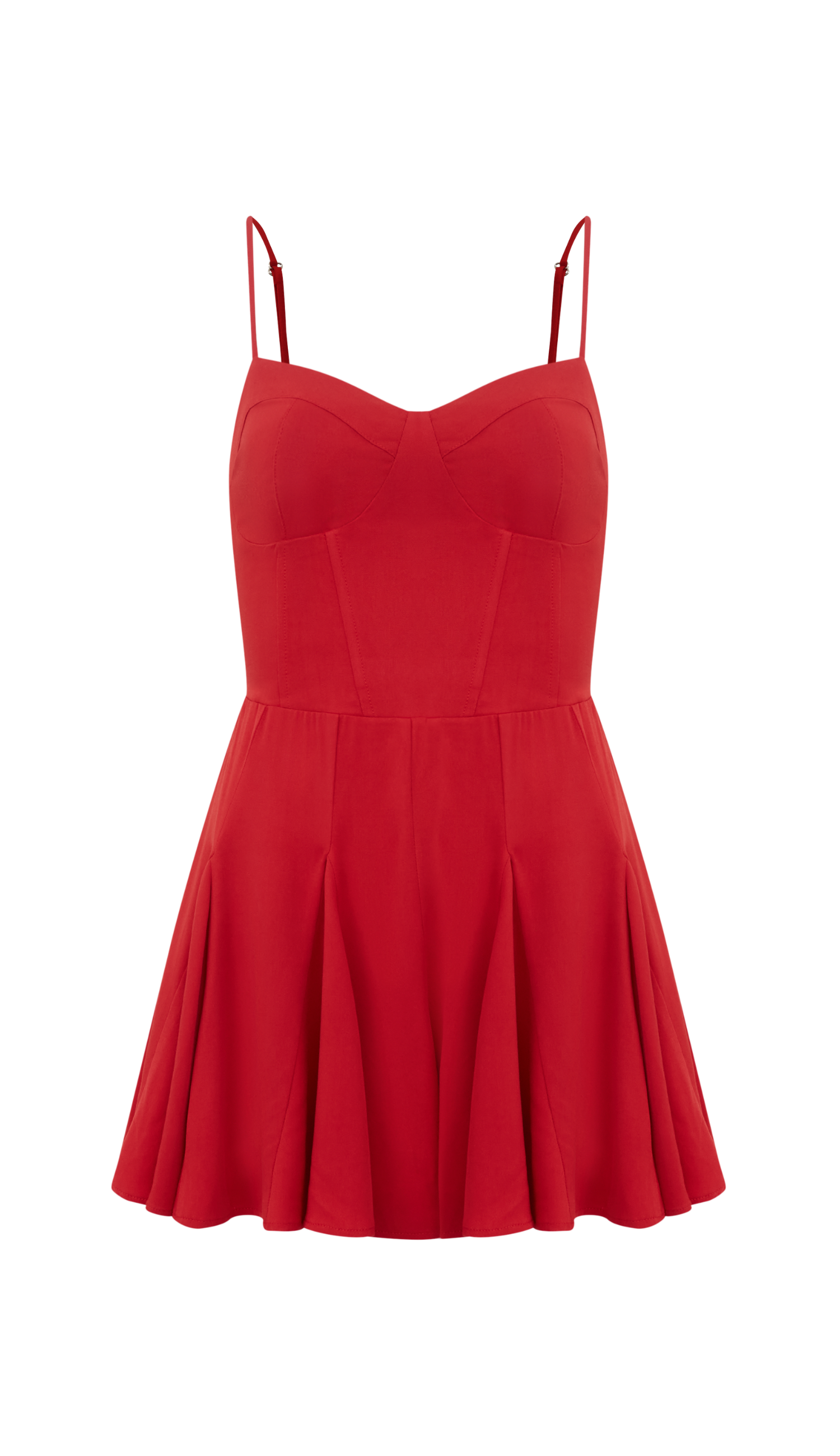 Macaquinho confeccionado em viscose twill com forro. Possui decote coração com pala e recortes que modelam o busto, alcinhas reguláveis, pala também na cintura com barbatanas para estruturar, fechamento traseiro por zíper invisível, lastex nas costas para maior conforto, forro de shorts com saia sobreposta e nesgas que dão um lindo movimento à peça.