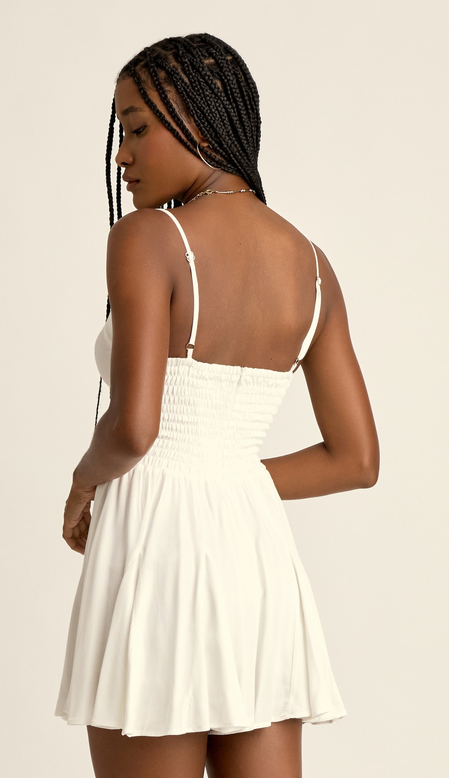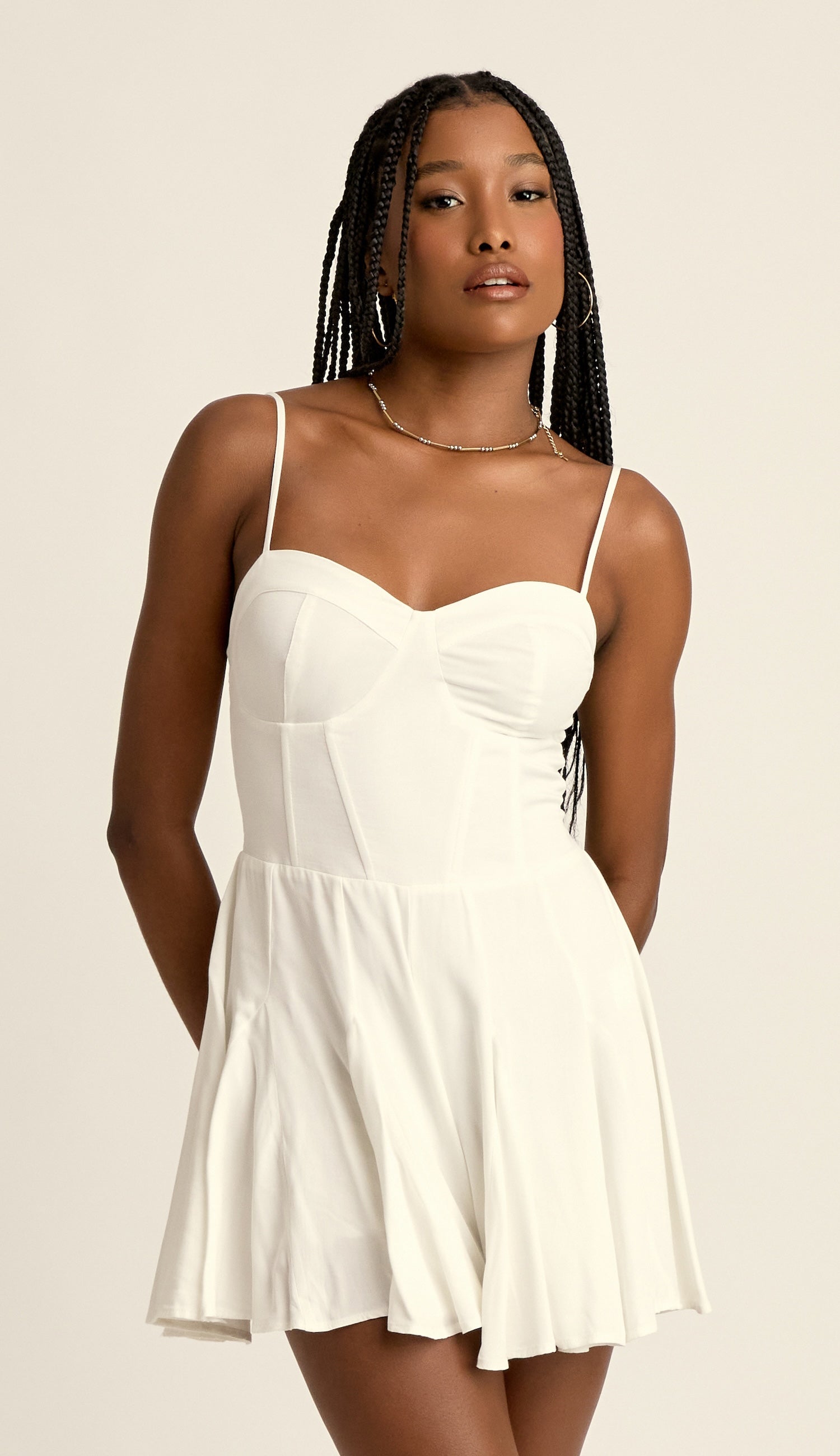 Macaquinho confeccionado em viscose twill com forro. Possui decote coração com pala e recortes que modelam o busto, alcinhas reguláveis, pala também na cintura com barbatanas para estruturar, fechamento traseiro por zíper invisível, lastex nas costas para maior conforto, forro de shorts com saia sobreposta e nesgas que dão um lindo movimento à peça.