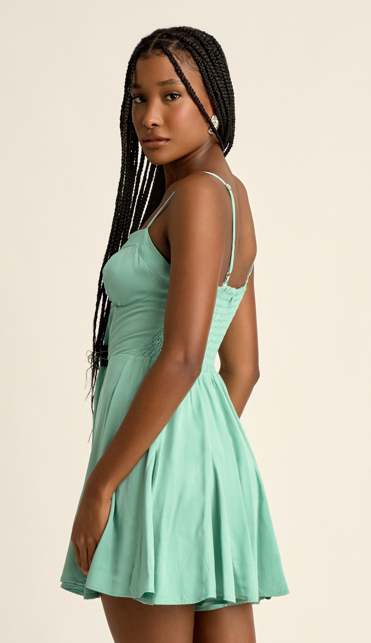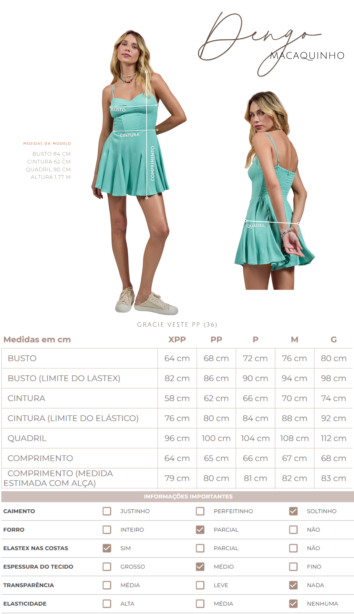 Macaquinho confeccionado em viscose twill com forro. Possui decote coração com pala e recortes que modelam o busto, alcinhas reguláveis, pala também na cintura com barbatanas para estruturar, fechamento traseiro por zíper invisível, lastex nas costas para maior conforto, forro de shorts com saia sobreposta e nesgas que dão um lindo movimento à peça.