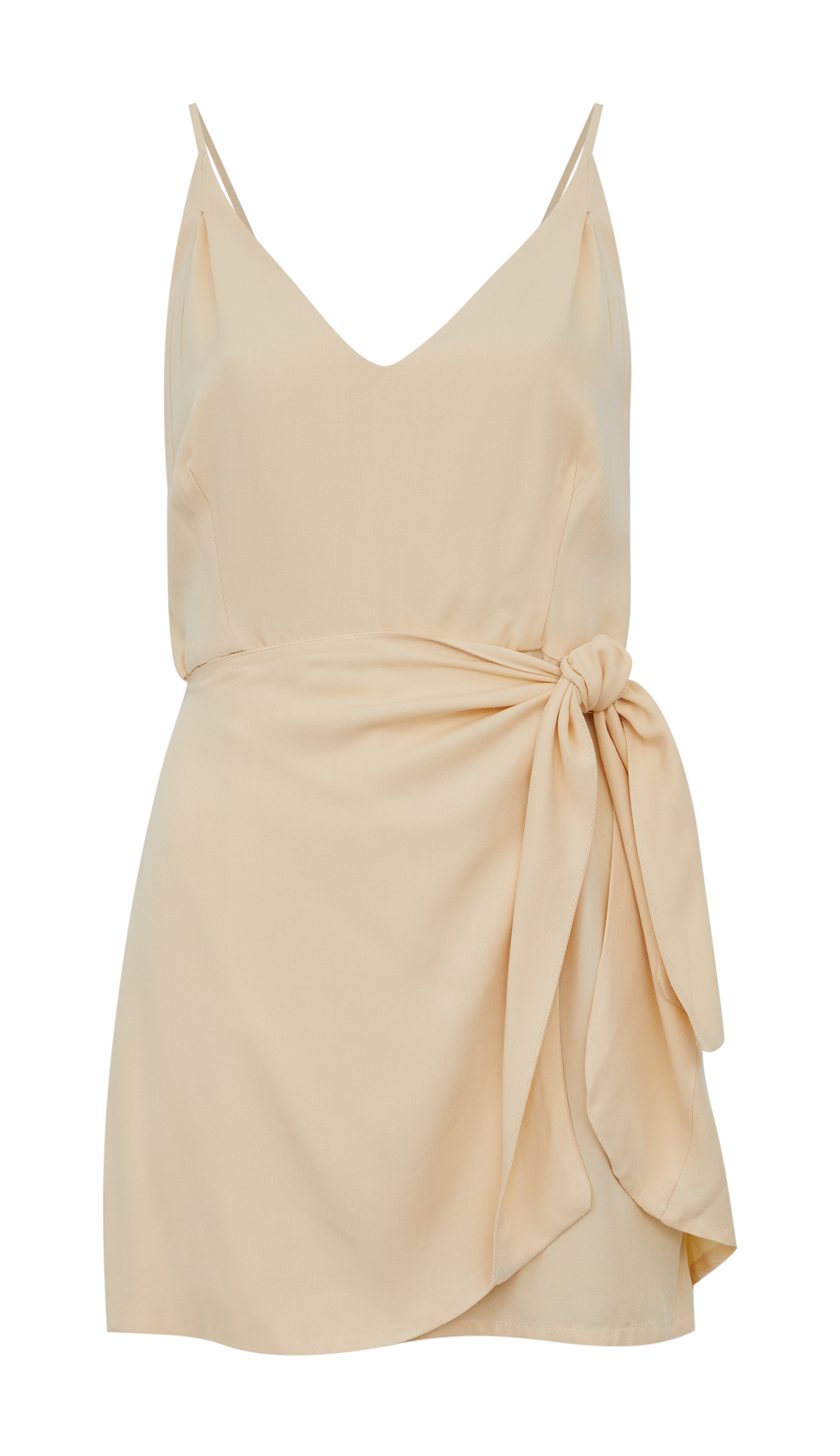 Macaquinho confeccionado em viscose twill. Possui decote em V com tecido duplo no busto para não ficar transparente, alcinhas reguláveis, sobreposição fixa na cintura para amarração frontal, parecendo uma sainha no estilo envelope e fechamento traseiro por zíper invisível.