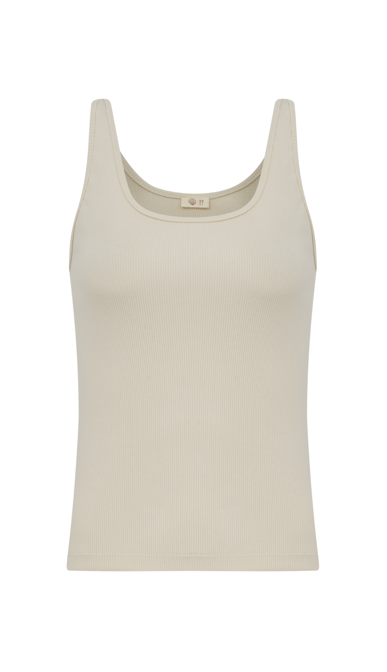 Regata confeccionada em malha canelada. Possui modelagem ajustada, alças mais larguinhas e decote redondo frente e costas.