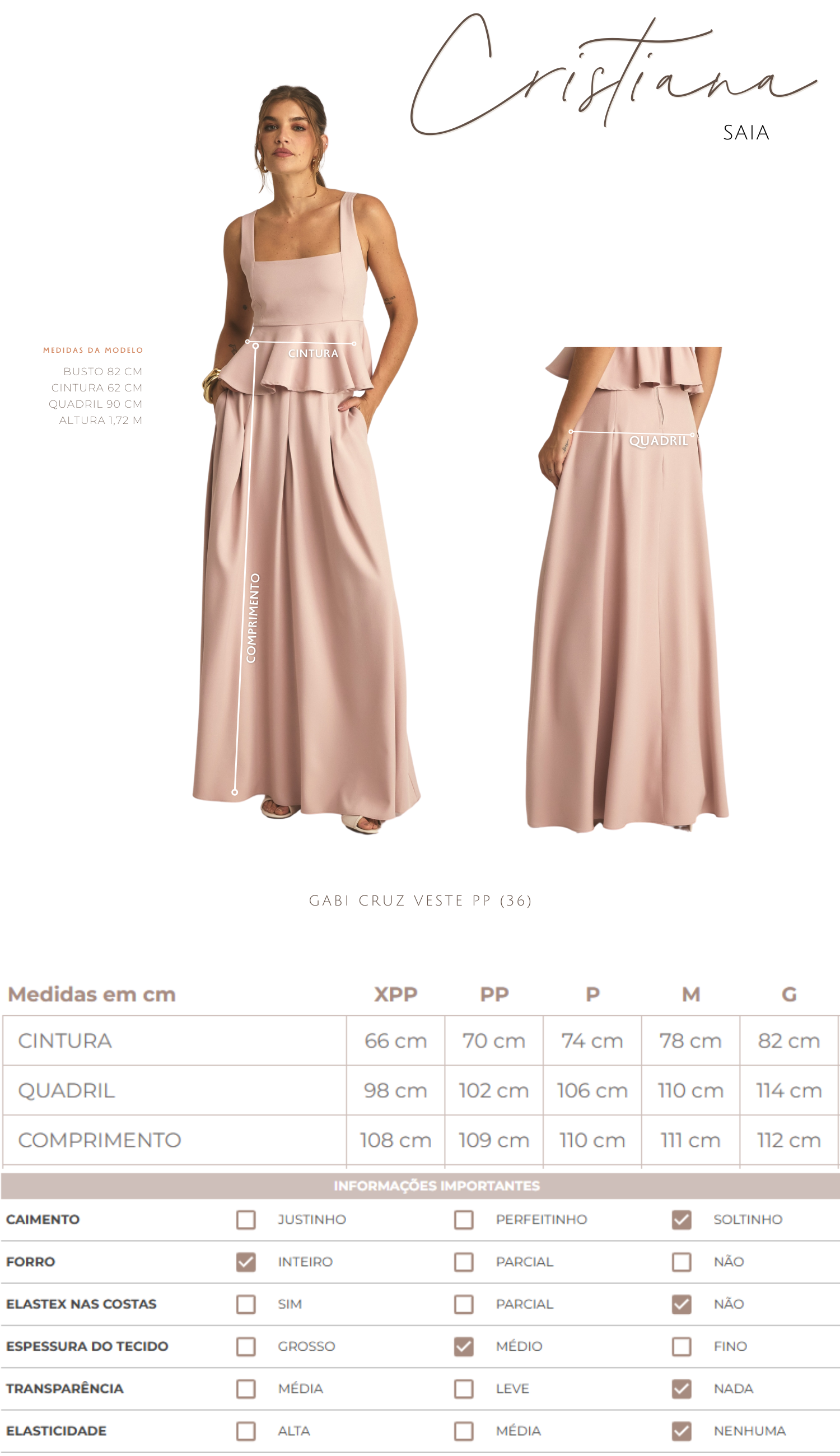 Saia longa evasê confeccionada em crepe de alfaiataria com forro. Possui pala no cós com recorte assimétrico, pregas na frente e atrás, bolsos faca laterais e fechamento traseiro por zíper de metal com pingente que tem a conchinha da Laguna gravada.