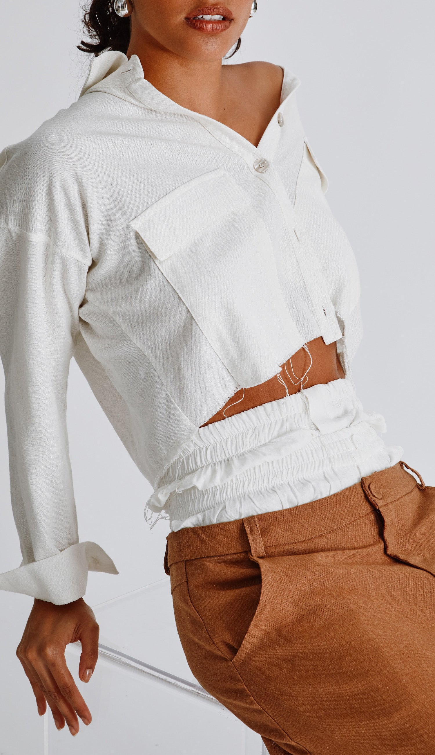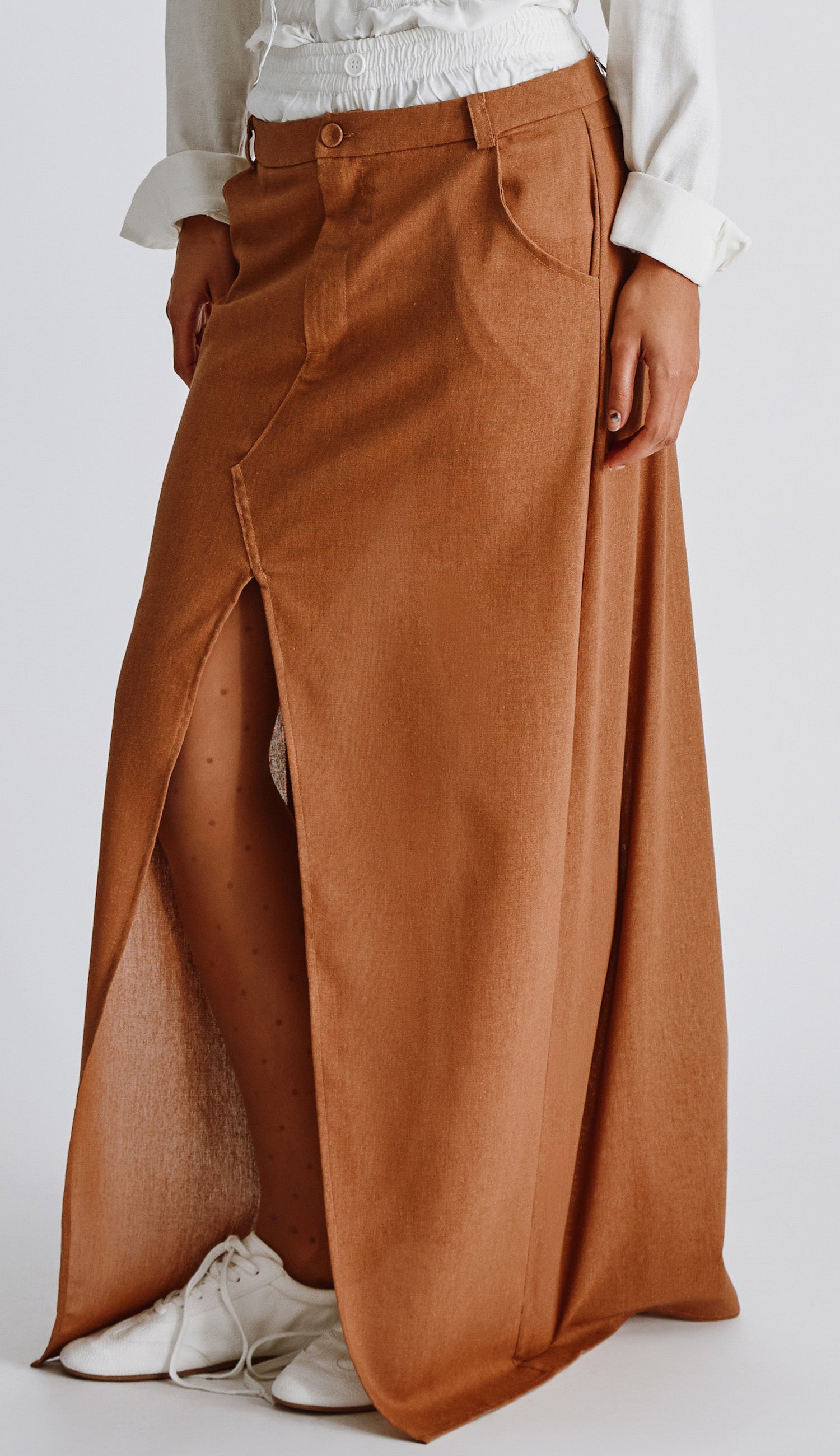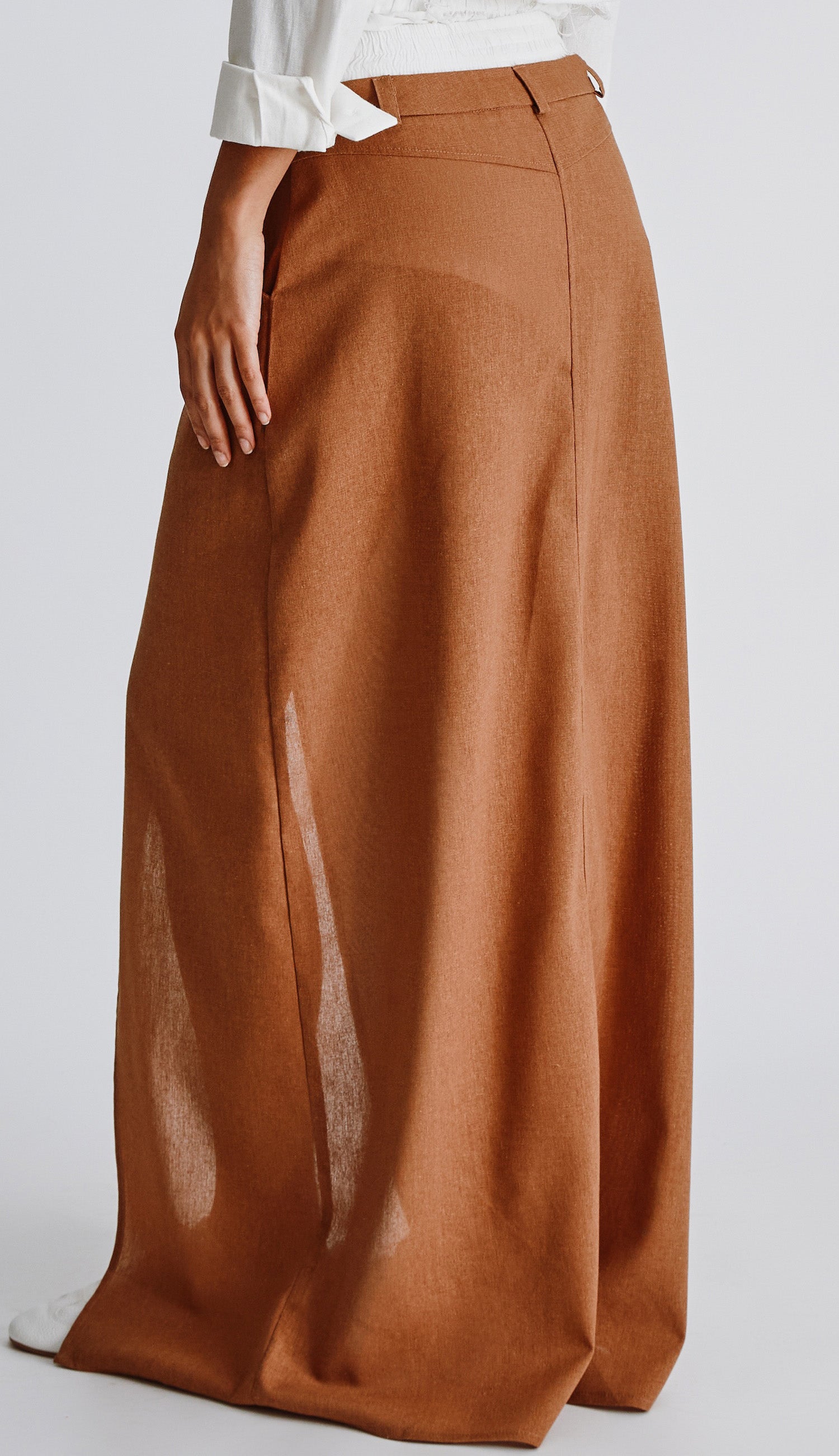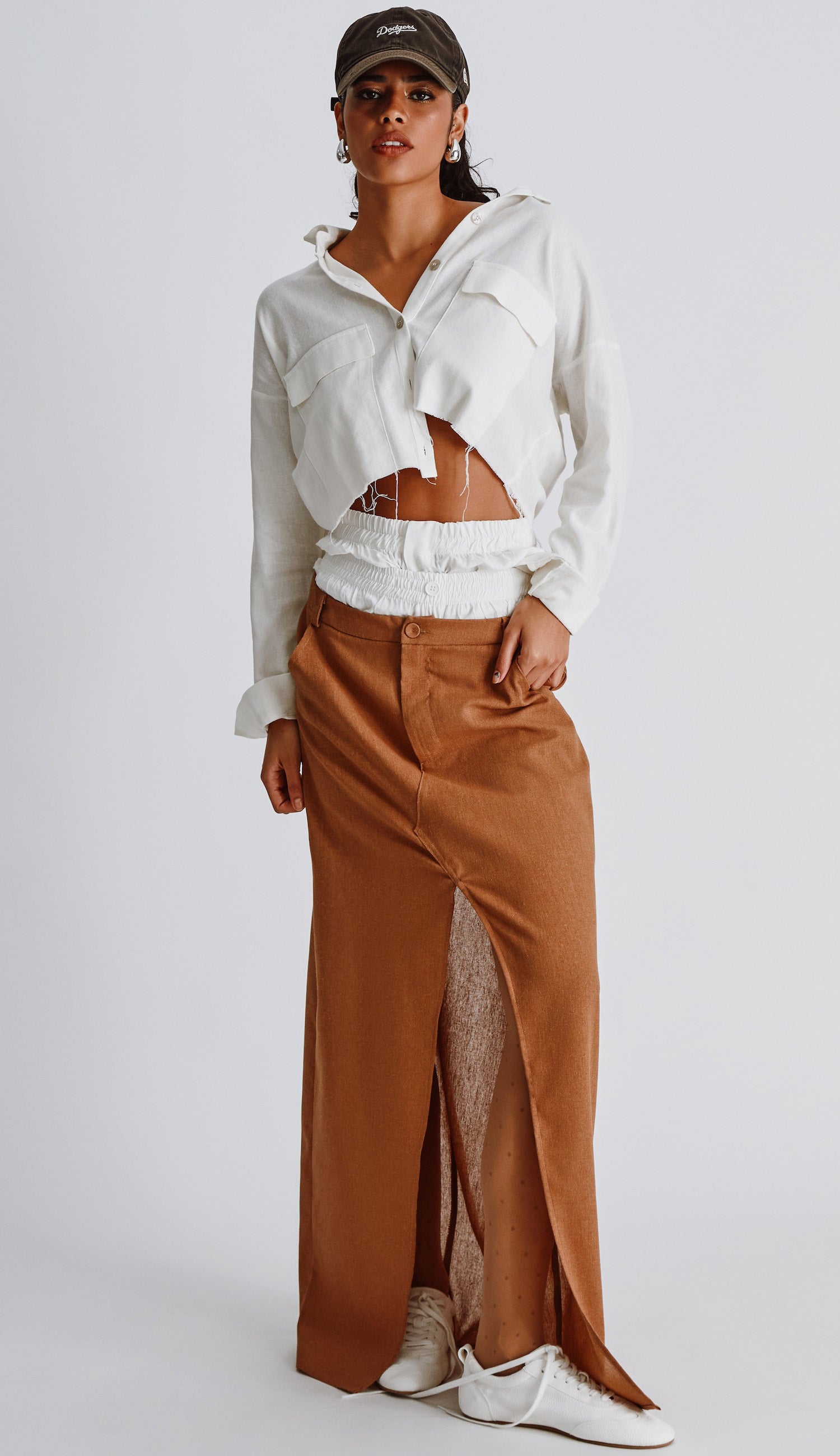 Saia longa confeccionada em linho. Conta com o detalhe de cós em poliviscose sobreposto ao cós verdadeiro da saia, estilo samba canção com elástico franzido na cintura e botão de massa no centro. A peça possui fechamento frontal por zíper e botão forrado, bolsos laterais, passantes no cós e fenda frontal.