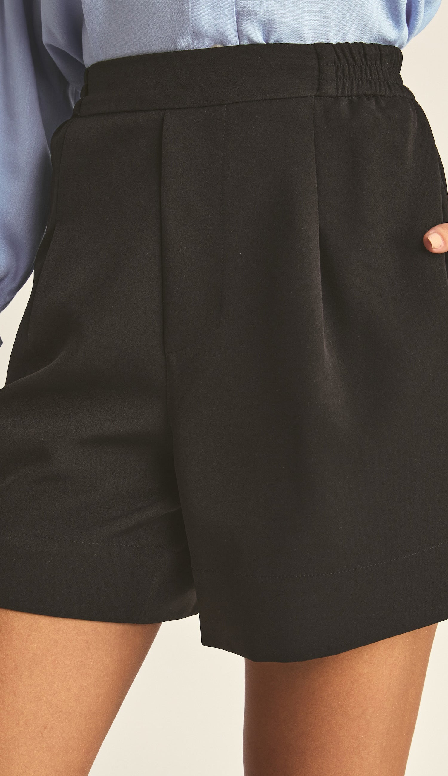 Shorts confeccionado em crepe de alfaiataria. Possui elástico franzido no cós com pala e recorte na parte frontal, pernas soltinhas e detalhe de pregas frontais. Modelo que tem carinha de "social" com corte de alfaiataria, mas também um ar despojado que permite a criação de diversas propostas diferentes de looks.