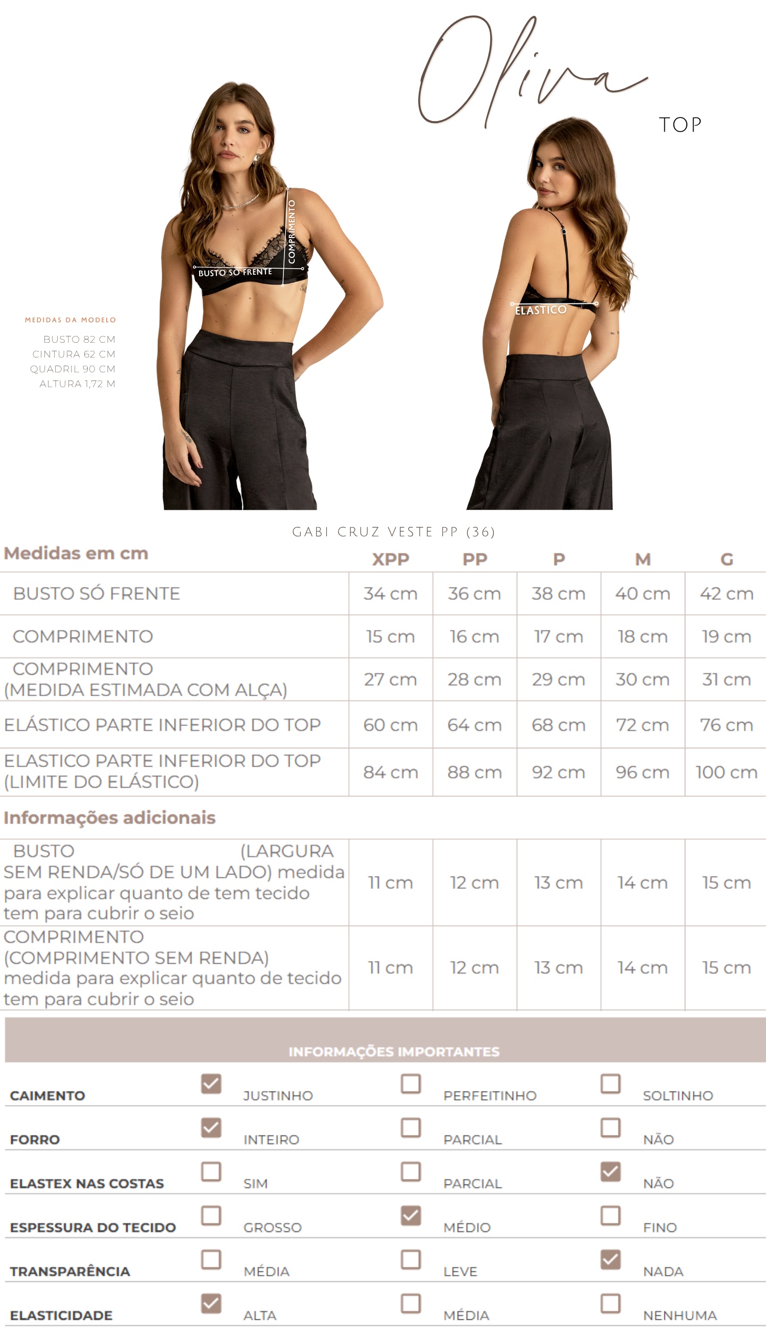 Top triangular confeccionado em malha e aplicação de renda no decote. Possui alcinhas de elástico reguláveis, decote em V, recortes que modelam o busto, seguido de elástico fino para dar sustentação e fechamento traseiro por fecho de encaixe.