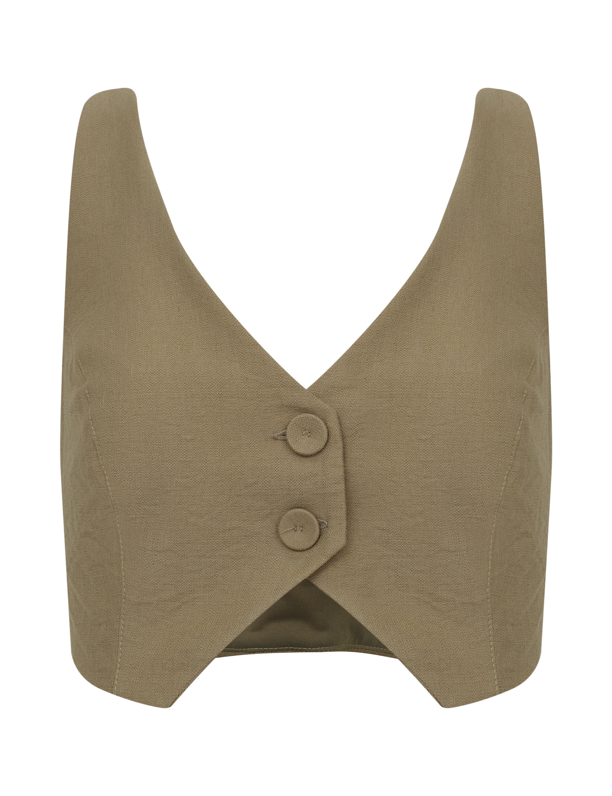 Trijunto com forro, confeccionado em poliviscose texturizado com aspecto de linho e efeito amassadinho. O colete possui decote em V, alças com elástico nas costas, recortes que modelam a peça, fechamento frontal por botõezinhos forrados e recorte geométrico na barra. O shorts saia possui modelagem soltinhas, fechamento lateral por zíper de metal com pingente que tem a conhcinha da Laguna gravada, bolsos traseiros e sobreposição assimétrica na frente. O blazer possui modelagem acinturada, decote em V, fechamento frontal por botões forrados, lapela dobrada na gola e mangas longas com martingale.