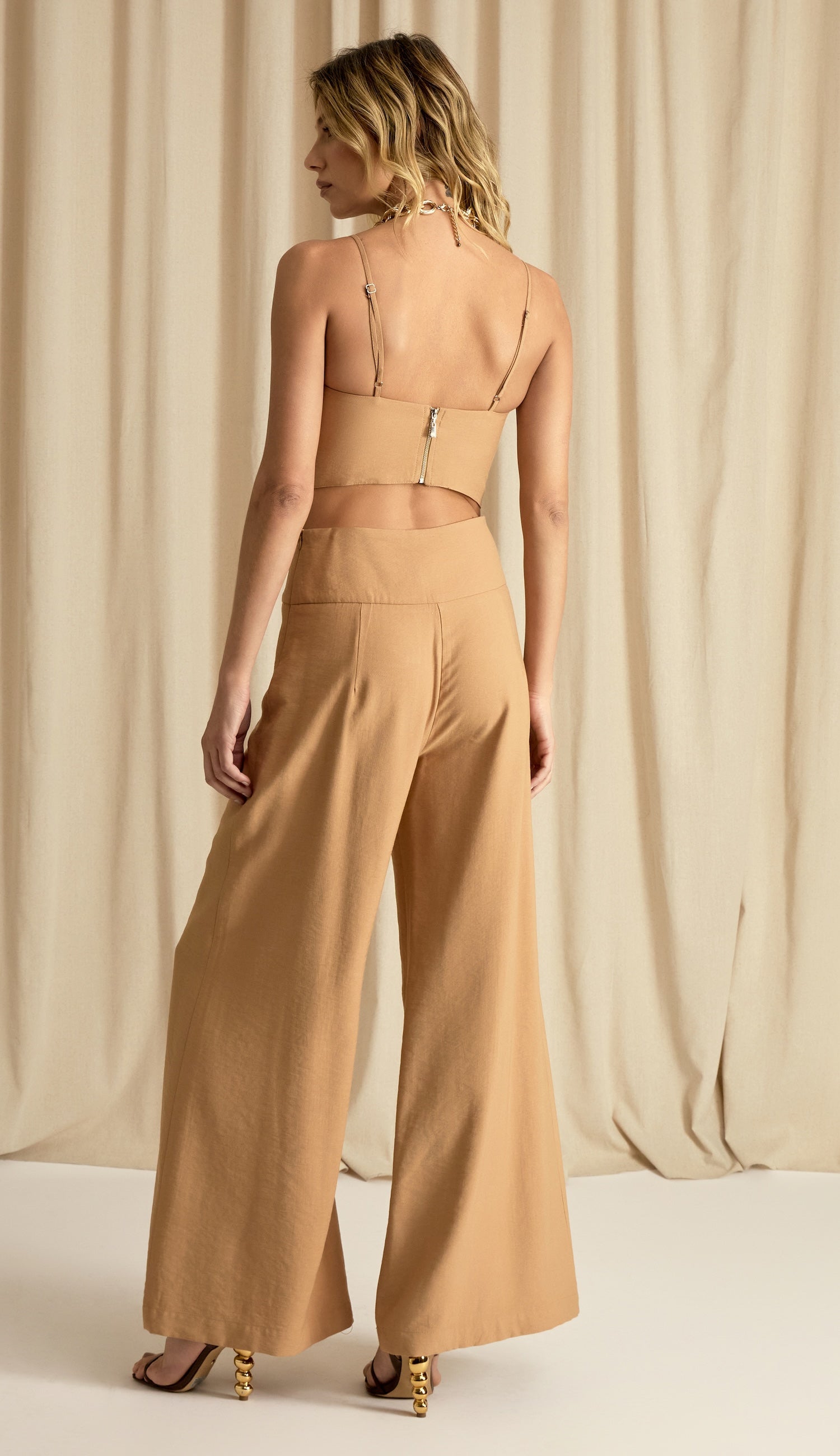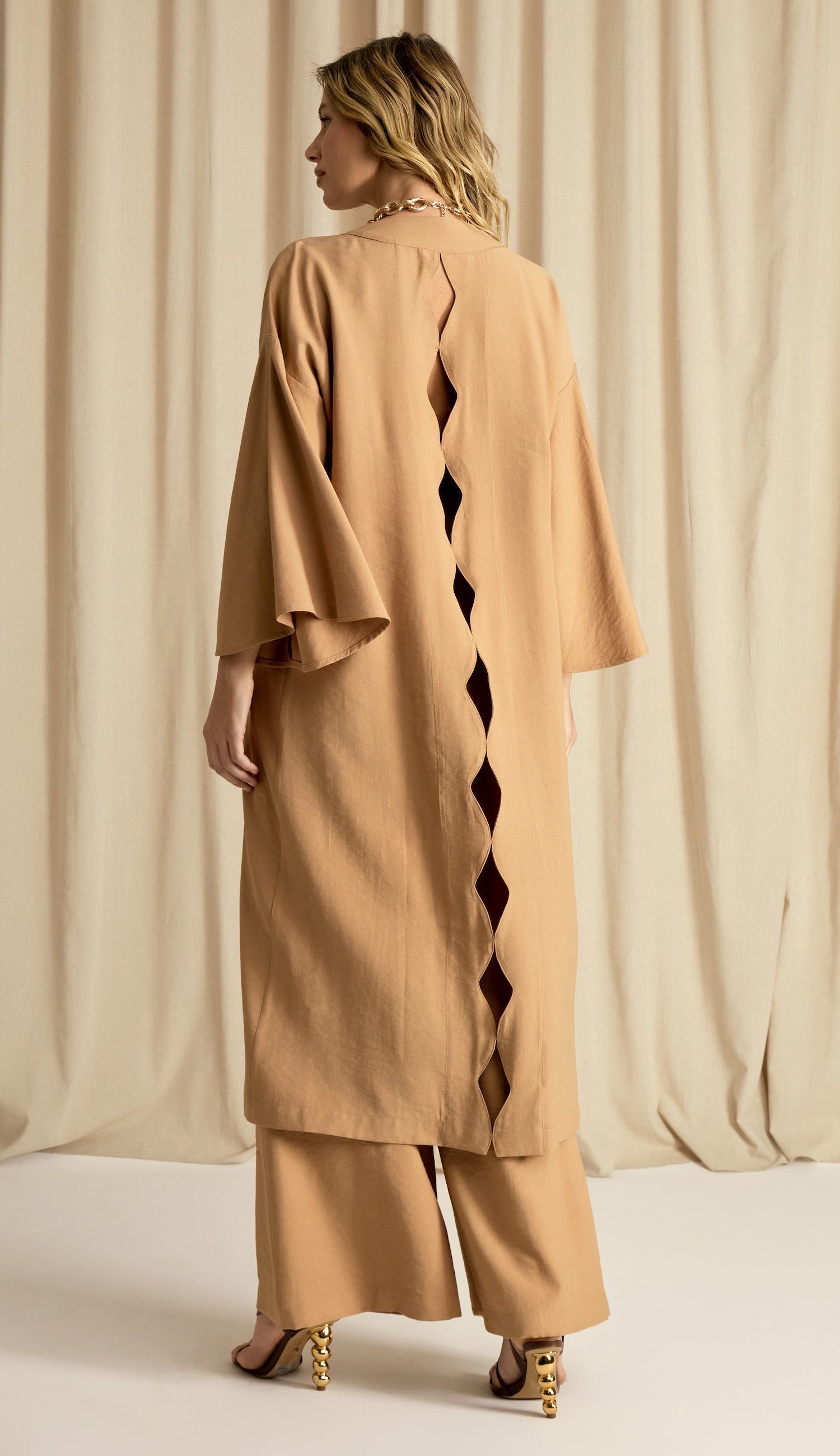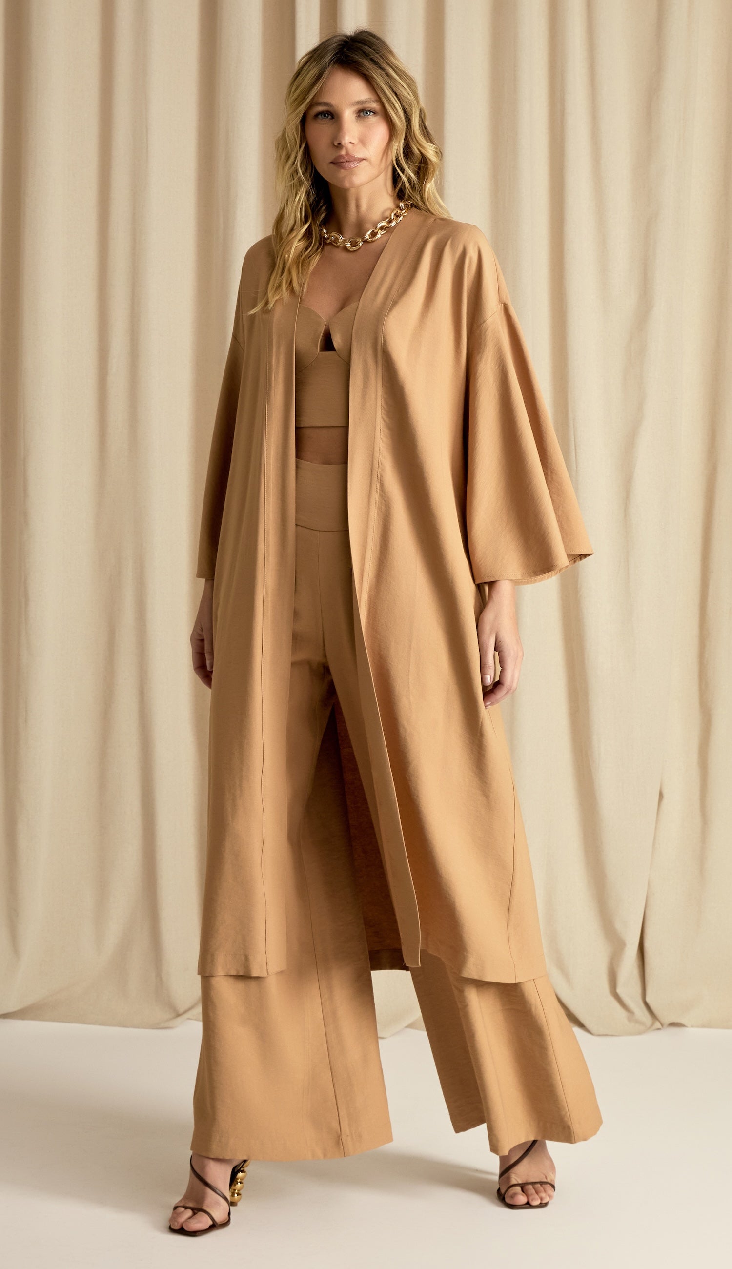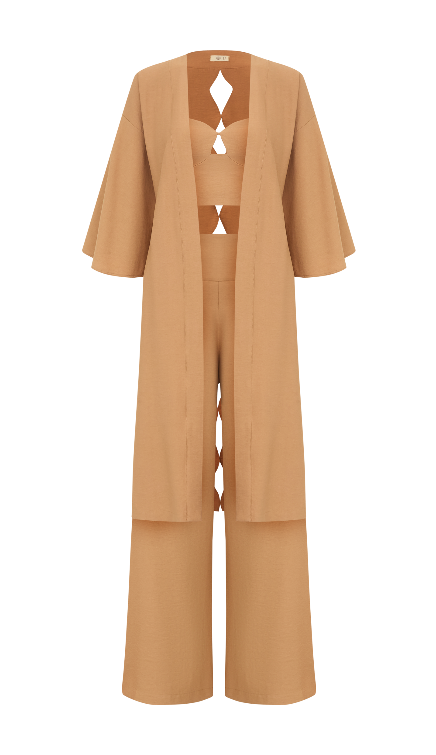 Trijunto confeccionado em sarja de alfaiataria em viscose mais encorpada. O top possui tecido duplo para não ficar transparente, decote coração com detalhe vazado no centro, recortes que modelam o busto, alcinhas reguláveis, pala logo abaixo do busto e fechamento traseiro por zíper de metal. A calça é pantalona e possui forro, pala larga no cós, bolsos frontais e fechamento lateral por zíper invisível. O kimono é aberto e longo, com modelagem ampla, mangas sino raglan longas e detalhe nas costas de recortes vazados geométricos que dão um charme especial à peça.