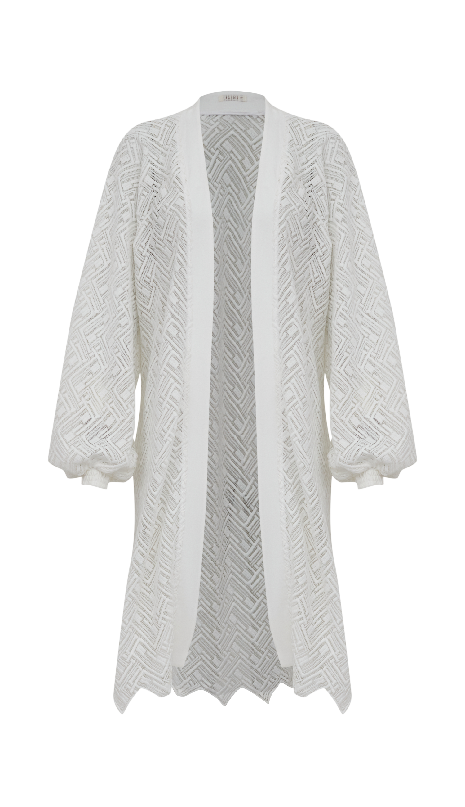 Trijunto em viscose twill e renda. O top é confeccionado em viscose twill, não possui mangas e conta com forro, decote reto com silicone elástico interno para dar mais segurança, sobreposição de camadas de tecidos arredondados com franzidos e lastex franzido nas costas para melhor ajuste ao corpo. A calça também é em viscose twill com forro na peça inteira e possui elástico franzido no cós, pernas soltinhas e bolsos laterais. O kimono é confeccionado em renda guipir, possui modelagem aberta, solta e longa; detalhe da vista em viscose, mangas longas bufantes com lastex franzido nos punhos e barrado a fio com recorte geométrico.