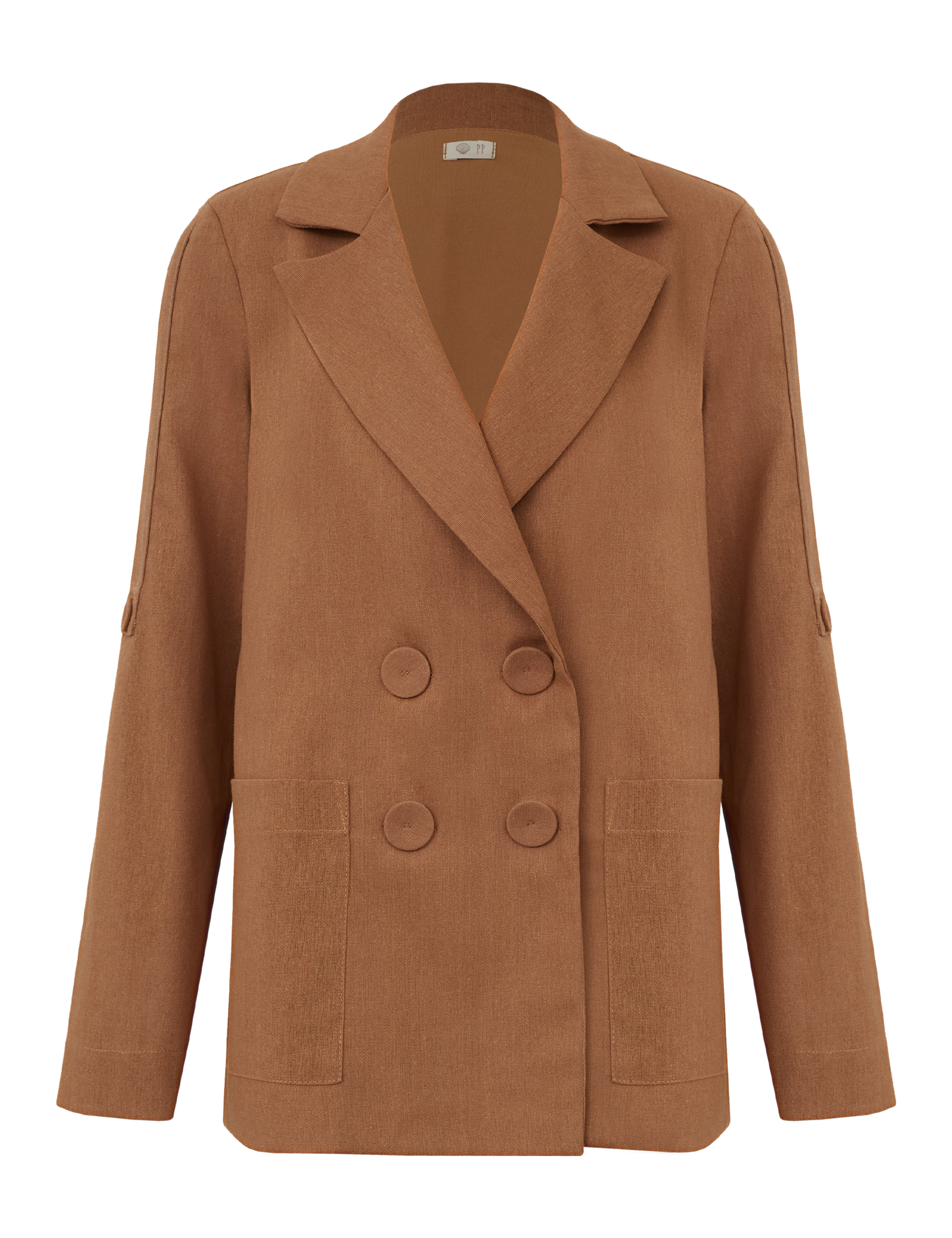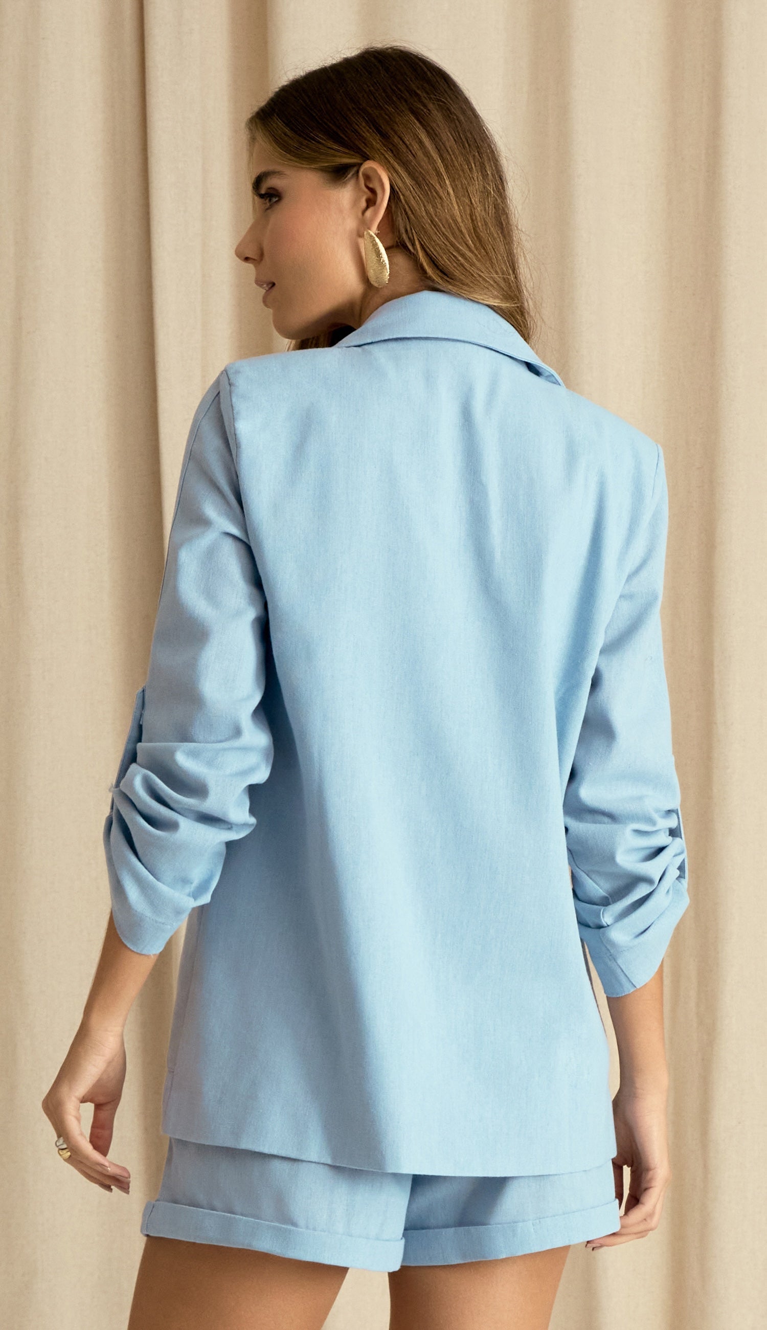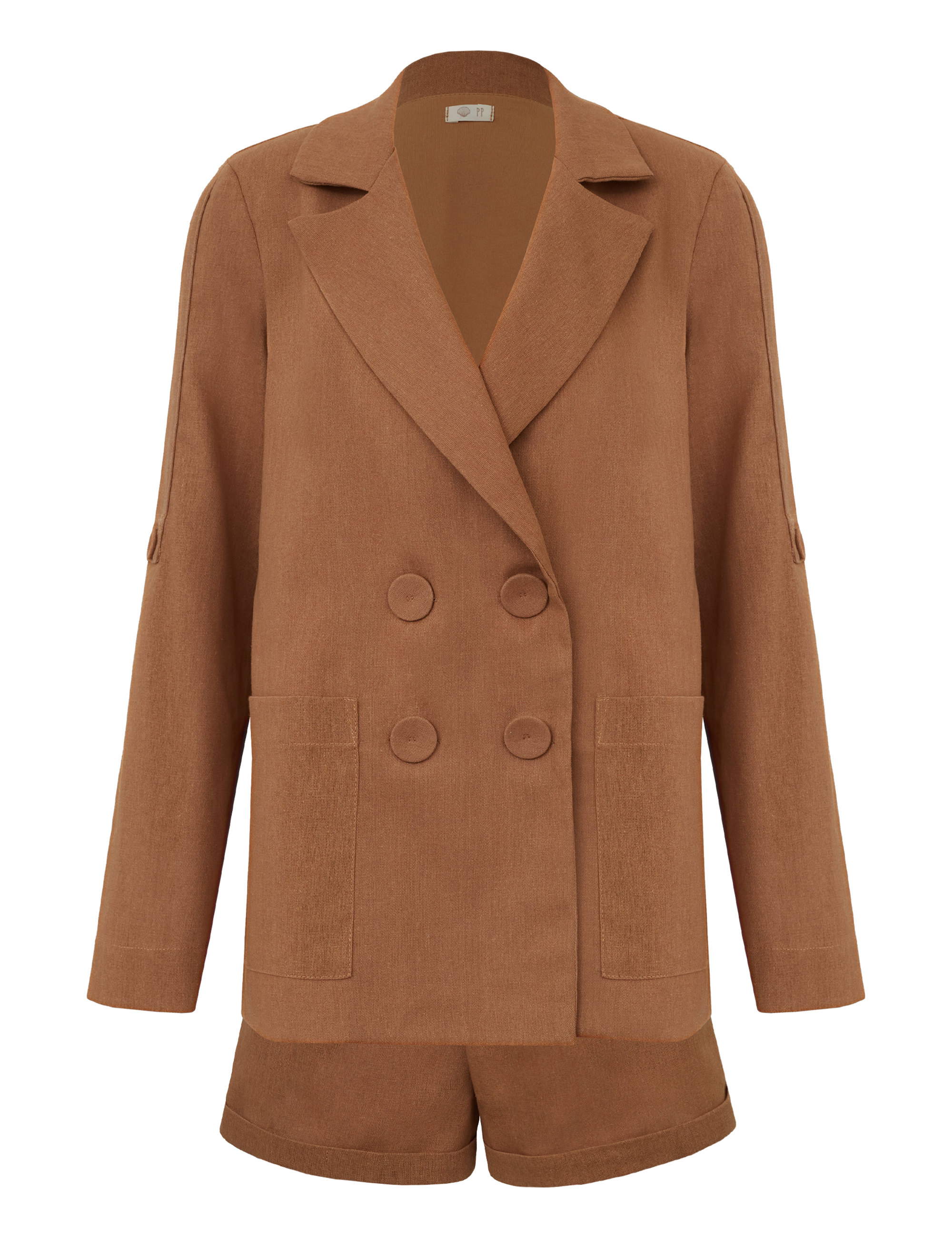 Trijunto confeccionado em linho com forro. O cropped possui alças finas reguláveis, recortes no busto para melhor ajuste e lastex e botões forrados nas costas. O blazer é oversized com a frente transpassada com 4 botões e o shorts é estilo alfaiataria com bolsos, botão forrado e barra dobrada. Despojado e com estilo praiano, nosso trijunto de linho é escolha certa para curtir os melhores momentos com a brisa do mar.
