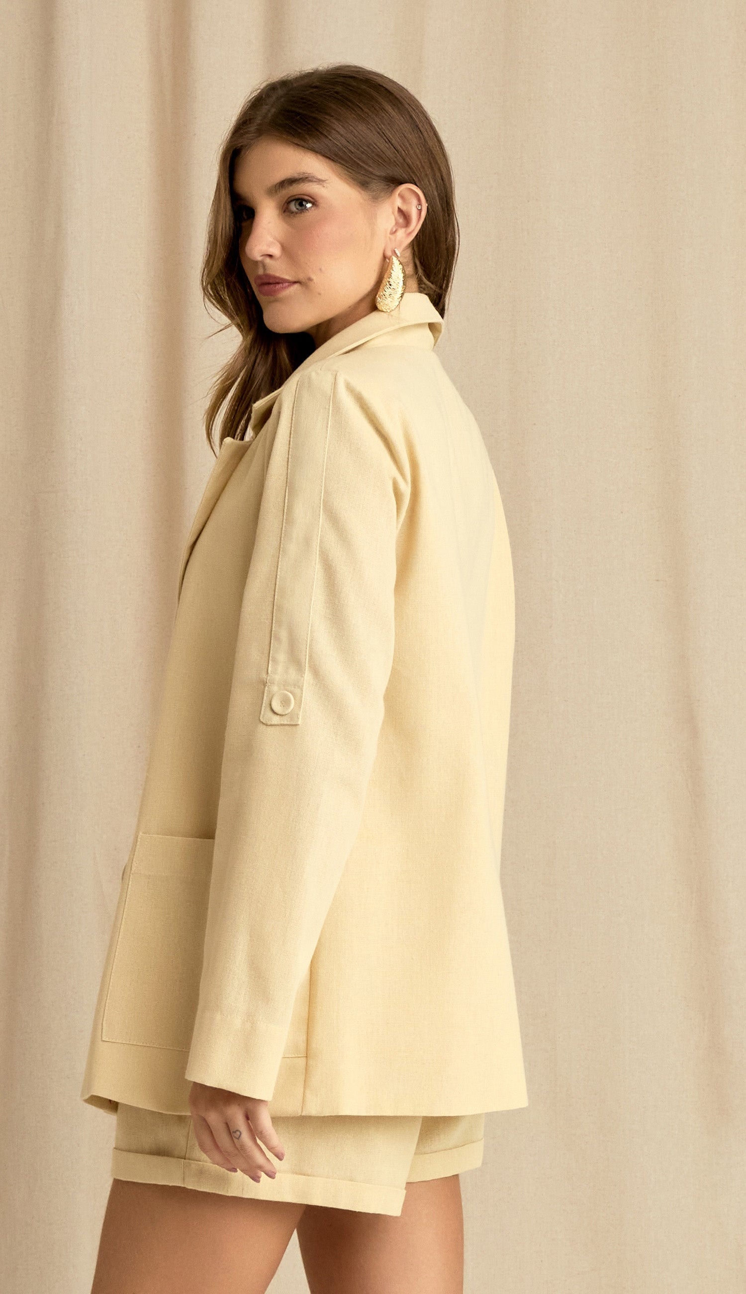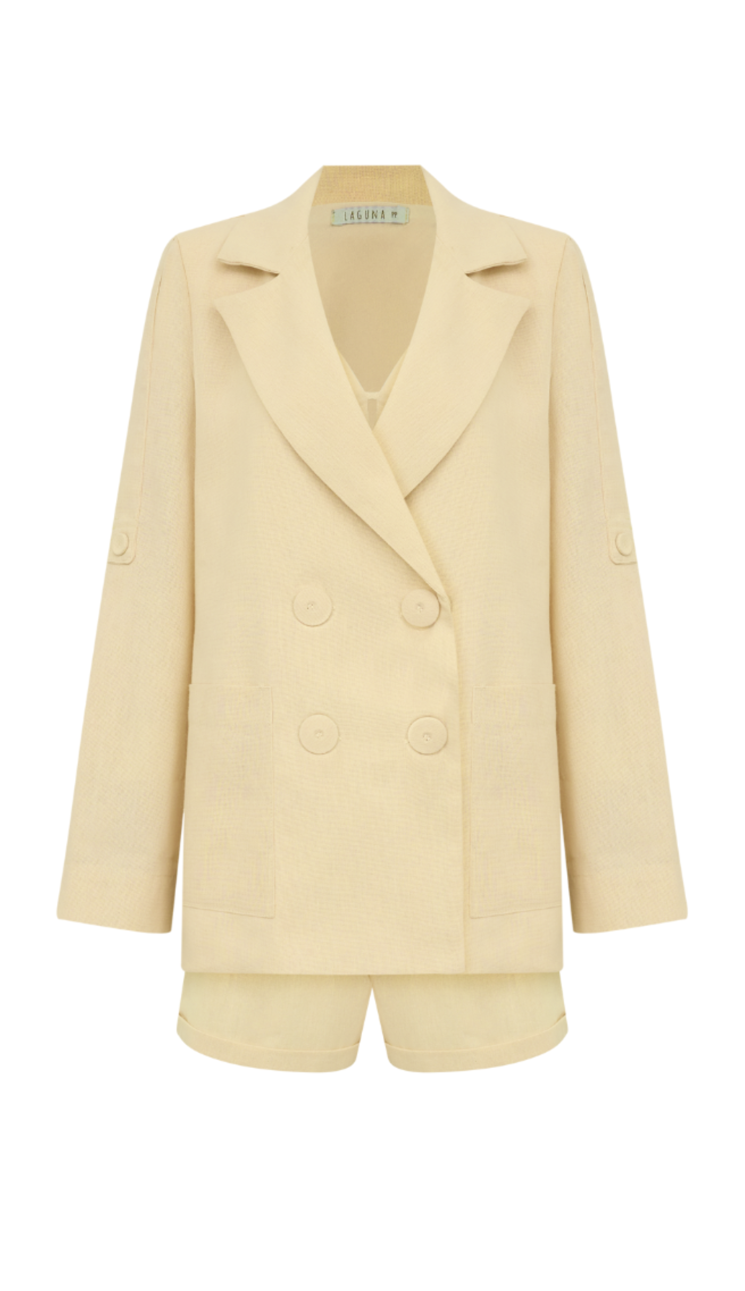 Trijunto confeccionado em linho com forro. O cropped possui alças finas reguláveis, recortes no busto para melhor ajuste e lastex e botões forrados nas costas. O blazer é oversized com a frente transpassada com 4 botões e o shorts é estilo alfaiataria com bolsos, botão forrado e barra dobrada. Despojado e com estilo praiano, nosso trijunto de linho é escolha certa para curtir os melhores momentos com a brisa do mar.