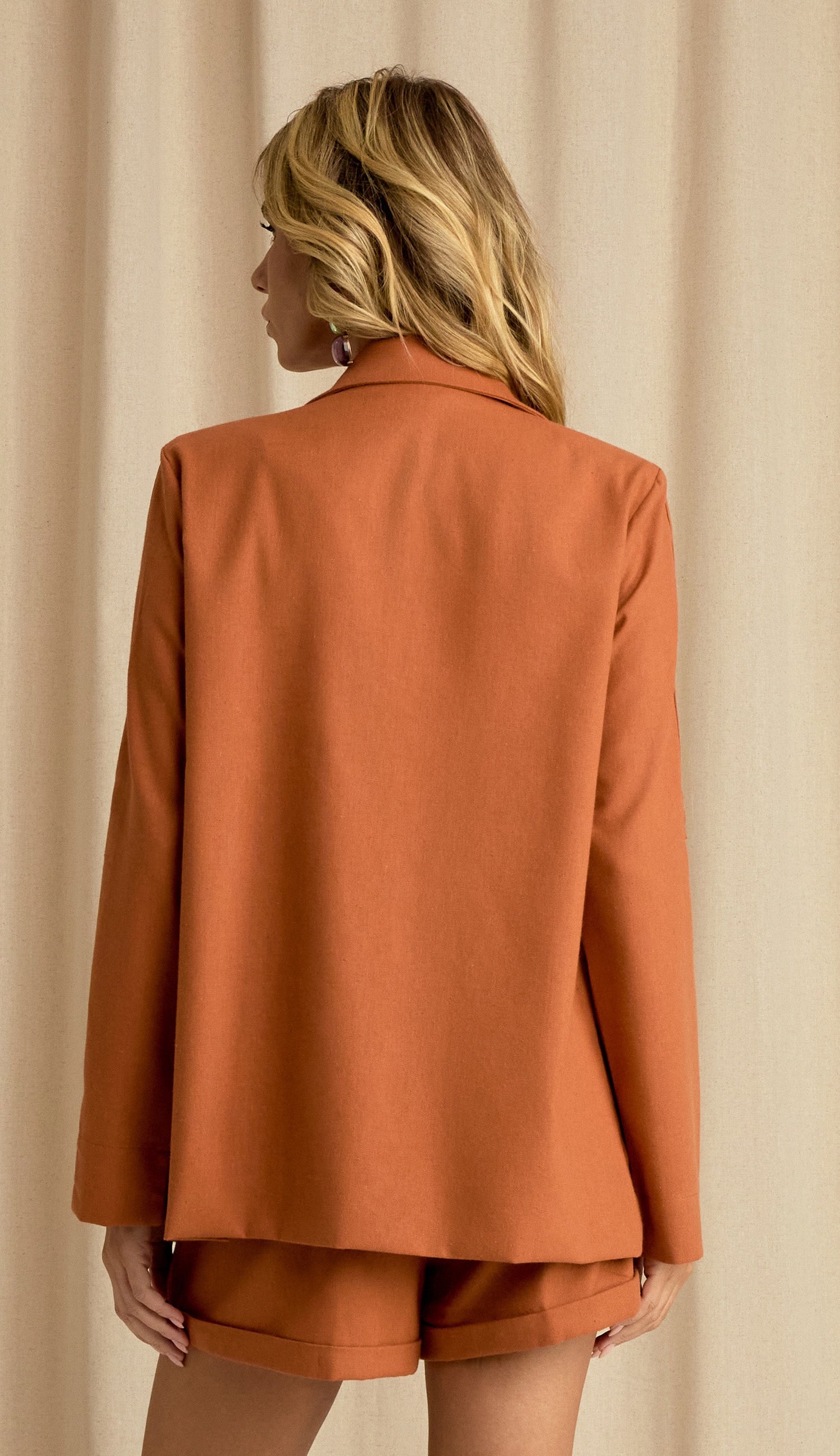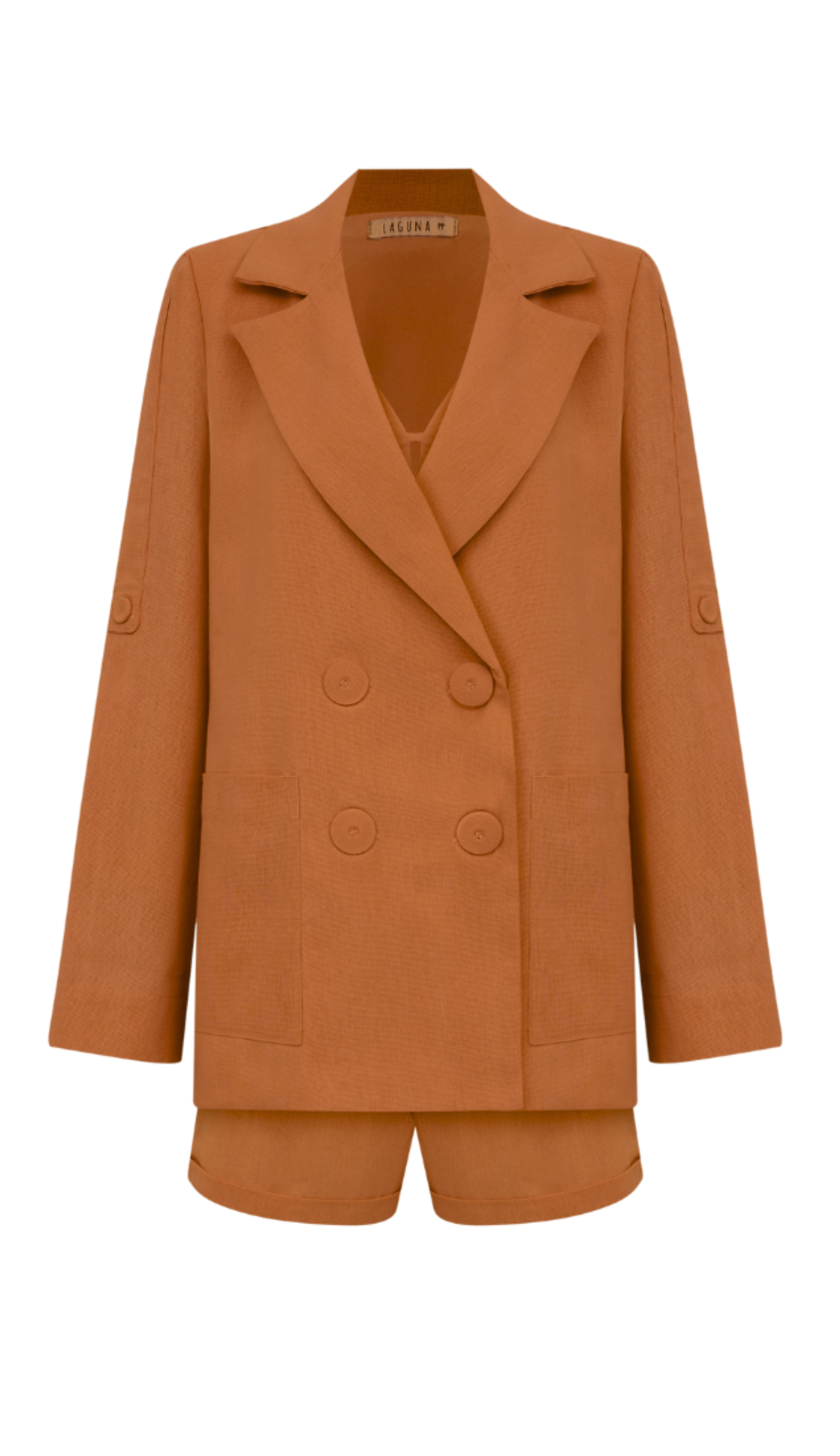 Trijunto confeccionado em linho com forro. O cropped possui alças finas reguláveis, recortes no busto para melhor ajuste e lastex e botões forrados nas costas. O blazer é oversized com a frente transpassada com 4 botões e o shorts é estilo alfaiataria com bolsos, botão forrado e barra dobrada. Despojado e com estilo praiano, nosso trijunto de linho é escolha certa para curtir os melhores momentos com a brisa do mar.