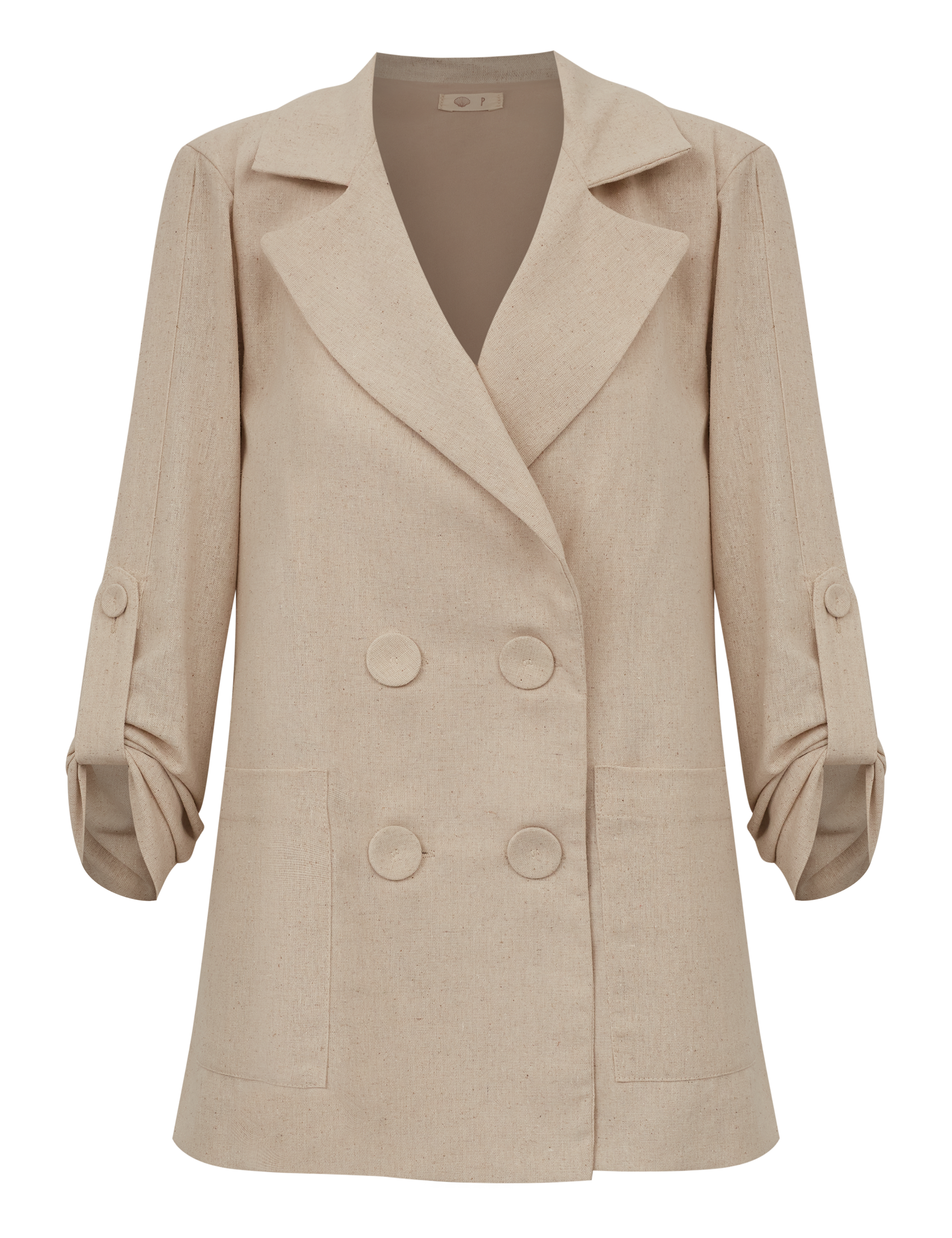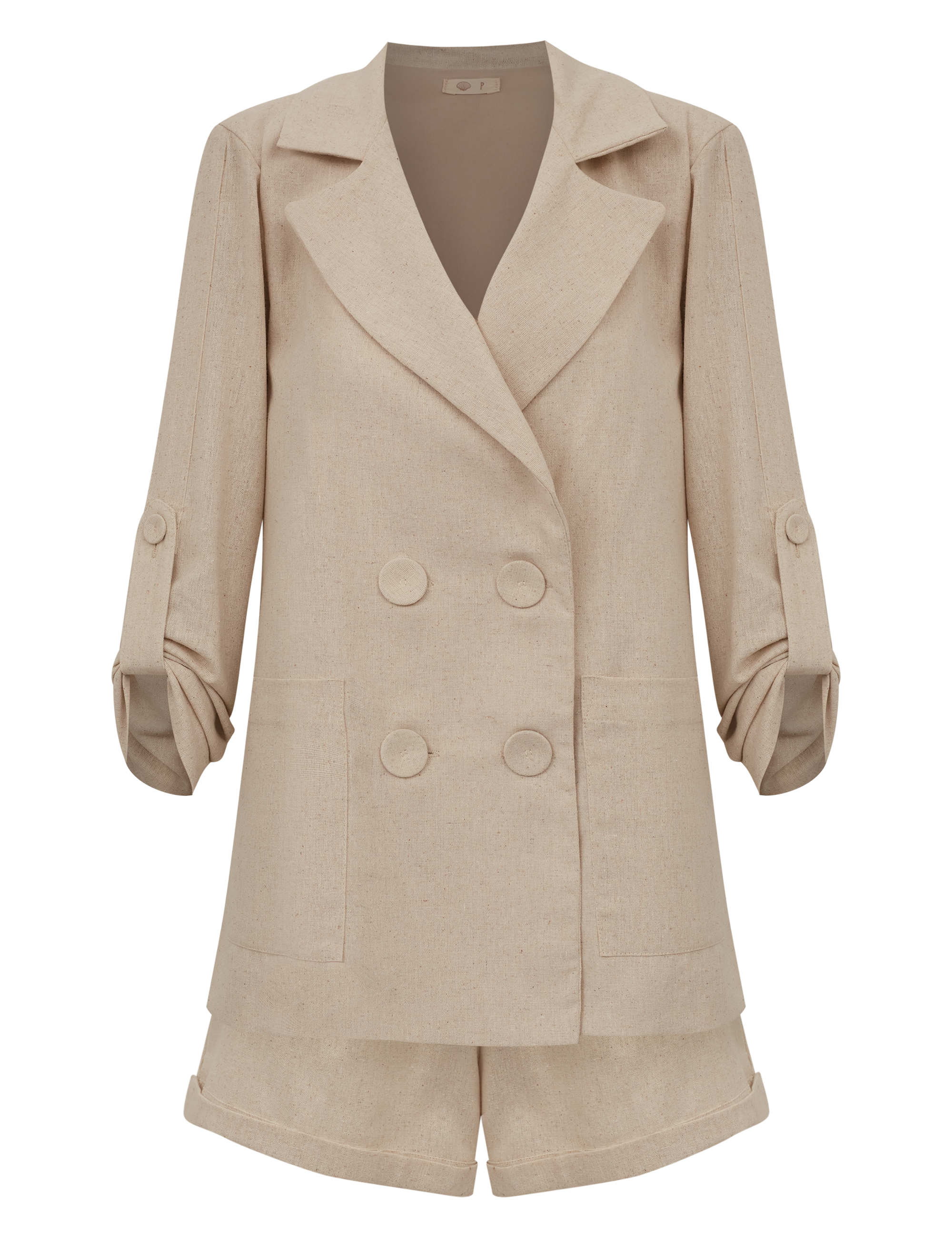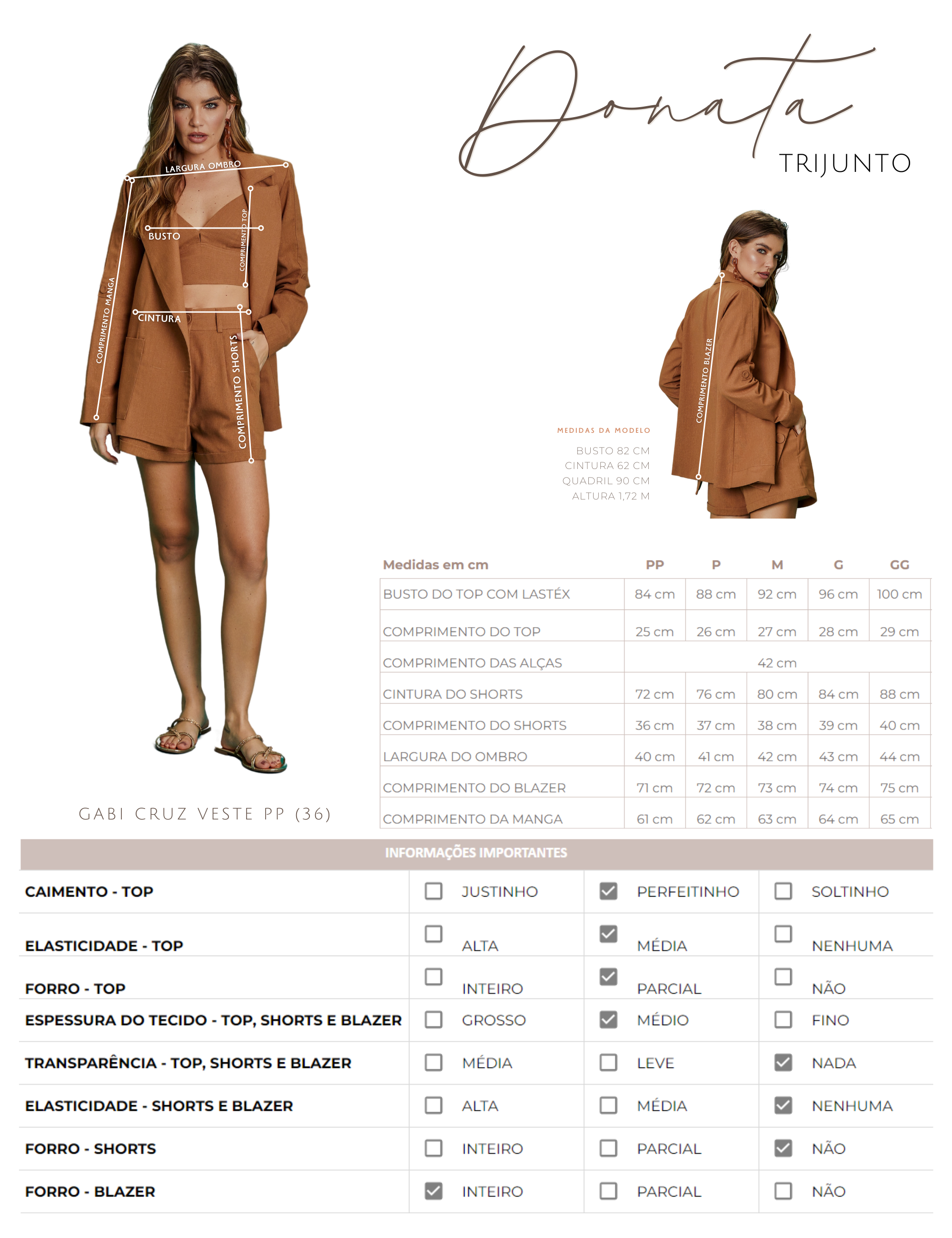 Trijunto confeccionado em linho com forro. O cropped possui alças finas reguláveis, recortes no busto para melhor ajuste e lastex e botões forrados nas costas. O blazer é oversized com a frente transpassada com 4 botões e o shorts é estilo alfaiataria com bolsos, botão forrado e barra dobrada. Despojado e com estilo praiano, nosso trijunto de linho é escolha certa para curtir os melhores momentos com a brisa do mar.