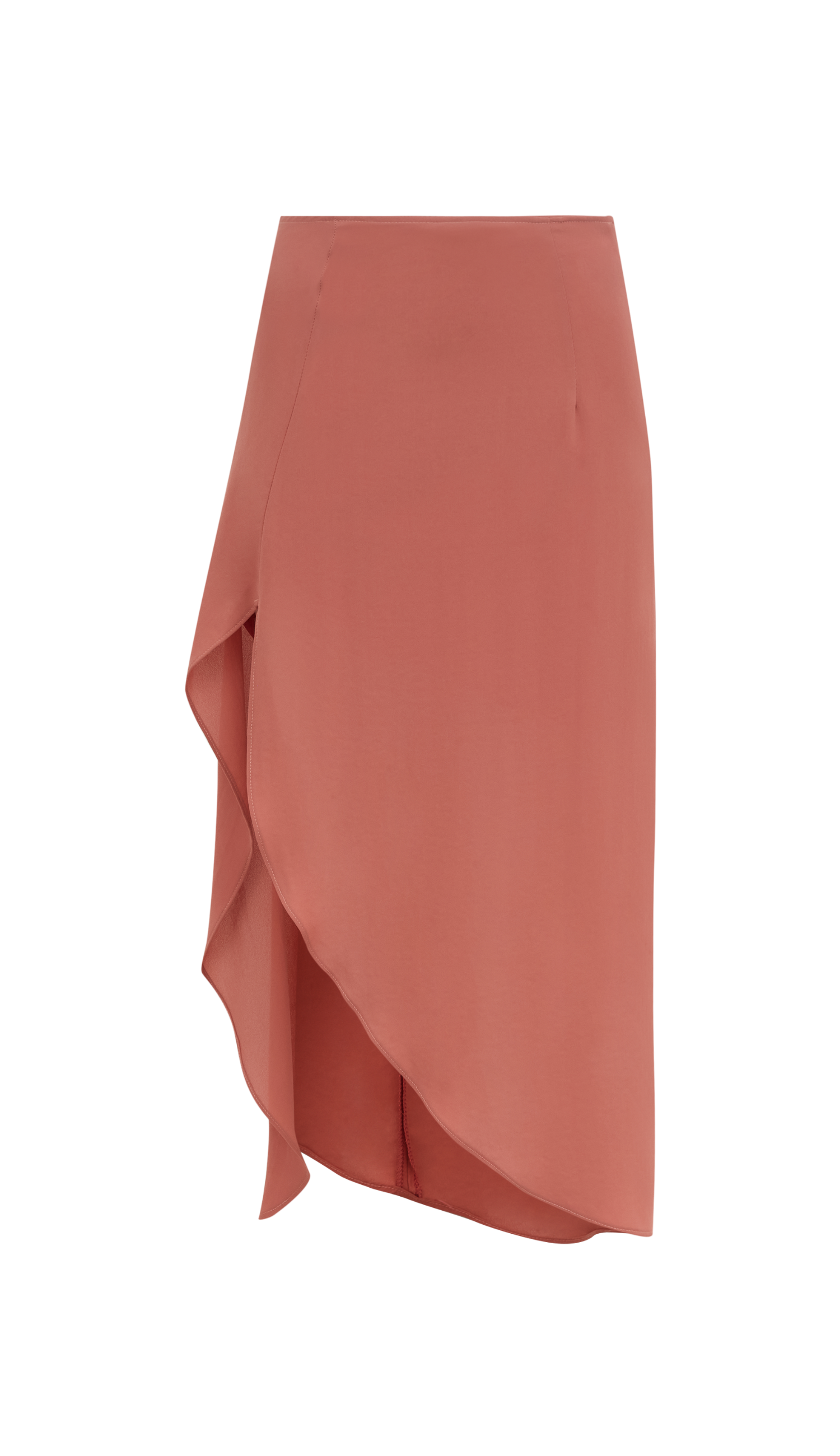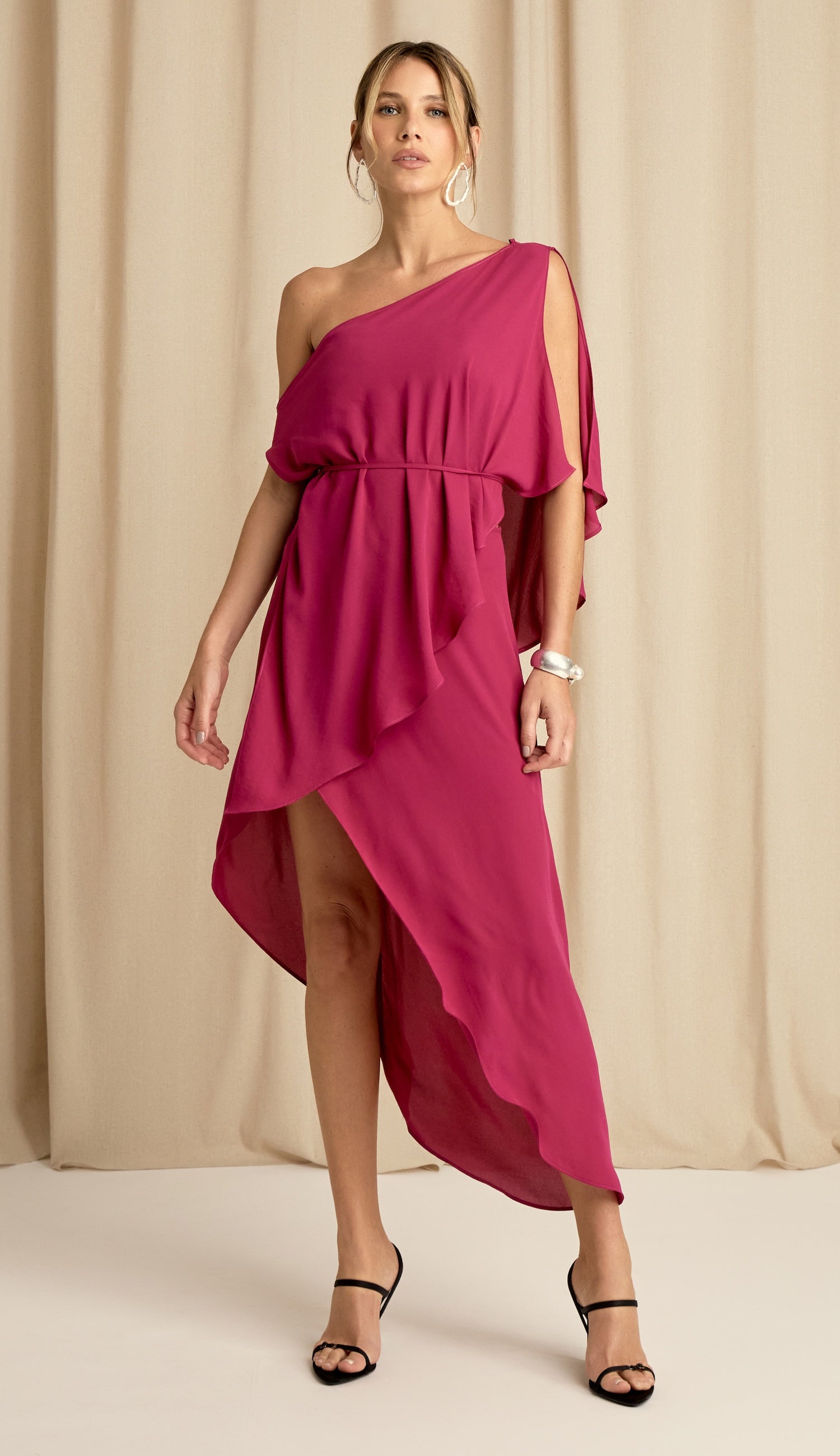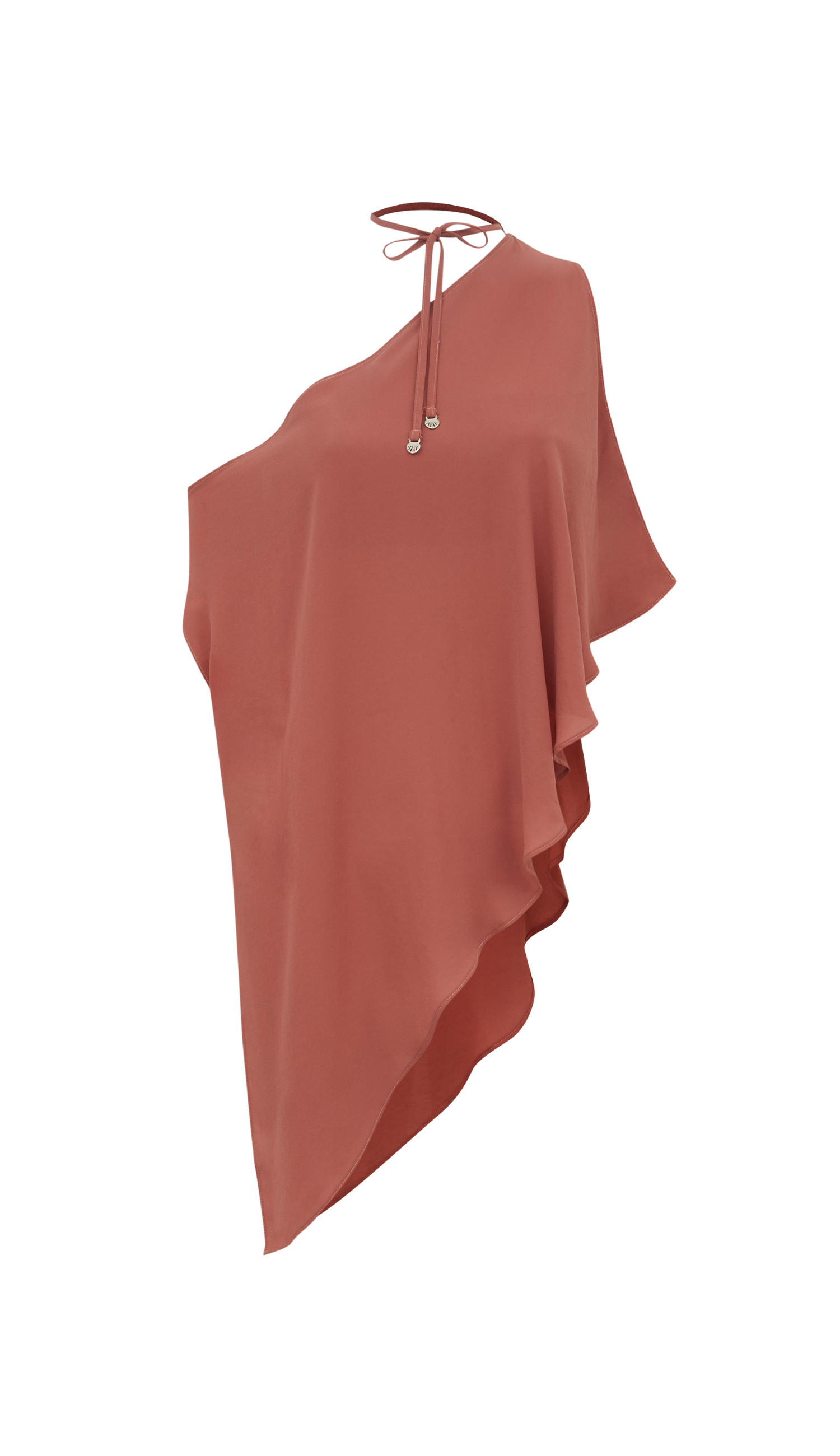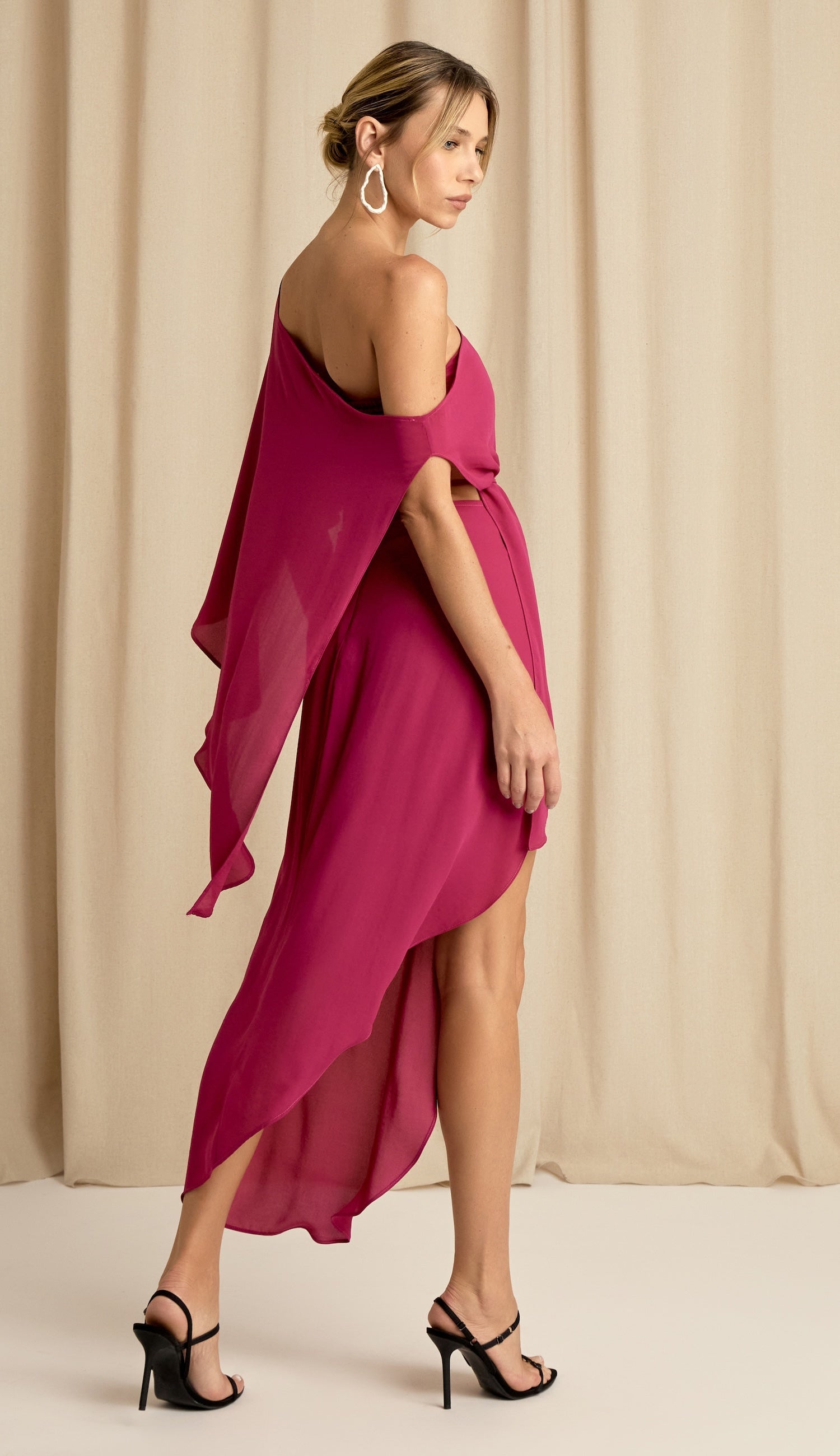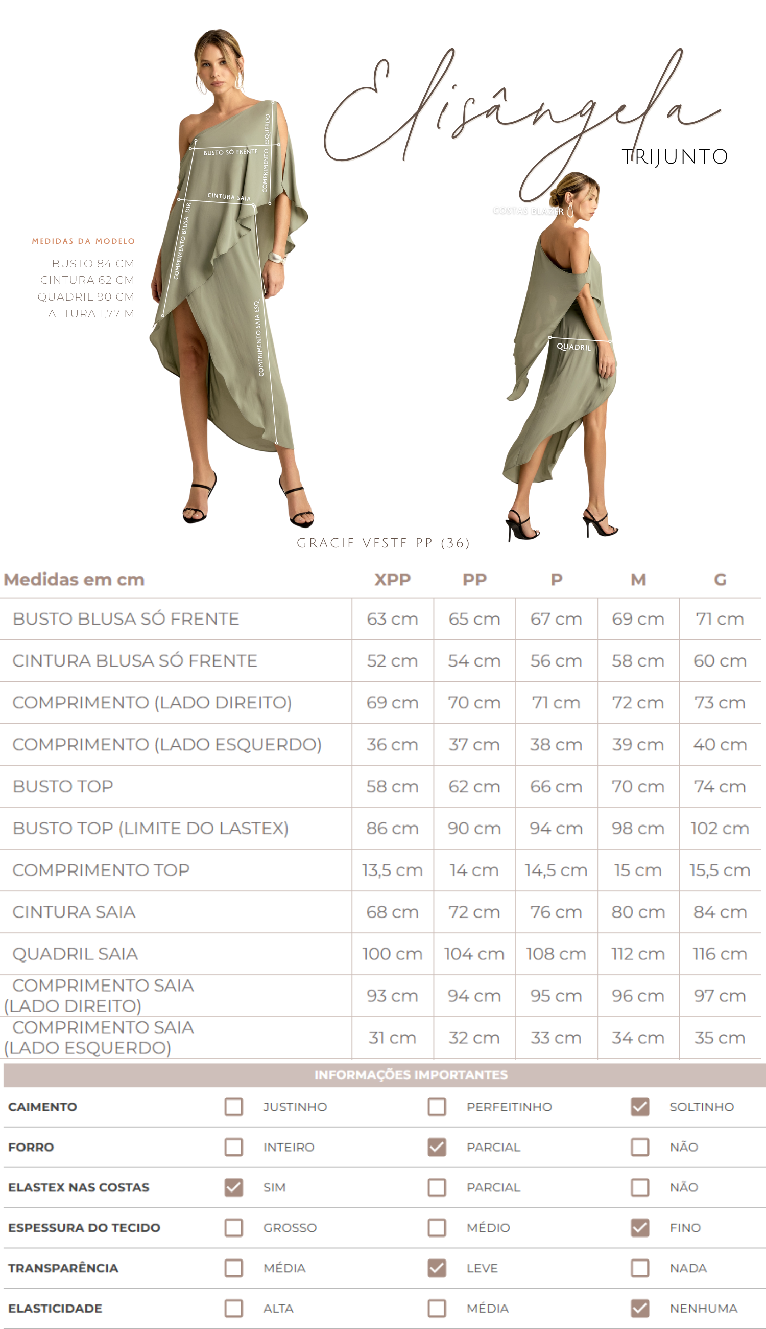 Trijunto confeccionado em crepe. A blusa tem decote ombro único regata com modelagem ampla, aberturas nas laterais, barra assimétrica e acompanha tirinha com ponteira de metal em formato de conchinha para amarrar da forma que preferir. O top possui forro, modelagem ajustada, decote reto com elástico interno e lastex nas costas para melhor ajuste ao corpo. A saia é soltinha e possui forro, fechamento lateral por zíper invisível, fenda lateral e recorte assimétrico na barra que dá todo um charme para a peça.