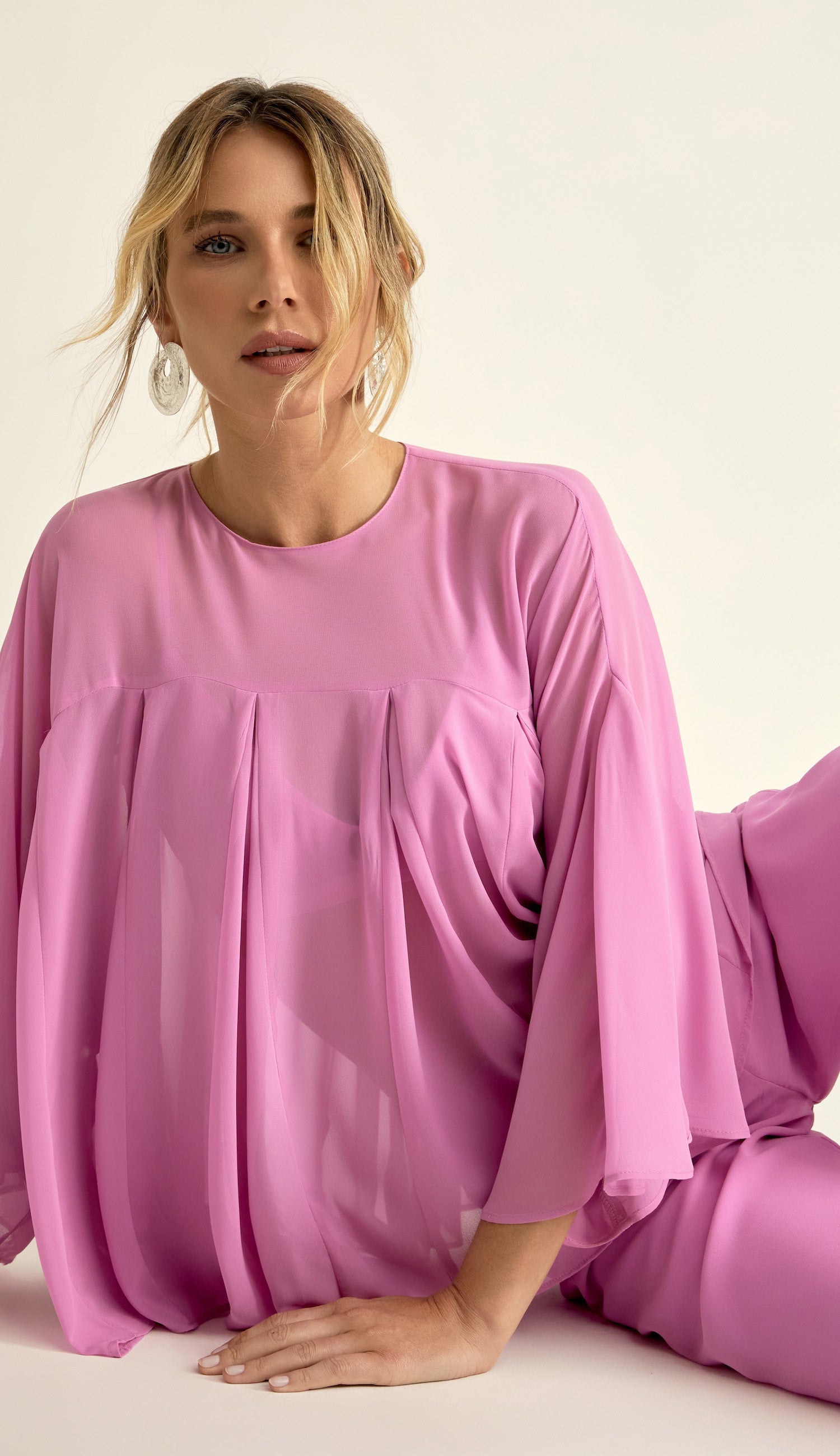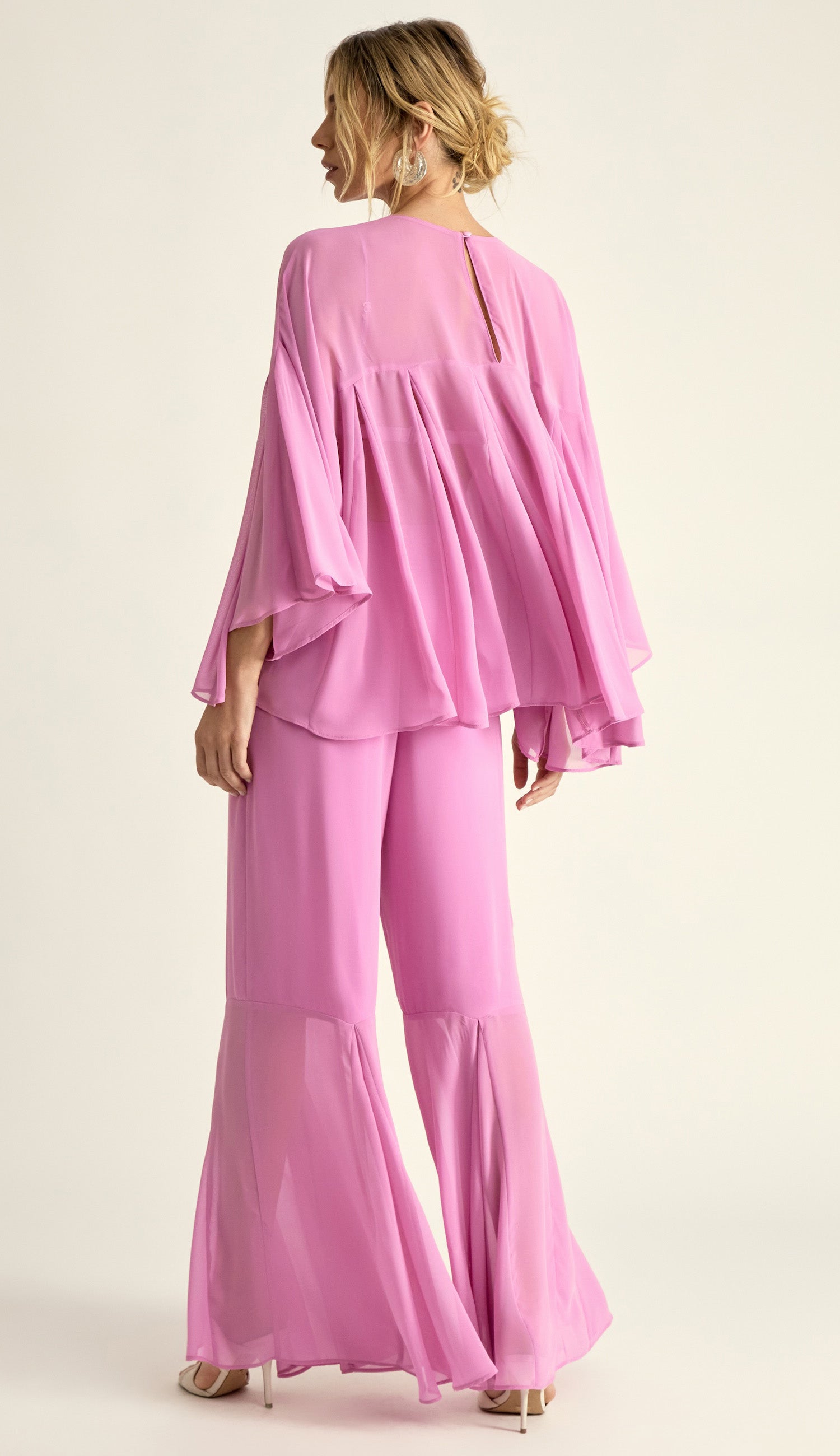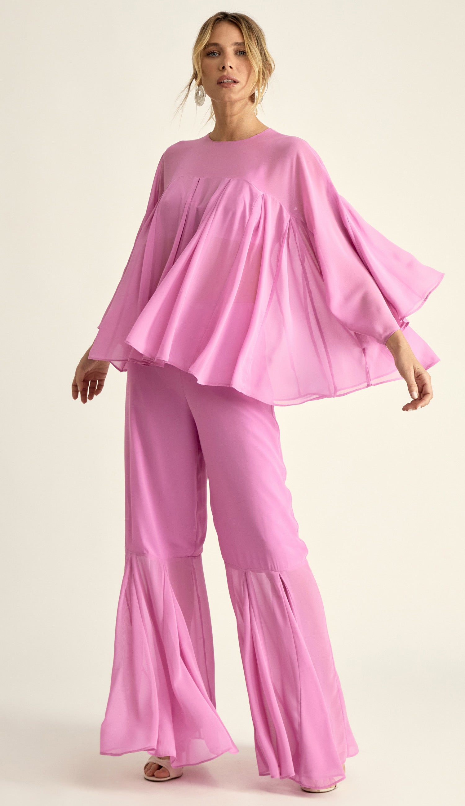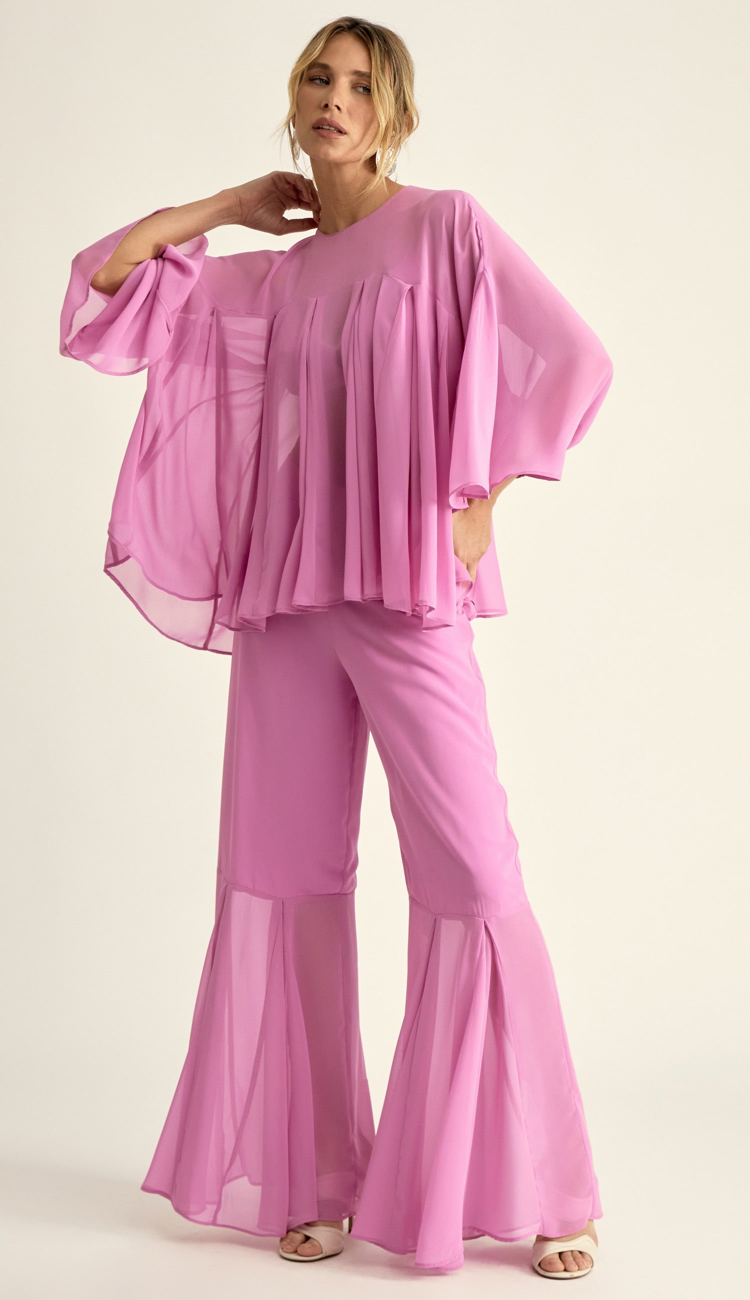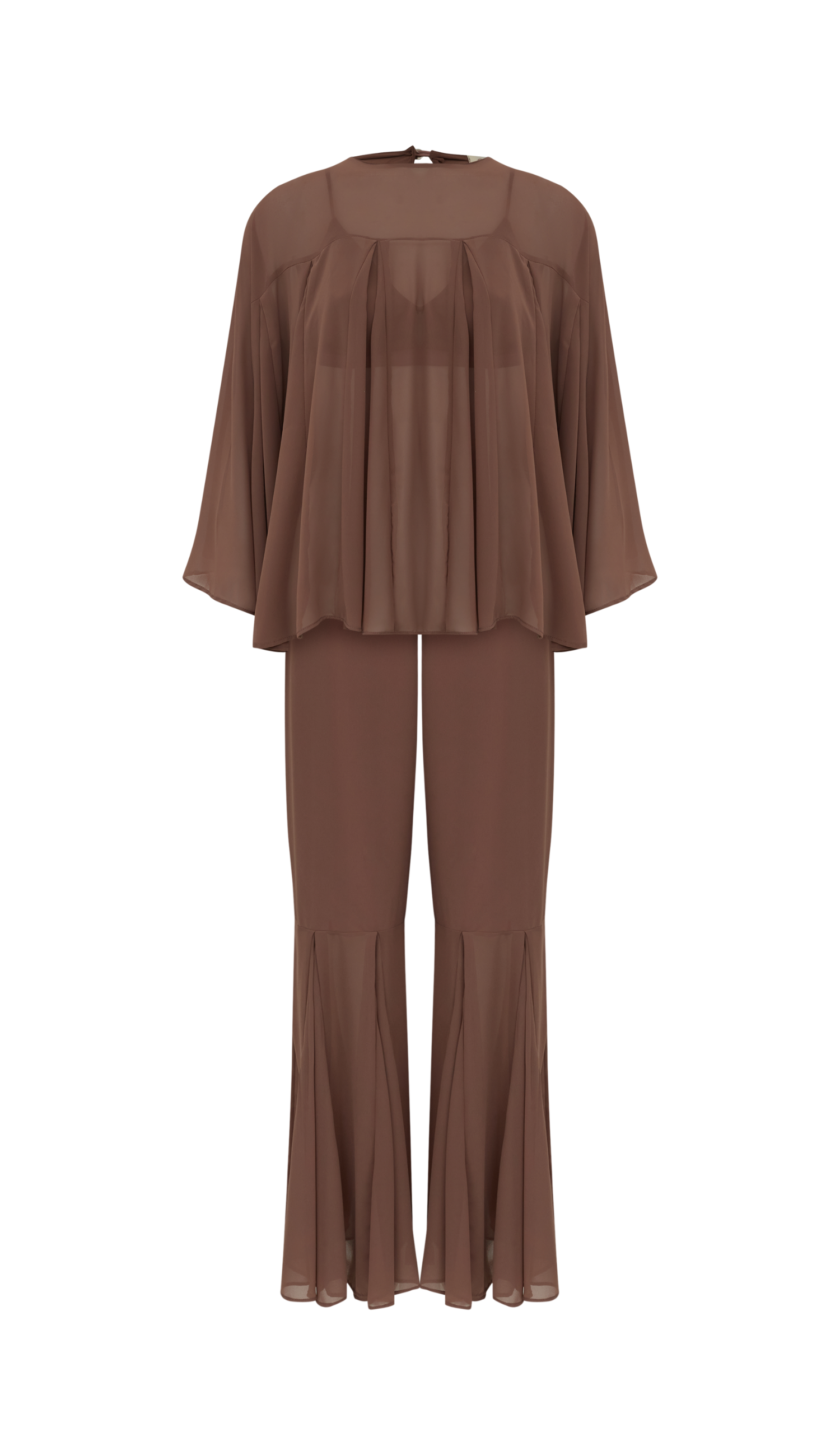 Conjunto confeccionado em crepe leve com transparência. A blusa é estilo bata, com modelagem bem ampla com recortes e nesgas que deixam a peça bem fluida; possui decote careca bem fechado, pala na região do colo do busto, mangas morcego 7/8 bem amplas e fechamento na nuca por botão esmaltado. O top por baixo da blusa é no estilo biquíni e possui forro, decote em V, alcinhas reguláveis e elástico logo abaixo do busto com regulador de metal nas costas para ajuste e fechamento. A calça é pantalona e possui forro, fechamento lateral por zíper invisível e recorte na altura da panturrilha com o mesmo detalhe de nesgas, deixando a barra bem ampla e sem forro nessa região, o que cria um visual de transparência nas pernas bem charmoso.