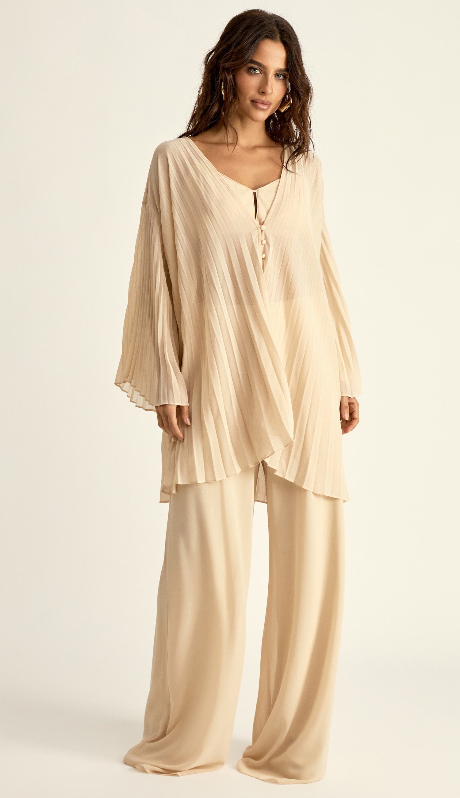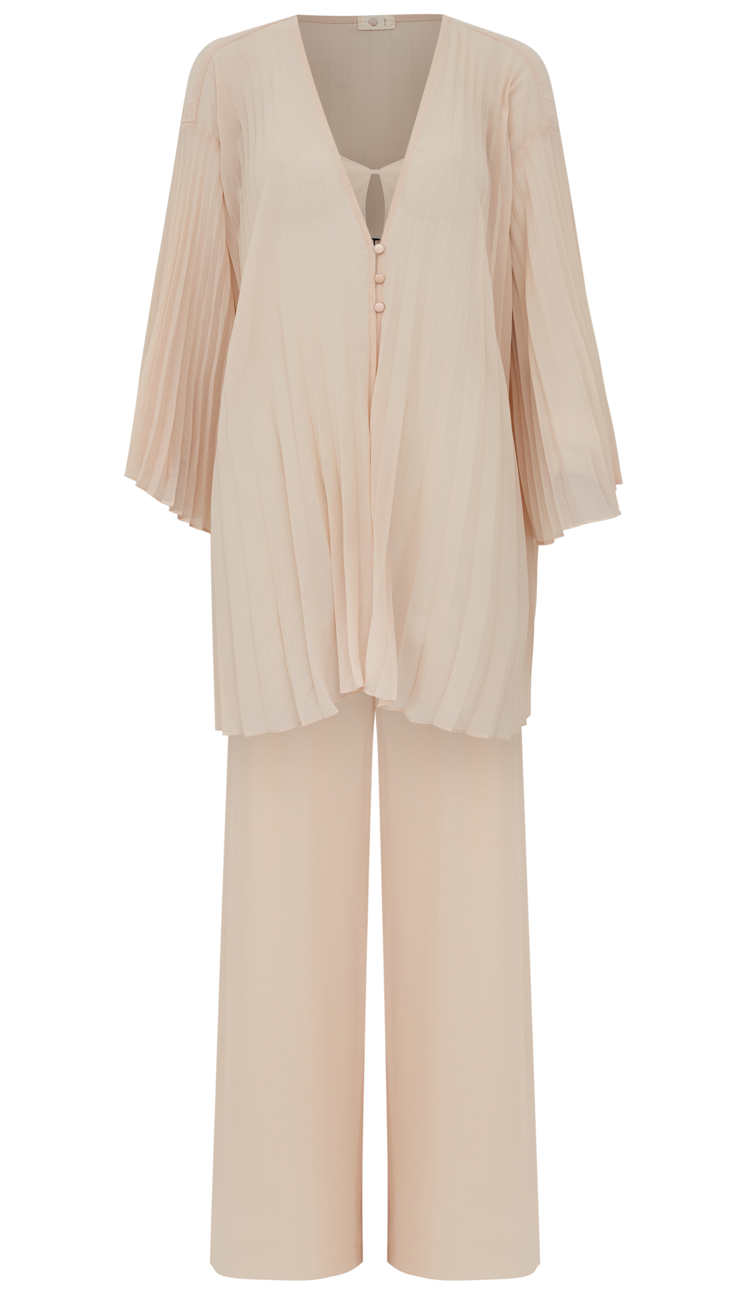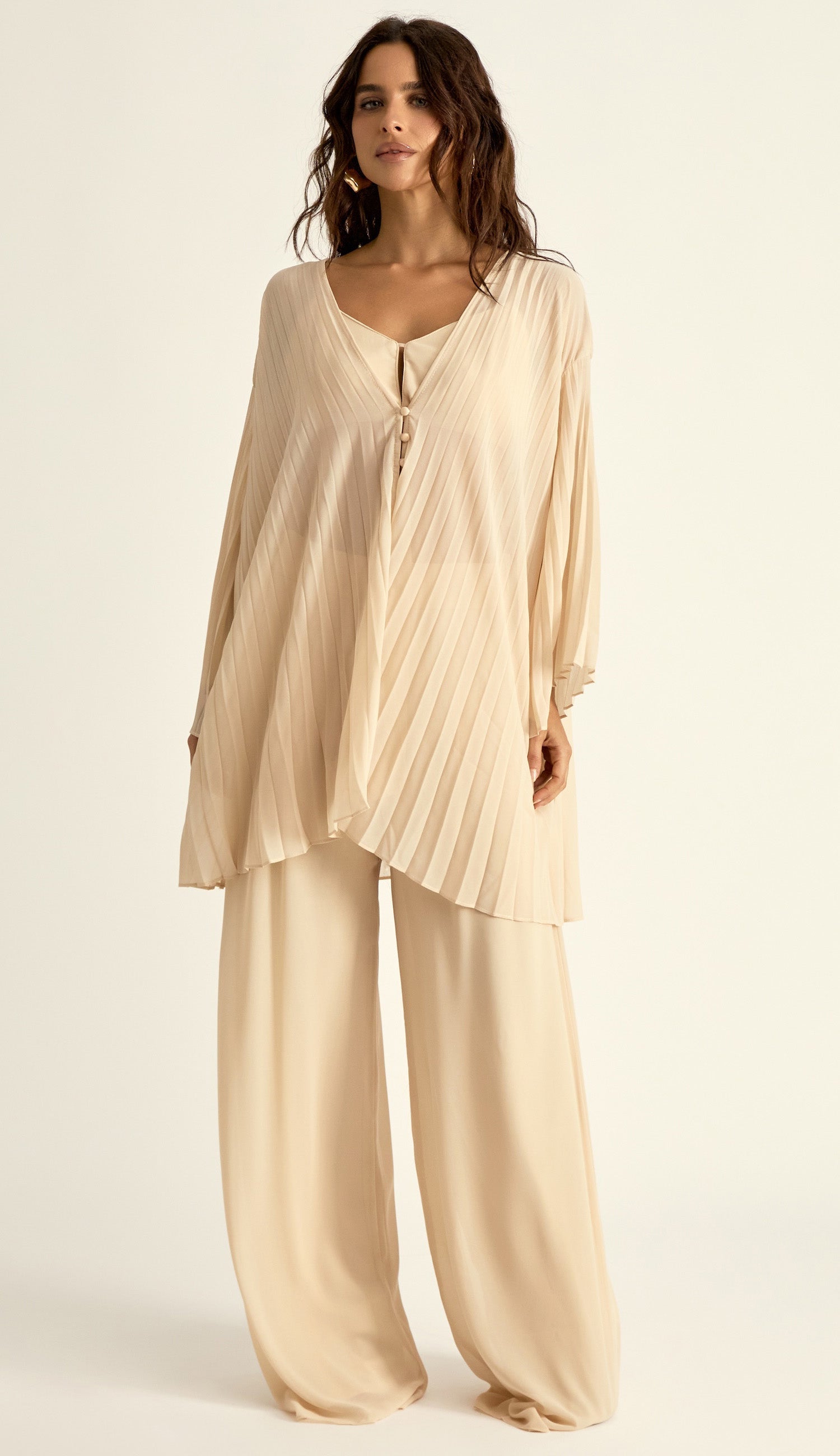 Trijunto confeccionado em crepe. O top possui forro, decote redondo, alcinhas reguláveis, elástico com franzidinhos logo abaixo do busto e fechamento traseiro por gancho de metal. A calça é pantalona e possui forro, fechamento lateral por zíper invisível e pregas frontais. O kimono é todo plissado e possui modelagem alongada e ampla, mangas sino 7/8 e fechamento frontal por botões esmaltados.
