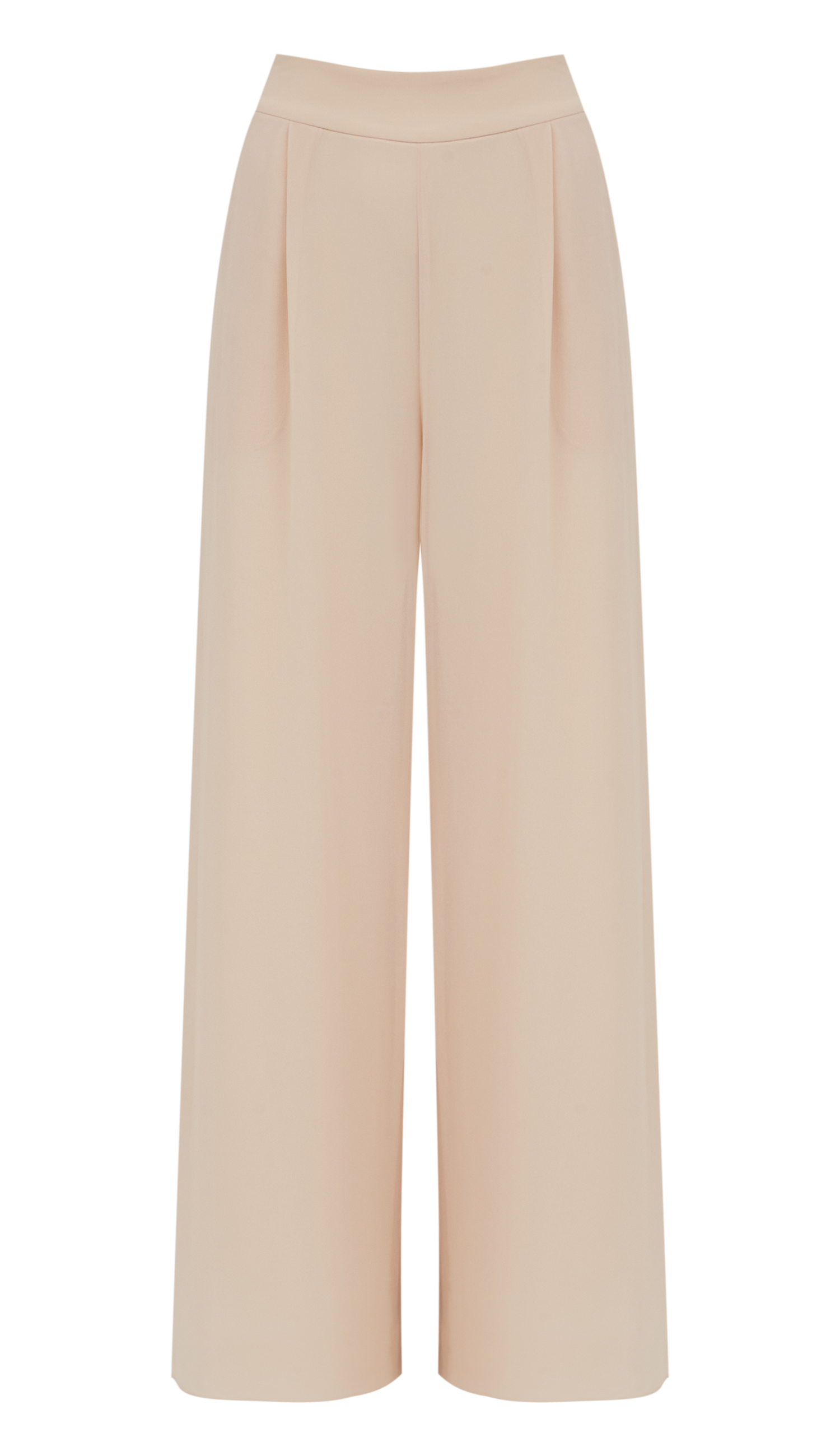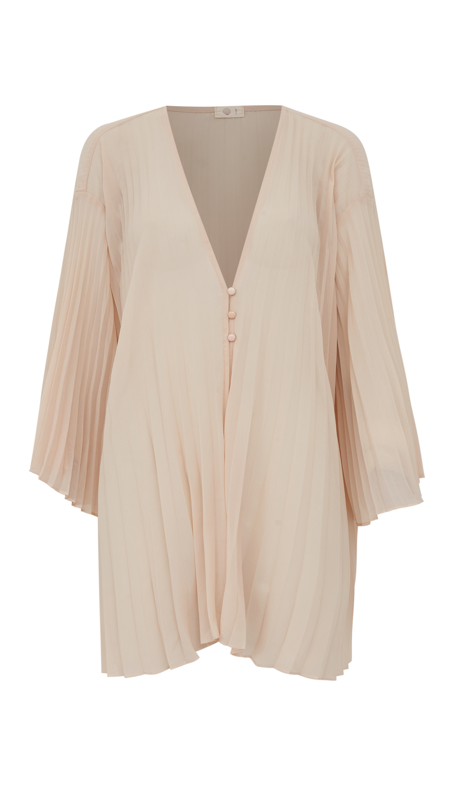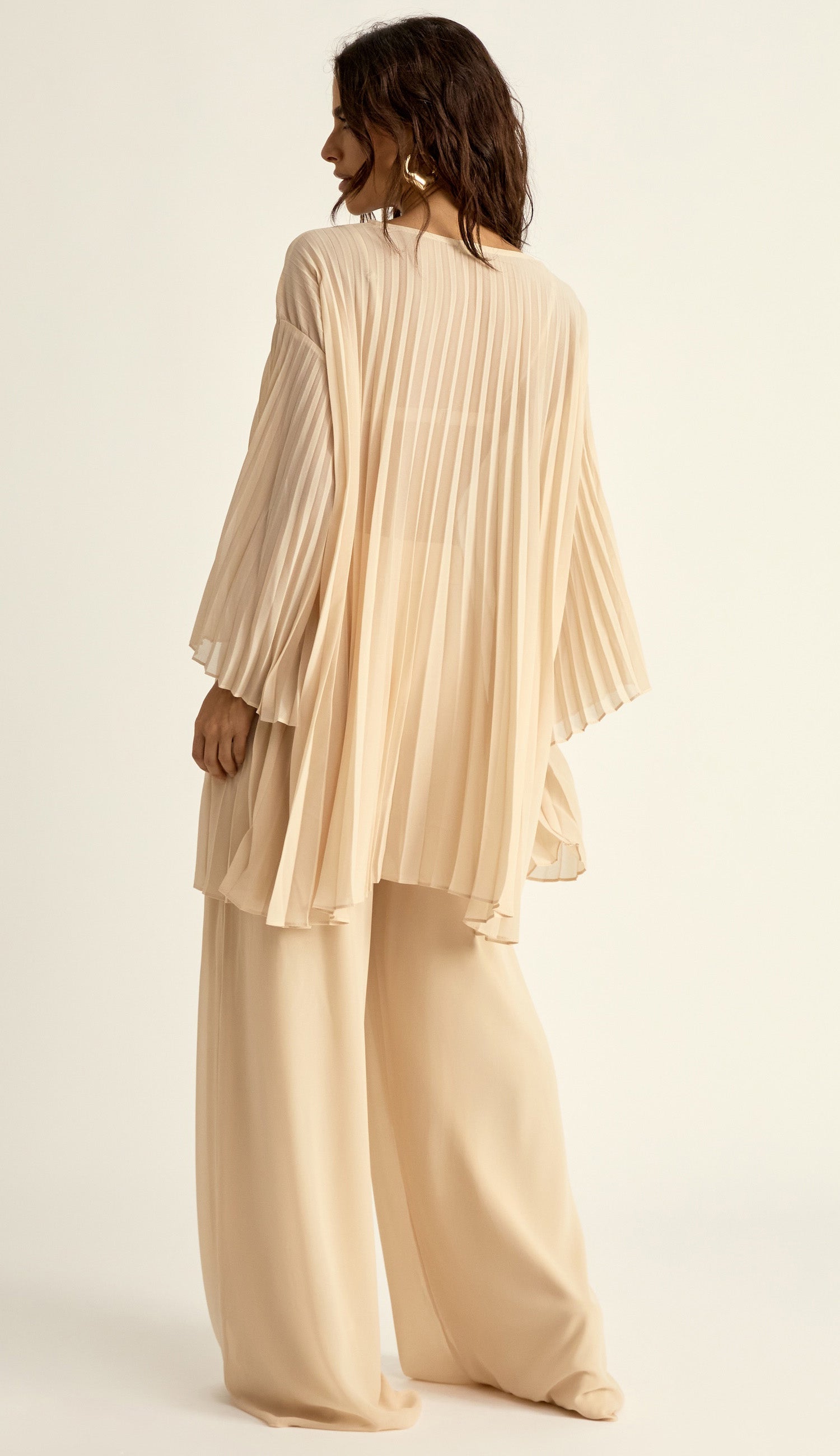 Trijunto confeccionado em crepe. O top possui forro, decote redondo, alcinhas reguláveis, elástico com franzidinhos logo abaixo do busto e fechamento traseiro por gancho de metal. A calça é pantalona e possui forro, fechamento lateral por zíper invisível e pregas frontais. O kimono é todo plissado e possui modelagem alongada e ampla, mangas sino 7/8 e fechamento frontal por botões esmaltados.