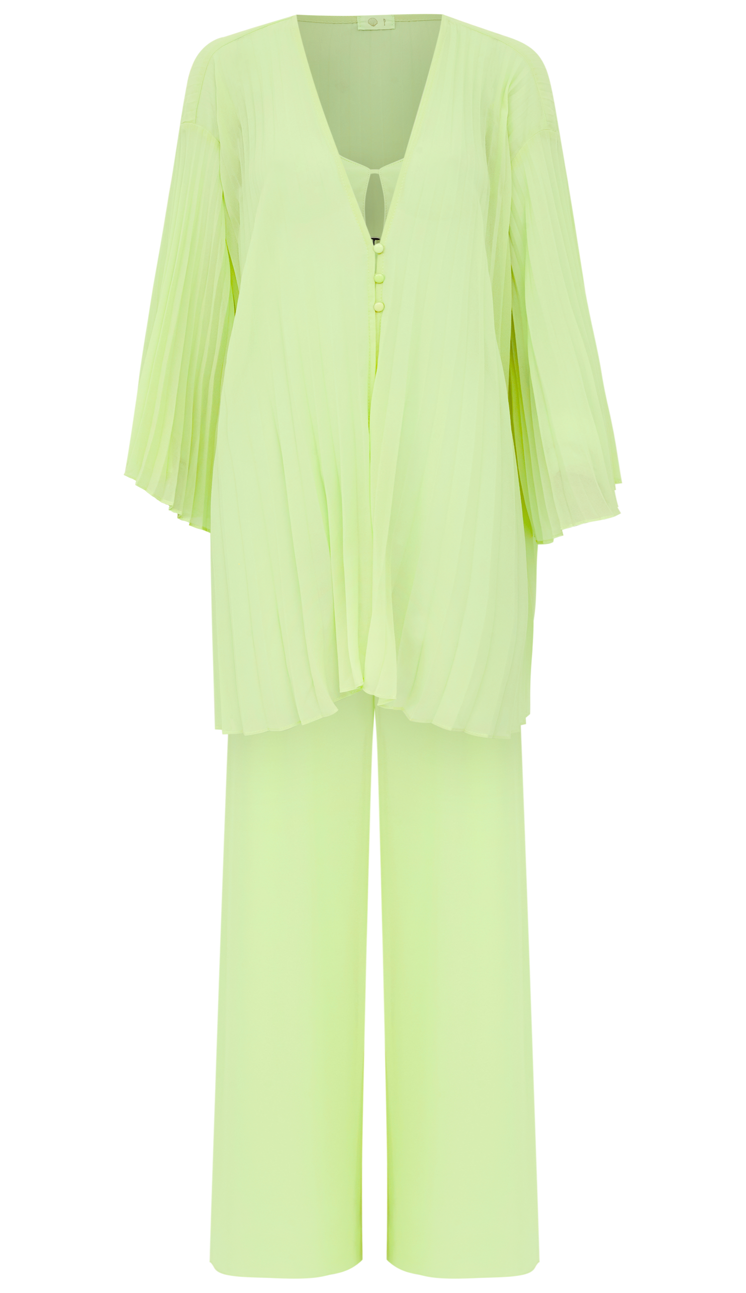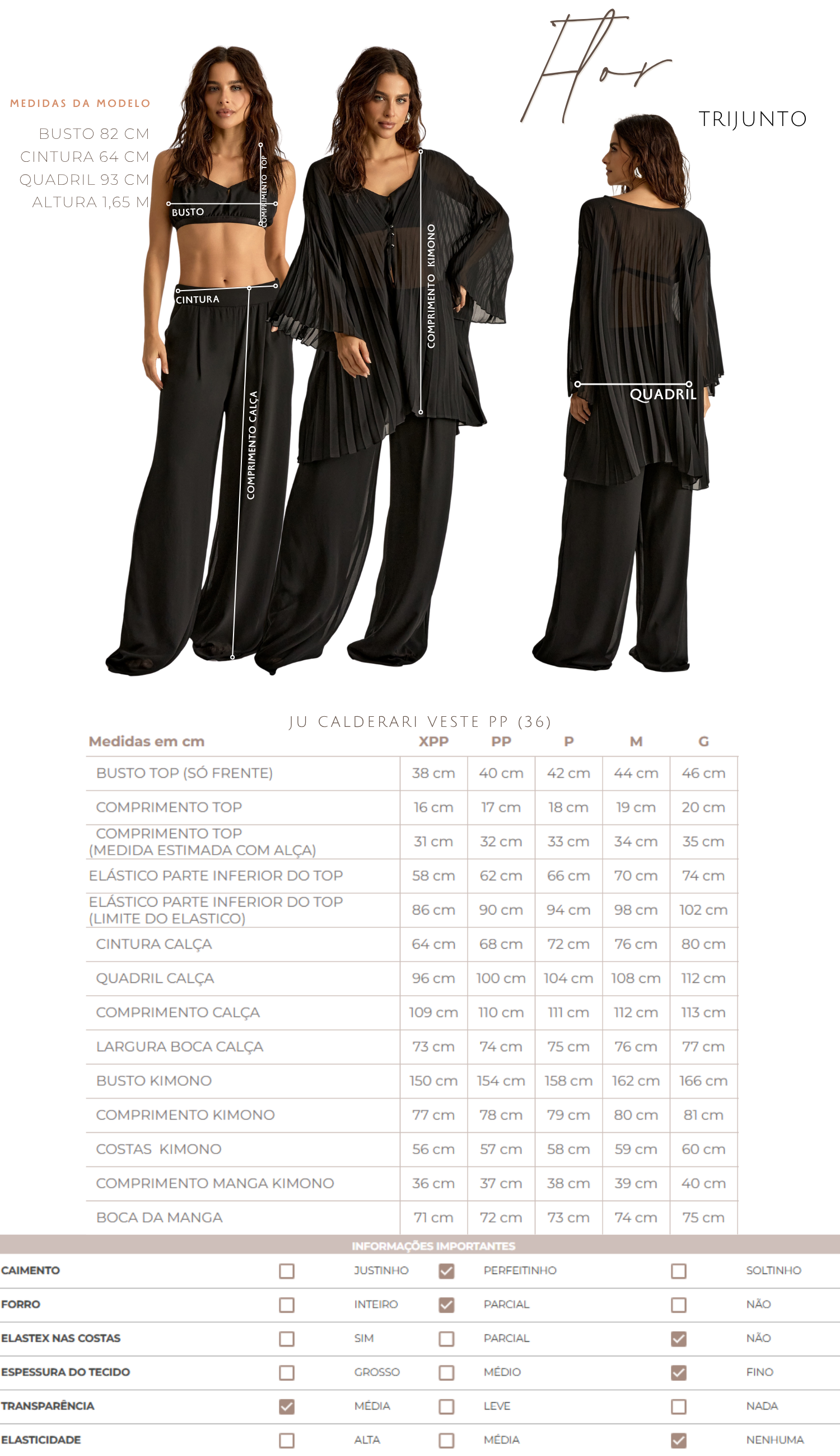 Trijunto confeccionado em crepe. O top possui forro, decote redondo, alcinhas reguláveis, elástico com franzidinhos logo abaixo do busto e fechamento traseiro por gancho de metal. A calça é pantalona e possui forro, fechamento lateral por zíper invisível e pregas frontais. O kimono é todo plissado e possui modelagem alongada e ampla, mangas sino 7/8 e fechamento frontal por botões esmaltados.