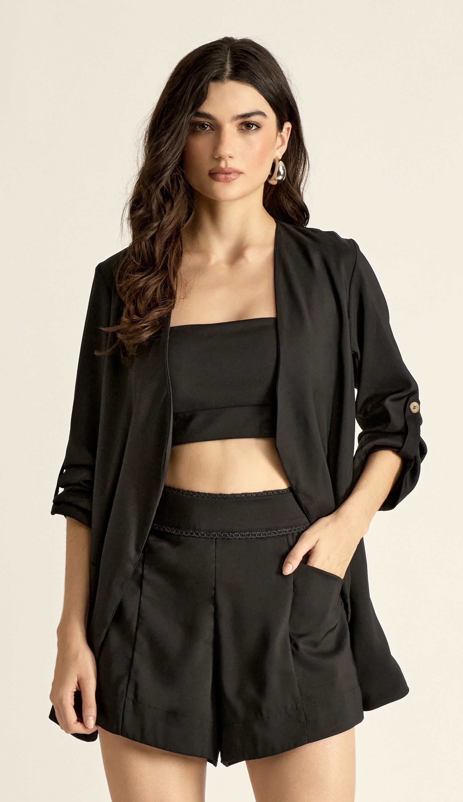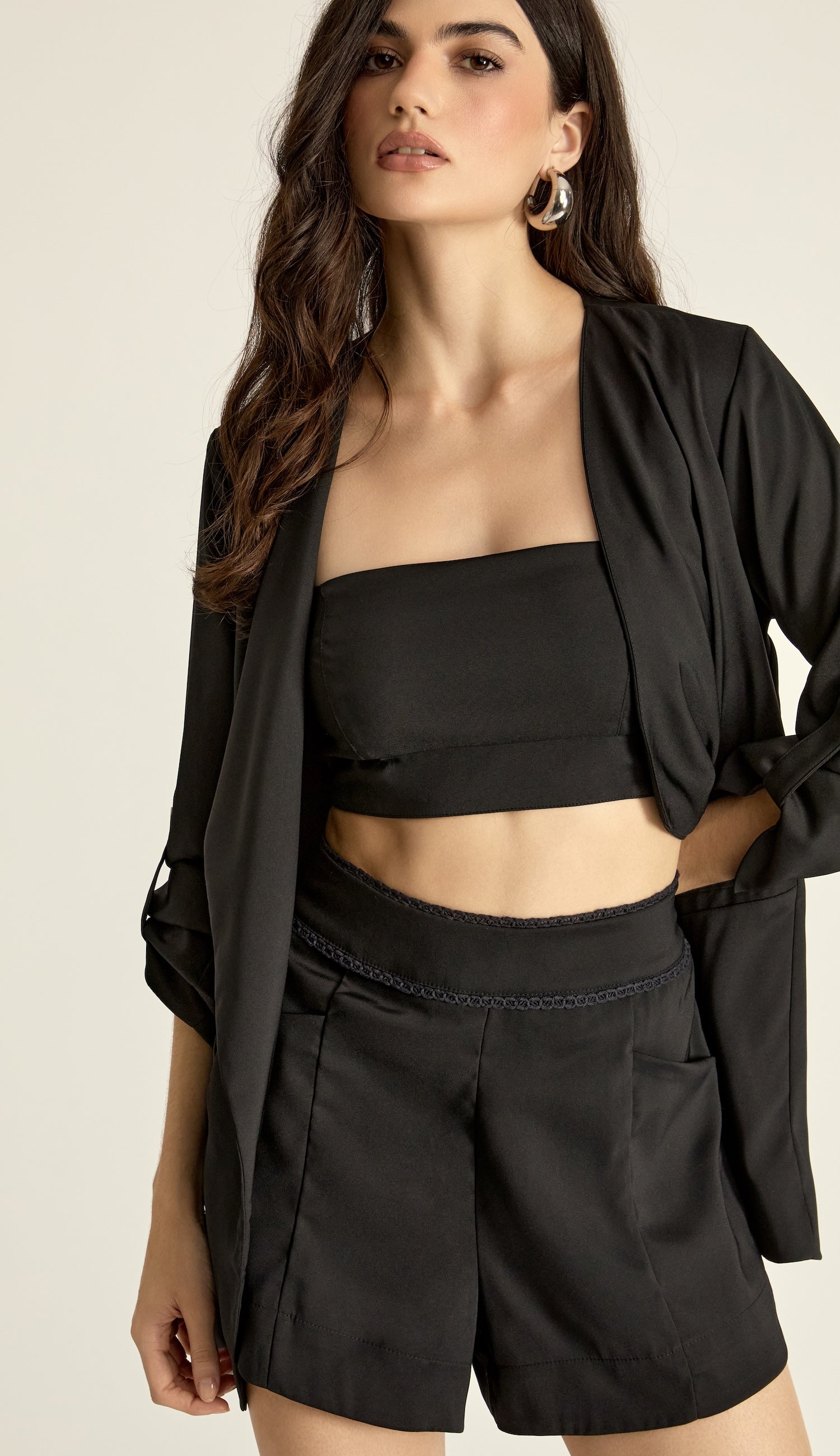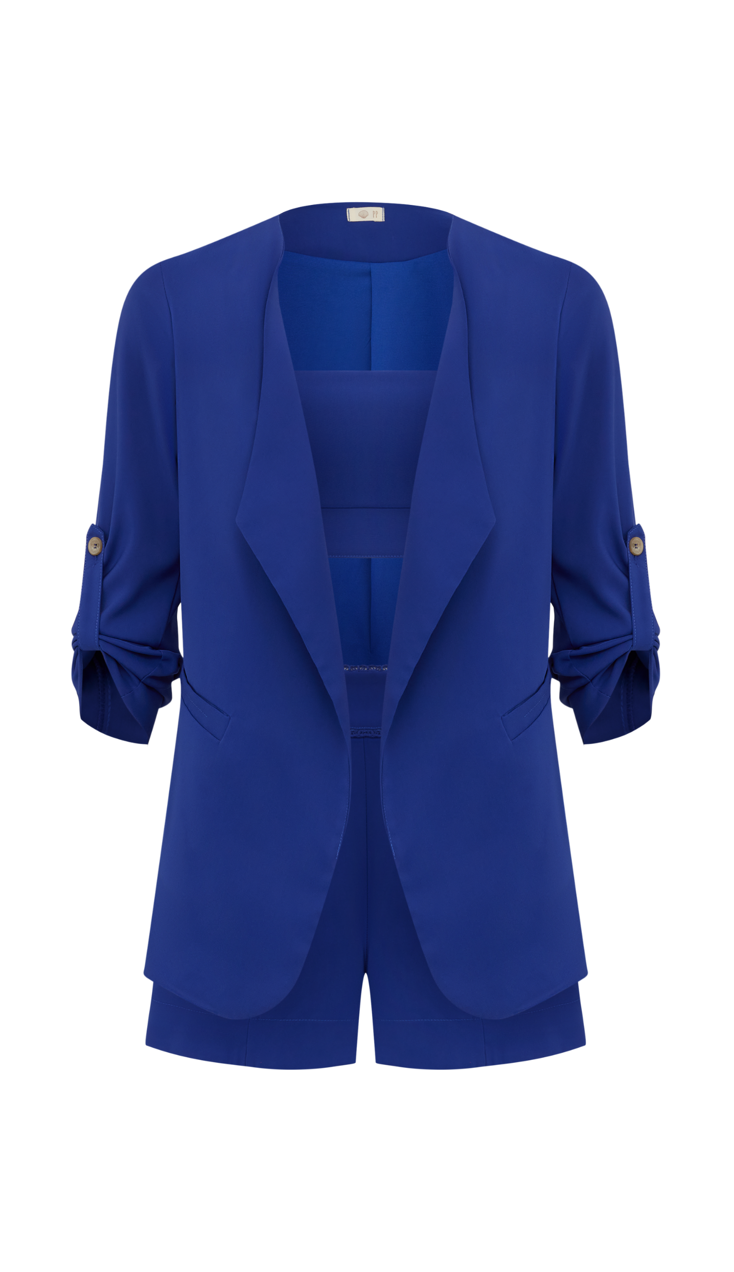 Trijunto confeccionado em alfaiataria com forro. O top possui decote reto, pala abaixo do busto, lastex franzido nas costas para melhor ajuste ao corpo e alcinhas reguláveis. O shorts possui bolsos laterais, aplicação de rendinha em linha no cós, vincos frontais e fechamento lateral por zíper invisível. O blazer possui modelagem alongada e aberta, frente sem fechamento com ponta na lapela que fica super charmosa dobrada, bolsos laterais e mangas longas com martingale e botão fosco rajado para ajuste do comprimento.