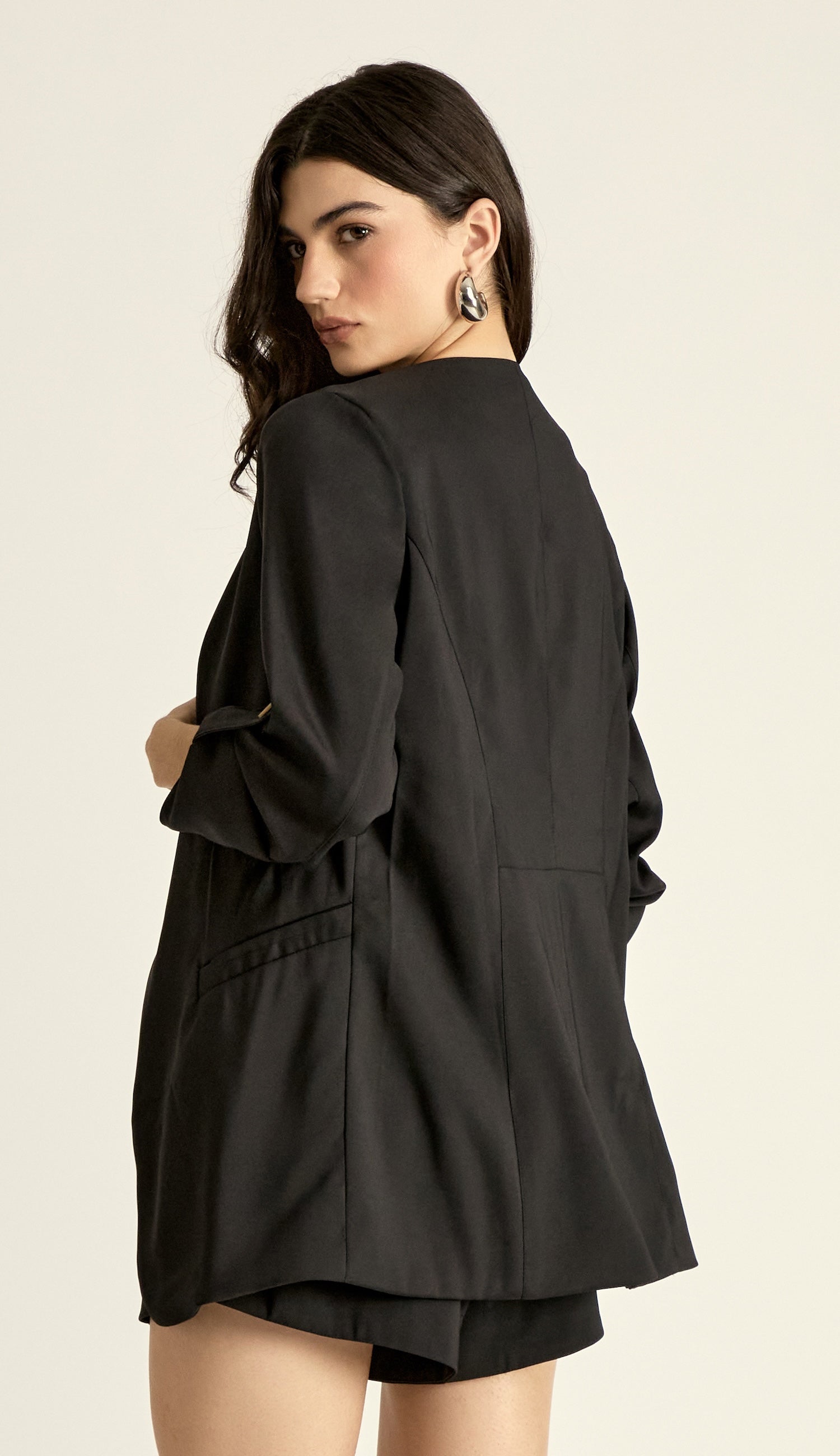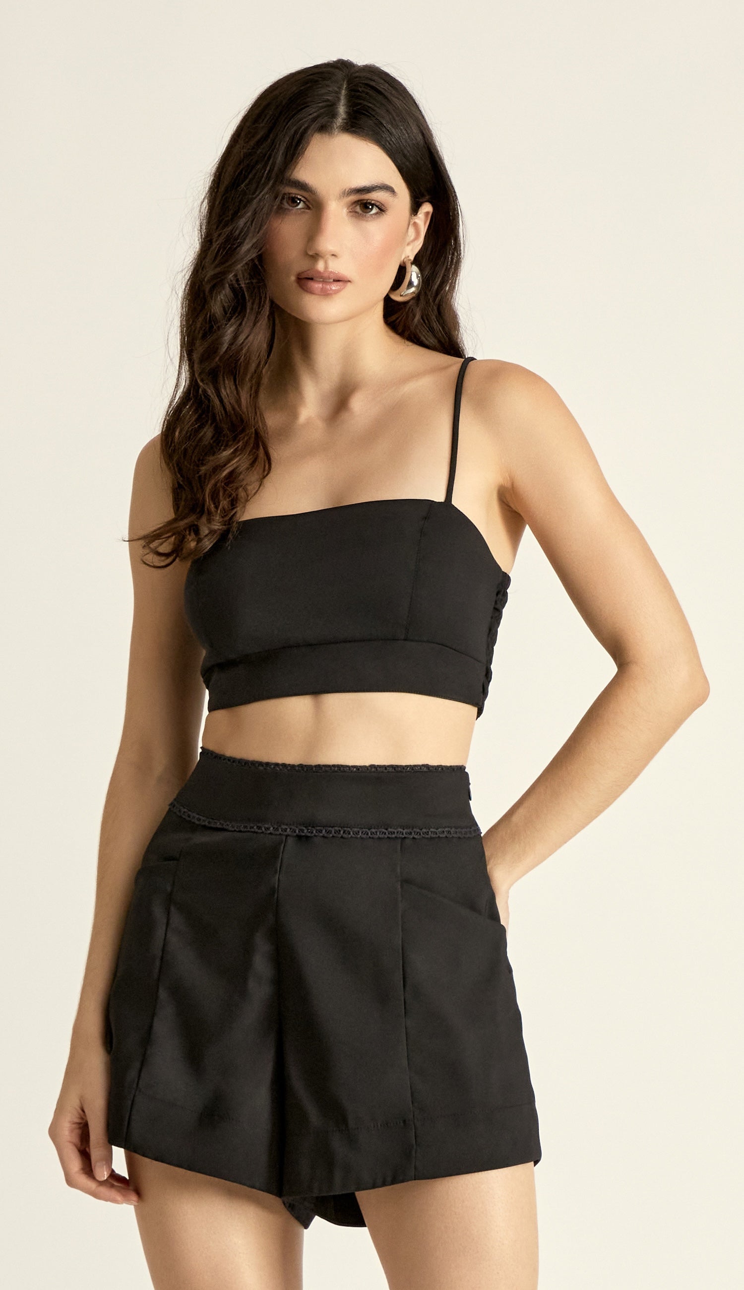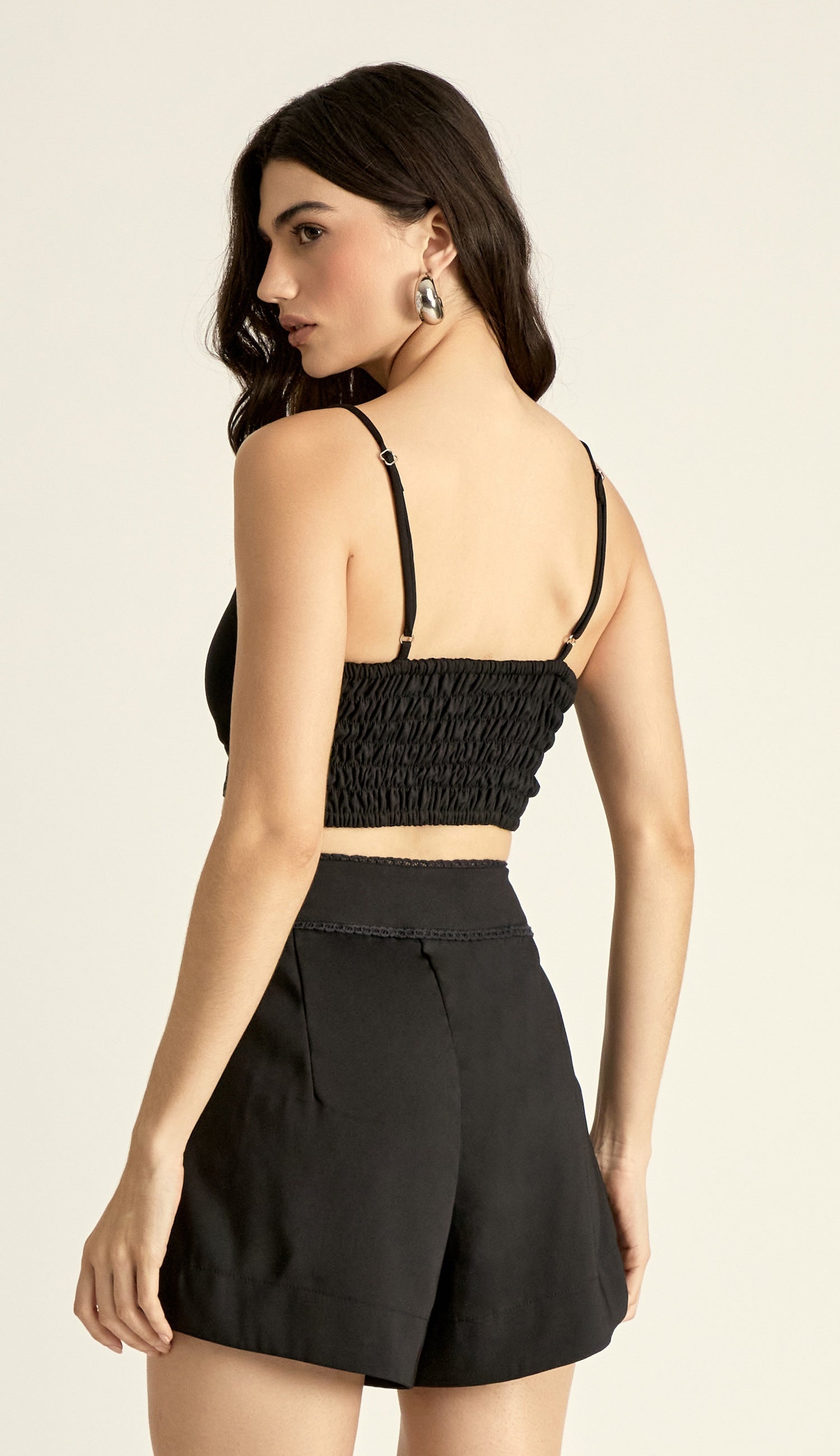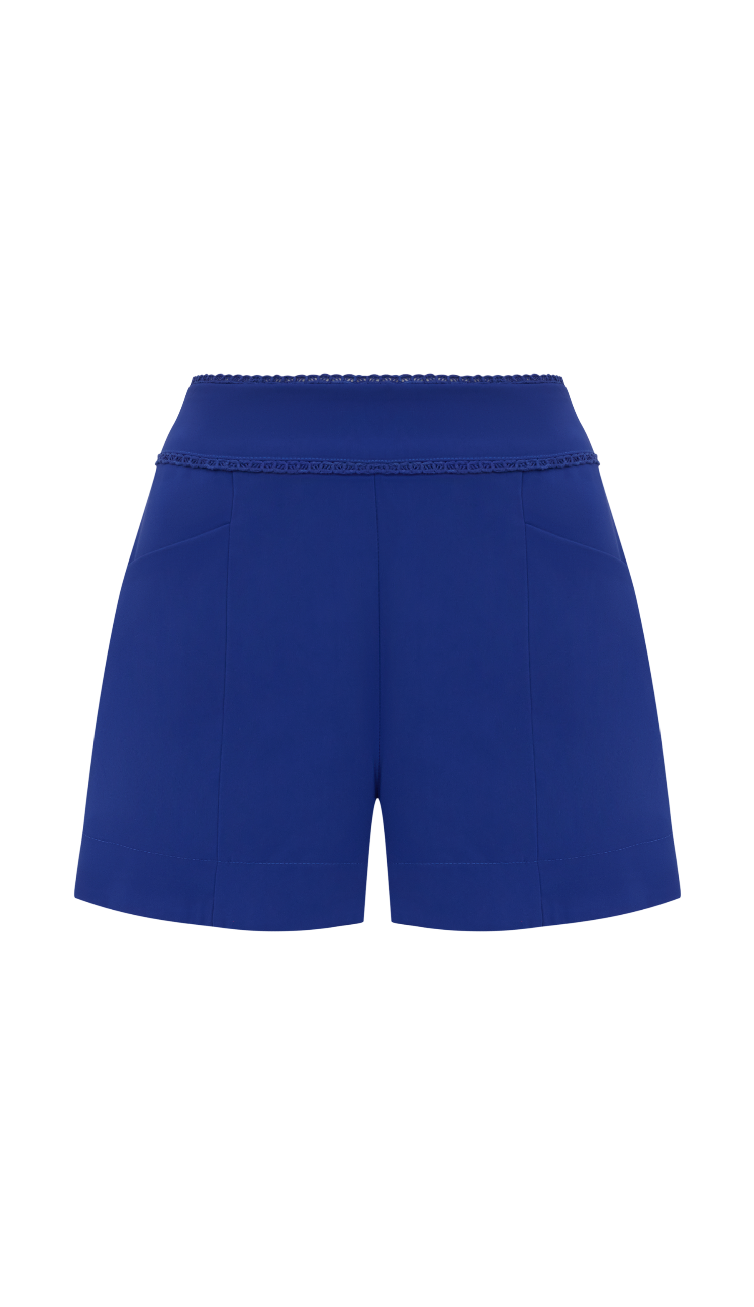 Trijunto confeccionado em alfaiataria com forro. O top possui decote reto, pala abaixo do busto, lastex franzido nas costas para melhor ajuste ao corpo e alcinhas reguláveis. O shorts possui bolsos laterais, aplicação de rendinha em linha no cós, vincos frontais e fechamento lateral por zíper invisível. O blazer possui modelagem alongada e aberta, frente sem fechamento com ponta na lapela que fica super charmosa dobrada, bolsos laterais e mangas longas com martingale e botão fosco rajado para ajuste do comprimento.