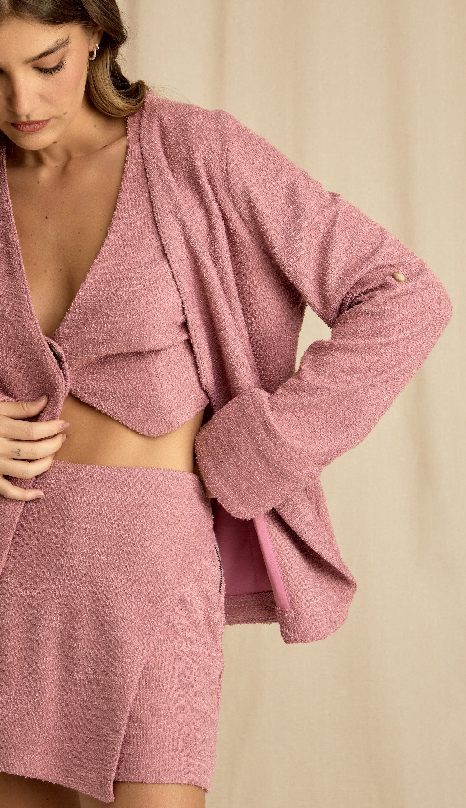 Trijunto com forro confeccionado em malha com aspecto tweed. O colete cropped possui decote em V, fechamento frontal por botõezinhos foscos rajados, alças cruzadas nas costas com elástico franzido embutido e recortes que modelam a peça. O shorts saia possui sobreposição de tecido com recorte assimétrico na frente, bolsos traseiros e fechamento lateral por zíper de metal com pingente que tem o detalhe da conchinha da Laguna gravada no metal. O blazer é aberto, sem fechamento e possui lapela na gola com ponta que fica super charmosa dobrada, conta também com recortes que modelam a peça e mangas longas com martingale e botãozinho fosco rajado para ajuste do comprimento.