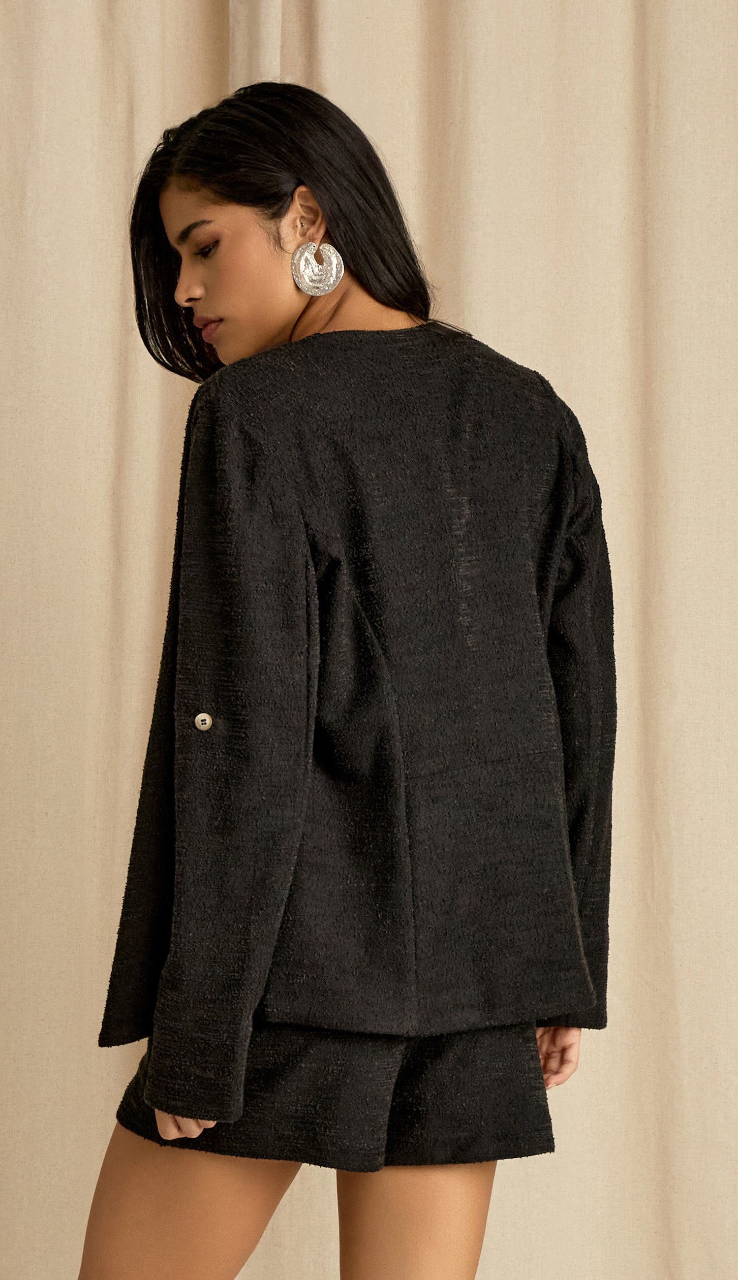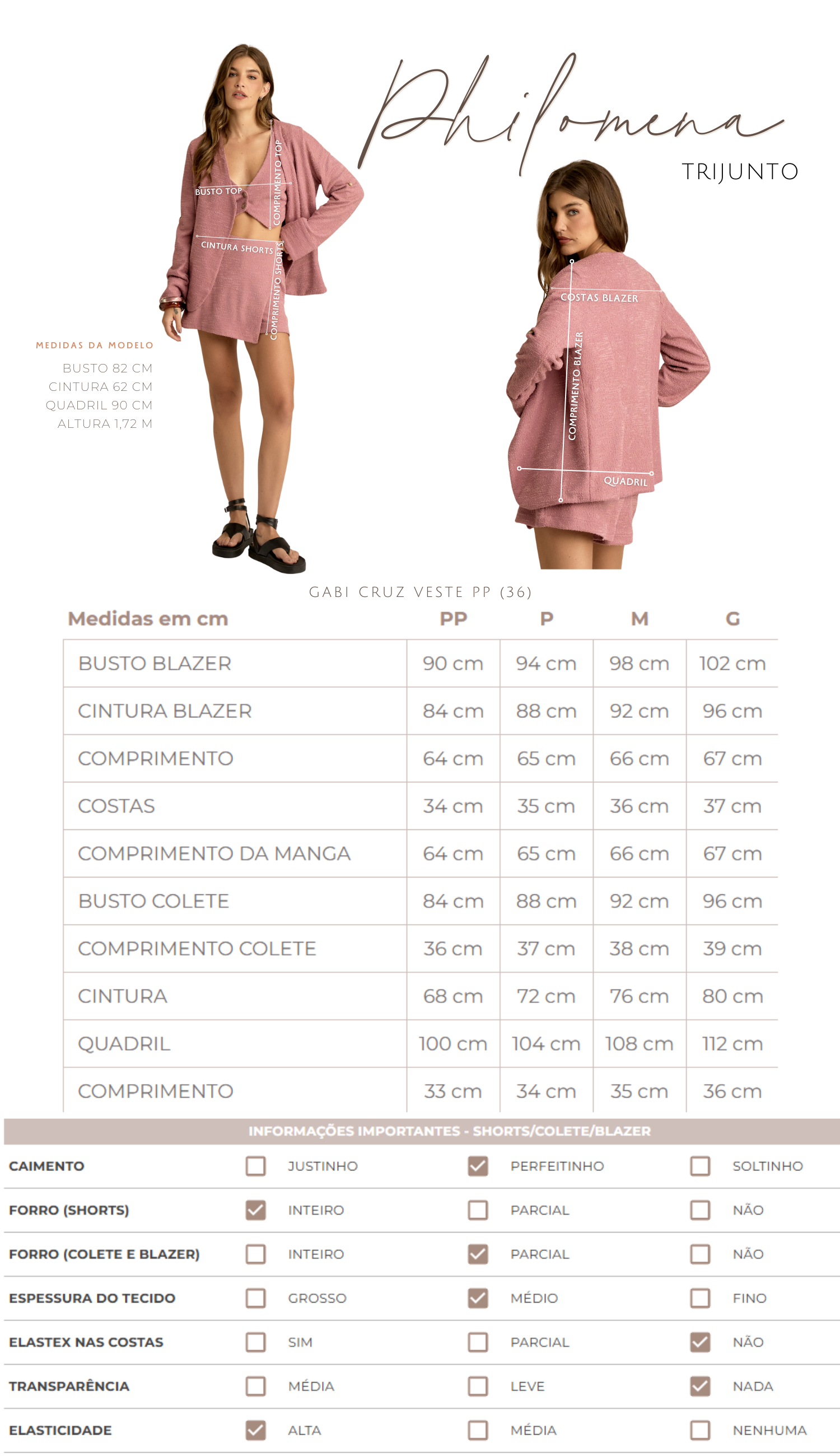 Trijunto com forro confeccionado em malha com aspecto tweed. O colete cropped possui decote em V, fechamento frontal por botõezinhos foscos rajados, alças cruzadas nas costas com elástico franzido embutido e recortes que modelam a peça. O shorts saia possui sobreposição de tecido com recorte assimétrico na frente, bolsos traseiros e fechamento lateral por zíper de metal com pingente que tem o detalhe da conchinha da Laguna gravada no metal. O blazer é aberto, sem fechamento e possui lapela na gola com ponta que fica super charmosa dobrada, conta também com recortes que modelam a peça e mangas longas com martingale e botãozinho fosco rajado para ajuste do comprimento.