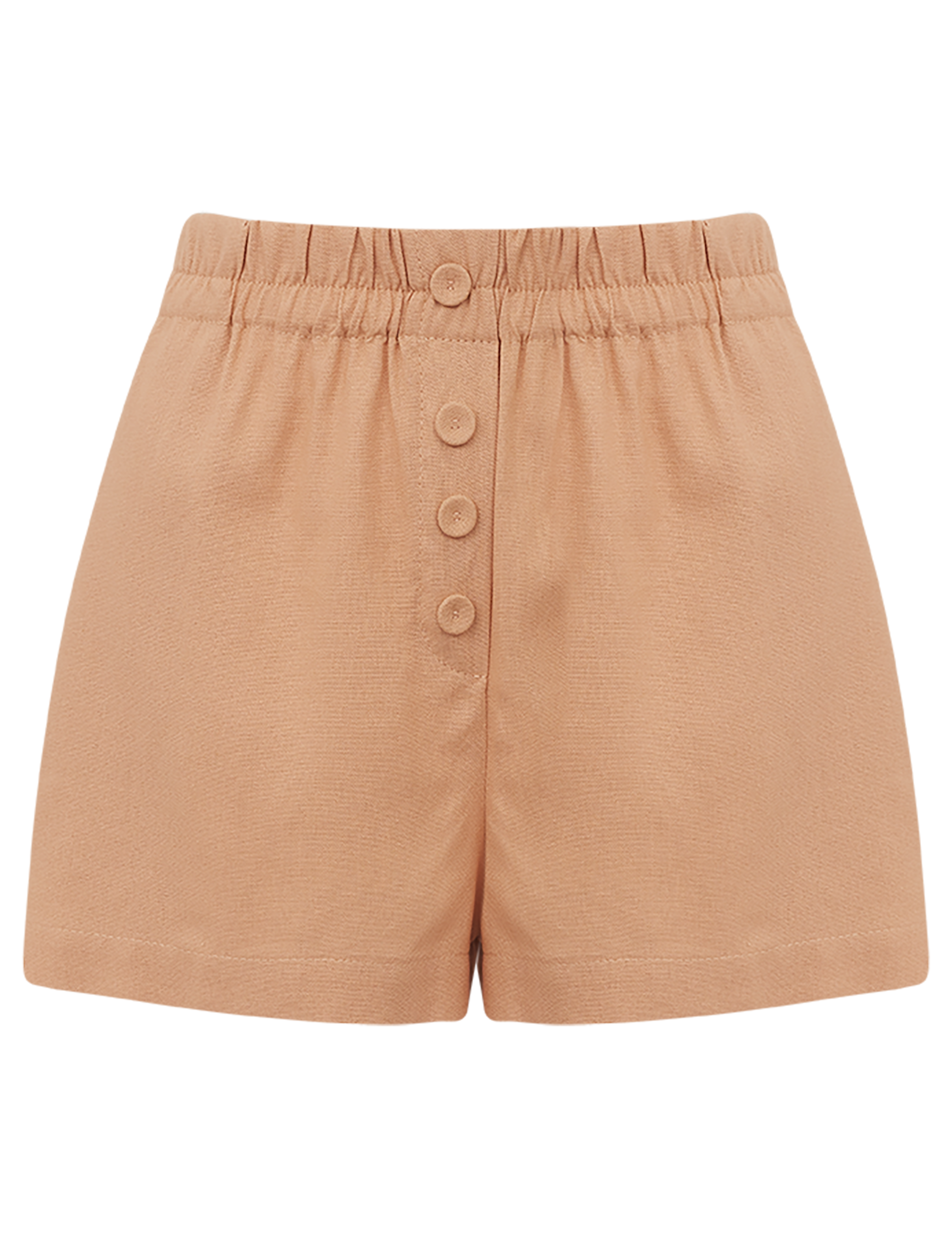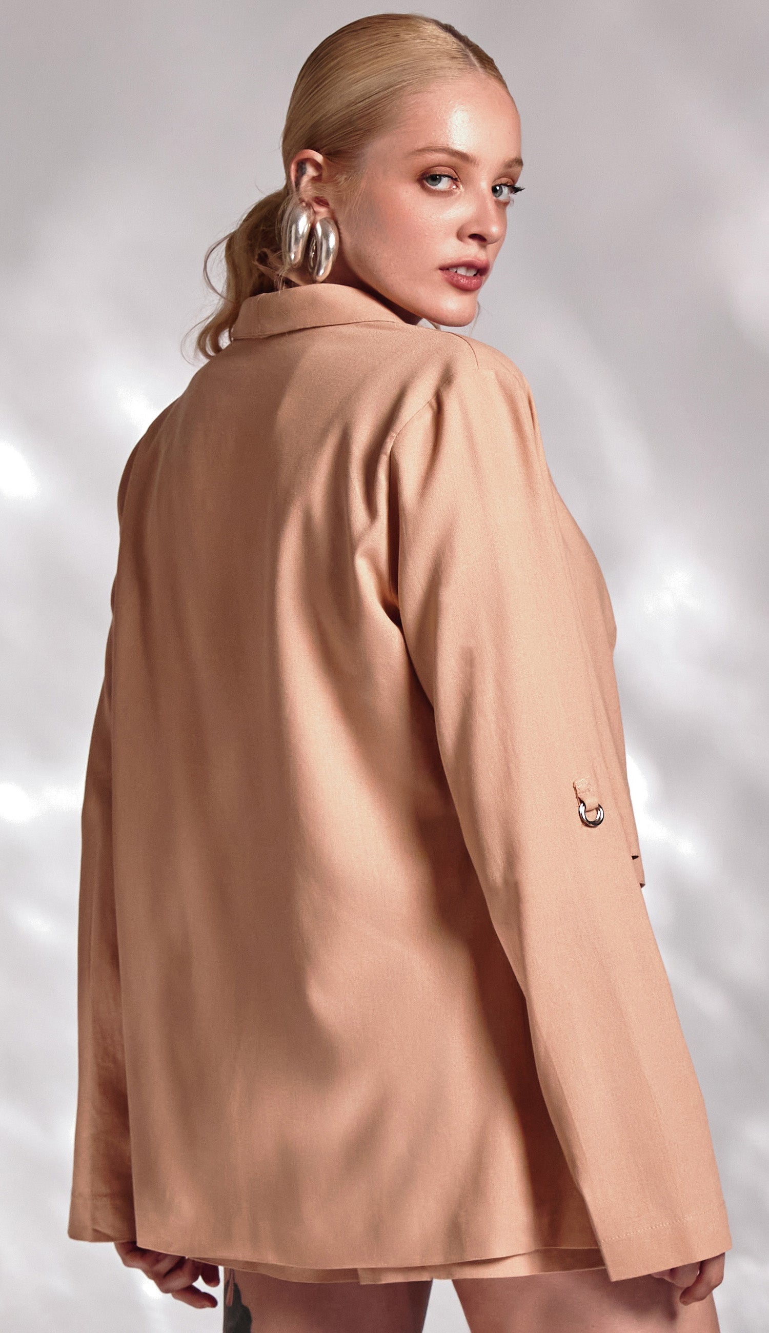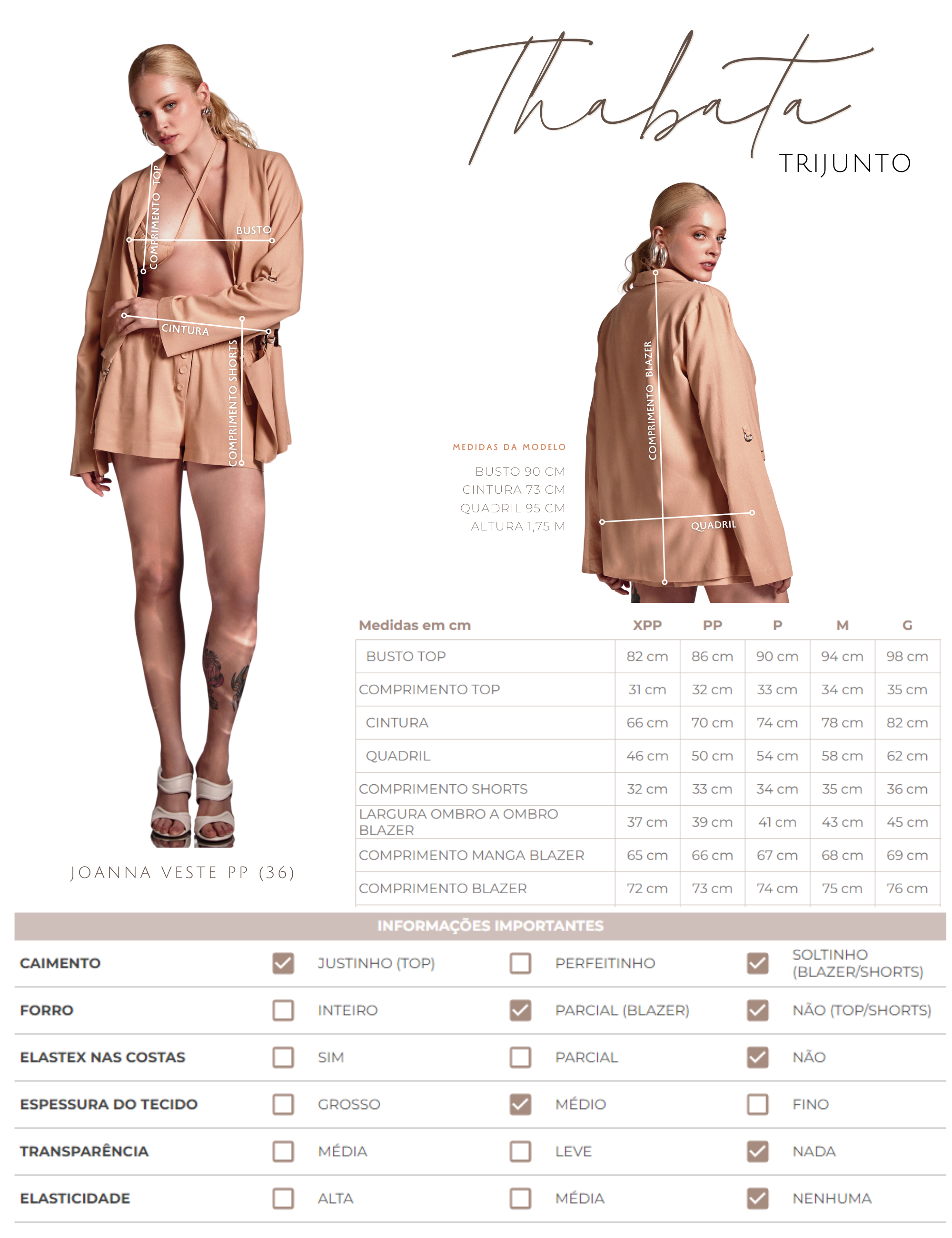 Trijunto confeccionado em linho mais encorpado. O top possui elástico franzido nas costas, decote aberto, com alças finas que passam pelo centro do busto para ajuste e amarração frontal no fechamento da peça, além de contar com elástico fininho interno levemente franzido abaixo do busto. O shorts possui cós em elástico mais grosso franzido, botõezinhos forrados de enfeite na frente, bolsos laterais e pernas soltinhas. O blazer possui forro, modelagem soltinha e alongada, lapelas dobradas na gola, mangas longas com martingale com ajuste das mangas por argolinhas de metal com tirinha, fechamento frontal por um único botão forrado e o charme dos recortes vazados frontais com detalhe de tirinhas e argolas de metal.