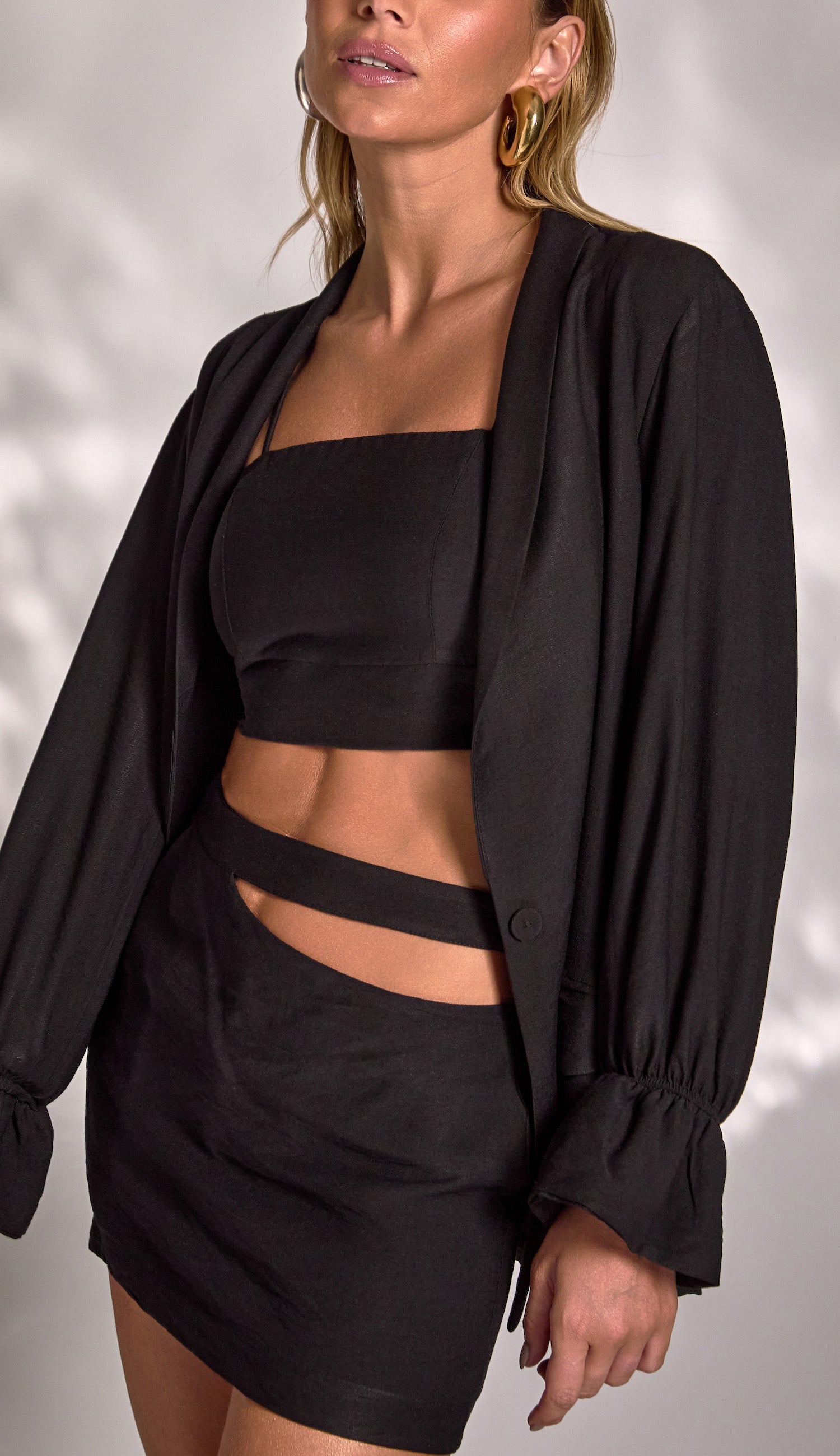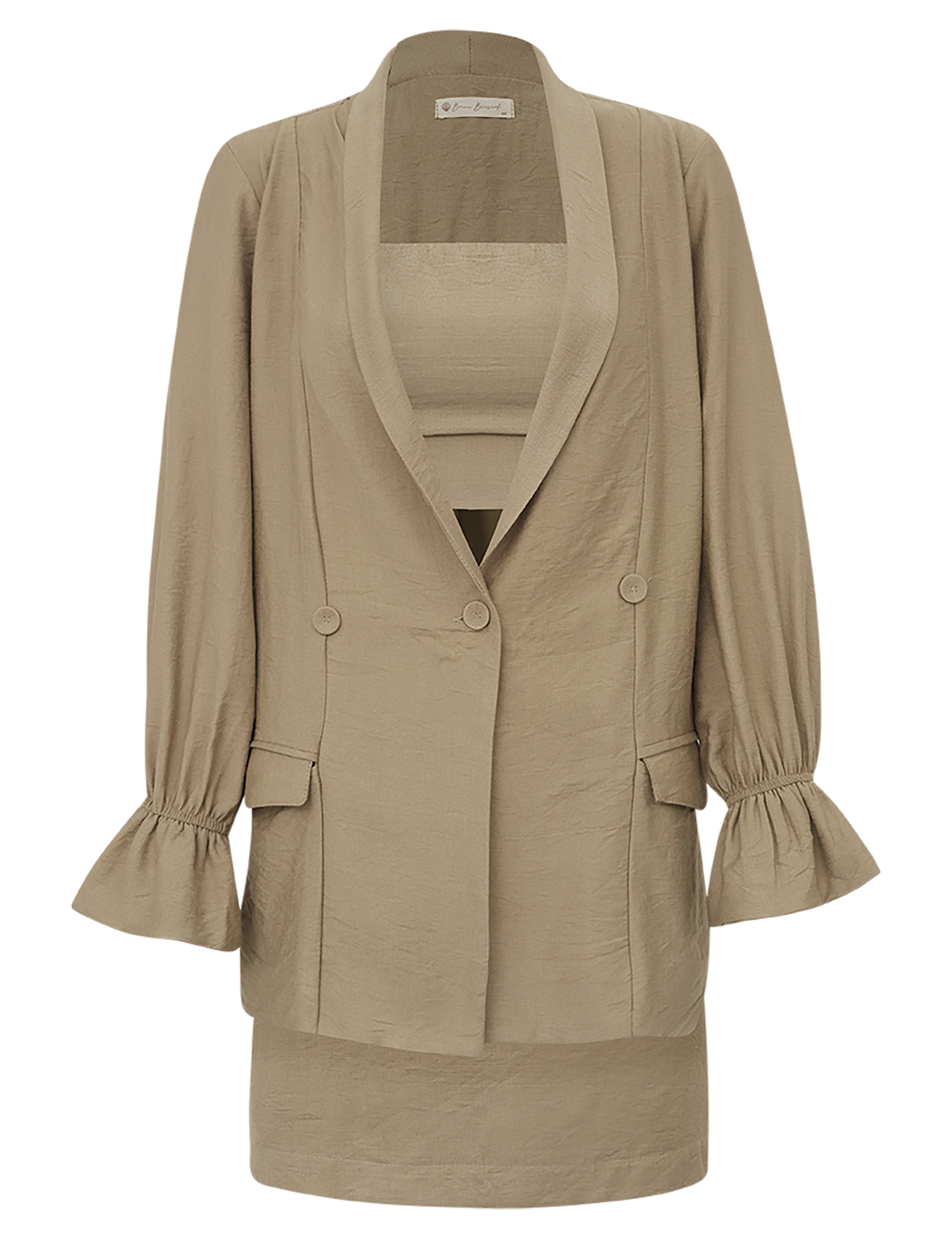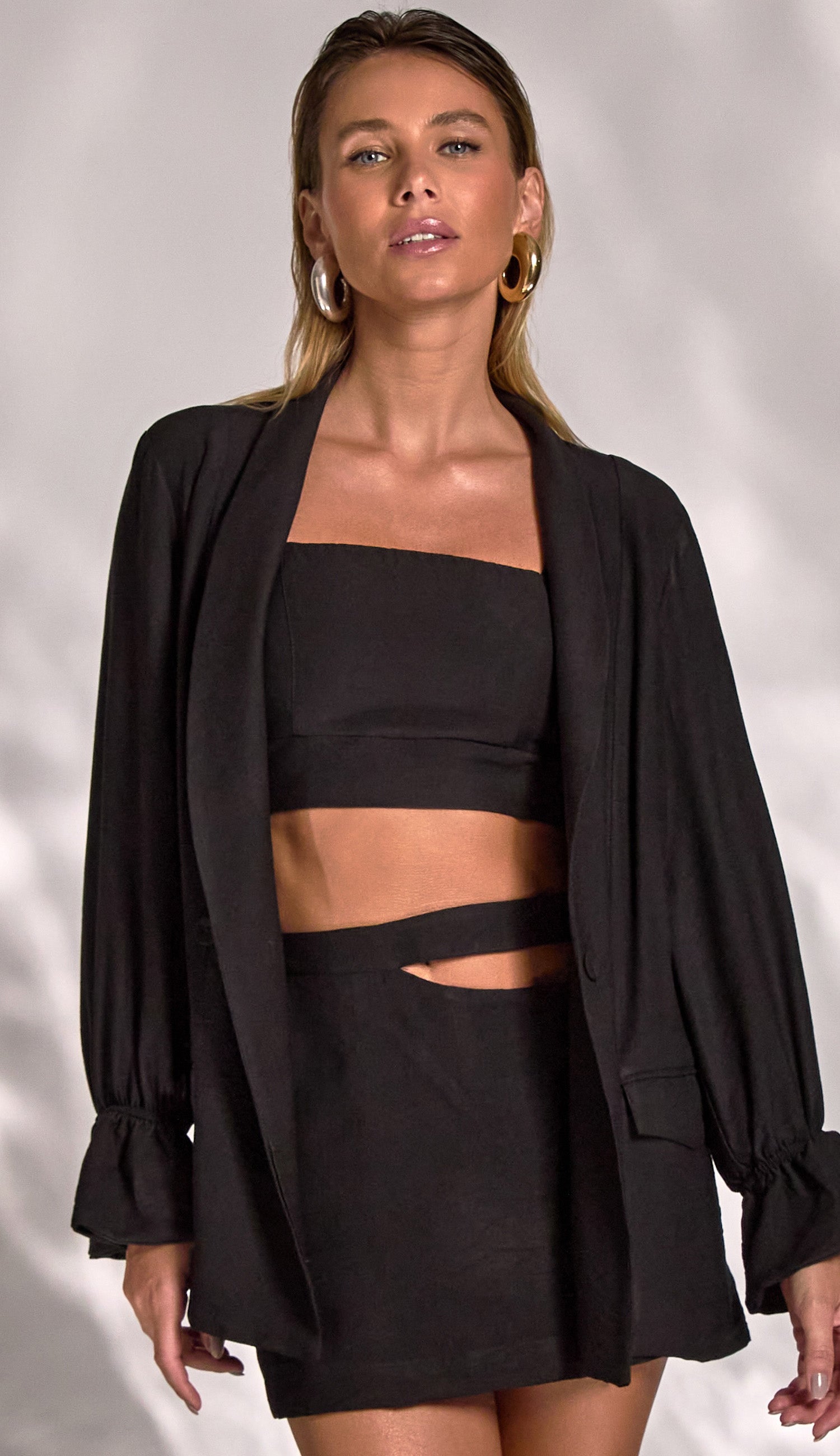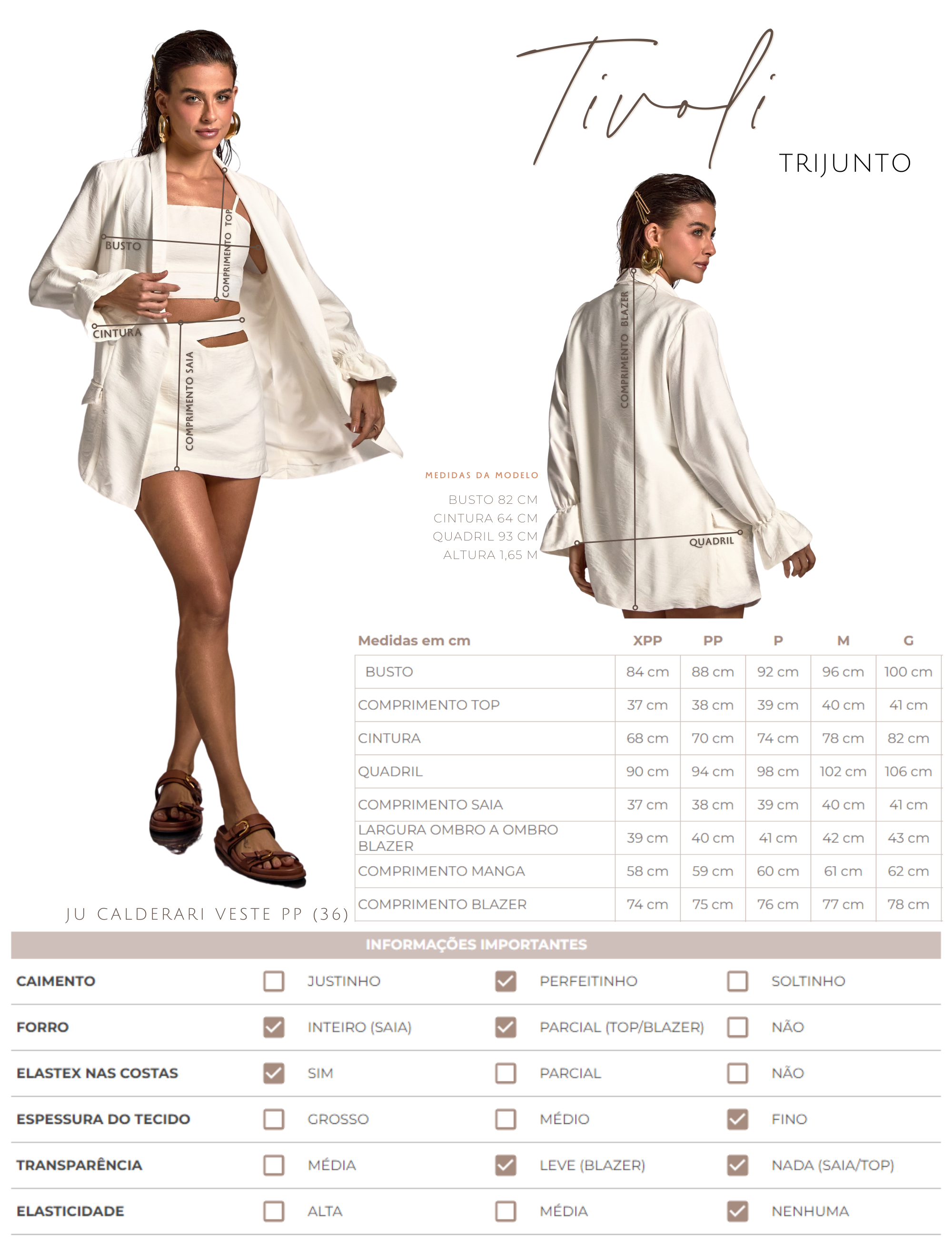 Trijunto confeccionado em poliviscose texturizado com aspecto de linho mais encorpado, efeito amassadinho e aparência levemente cintilante. O top possui forro, decote reto com elástico levemente franzido, alcinhas reguláveis, pala na cintura e lastex nas costas para melhor ajuste ao corpo. O shorts saia possui tecido duplo sobreposto, com shortinhos por baixo e saia por cima, evitando que fique transparente e garantindo mais conforto. Ele conta com bolso na lateral direita, recorte vazado geométrico no cós da lateral esquerda, que dá um charme especial à peça e o fechamento traseiro é por zíper de metal com o delicado detalhe do pingente com a conchinha da Laguna gravada. O blazer possui forro, modelagem alongada, fechamento frontal por único botão forrado com decote em V, lapela dobrada na gola, bolsos frontais também com lapelas e mangas longas com elástico franzido e babadinho nos punhos.