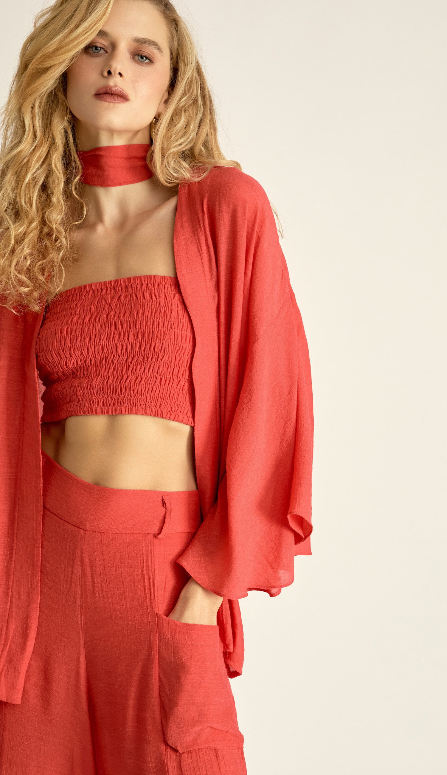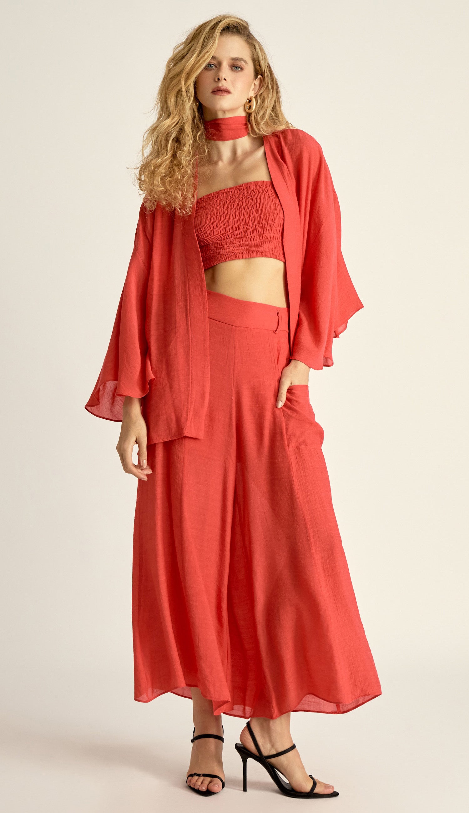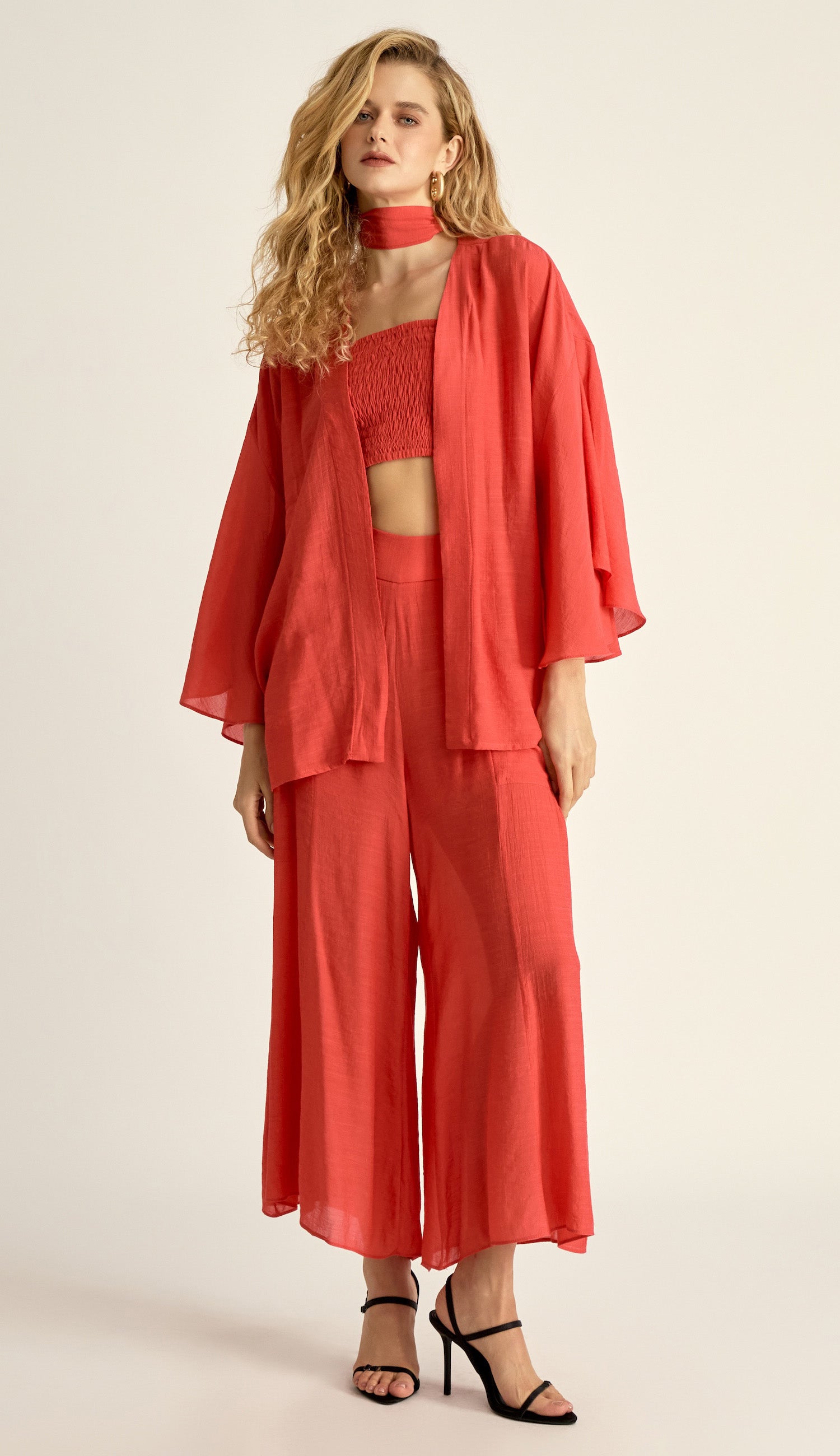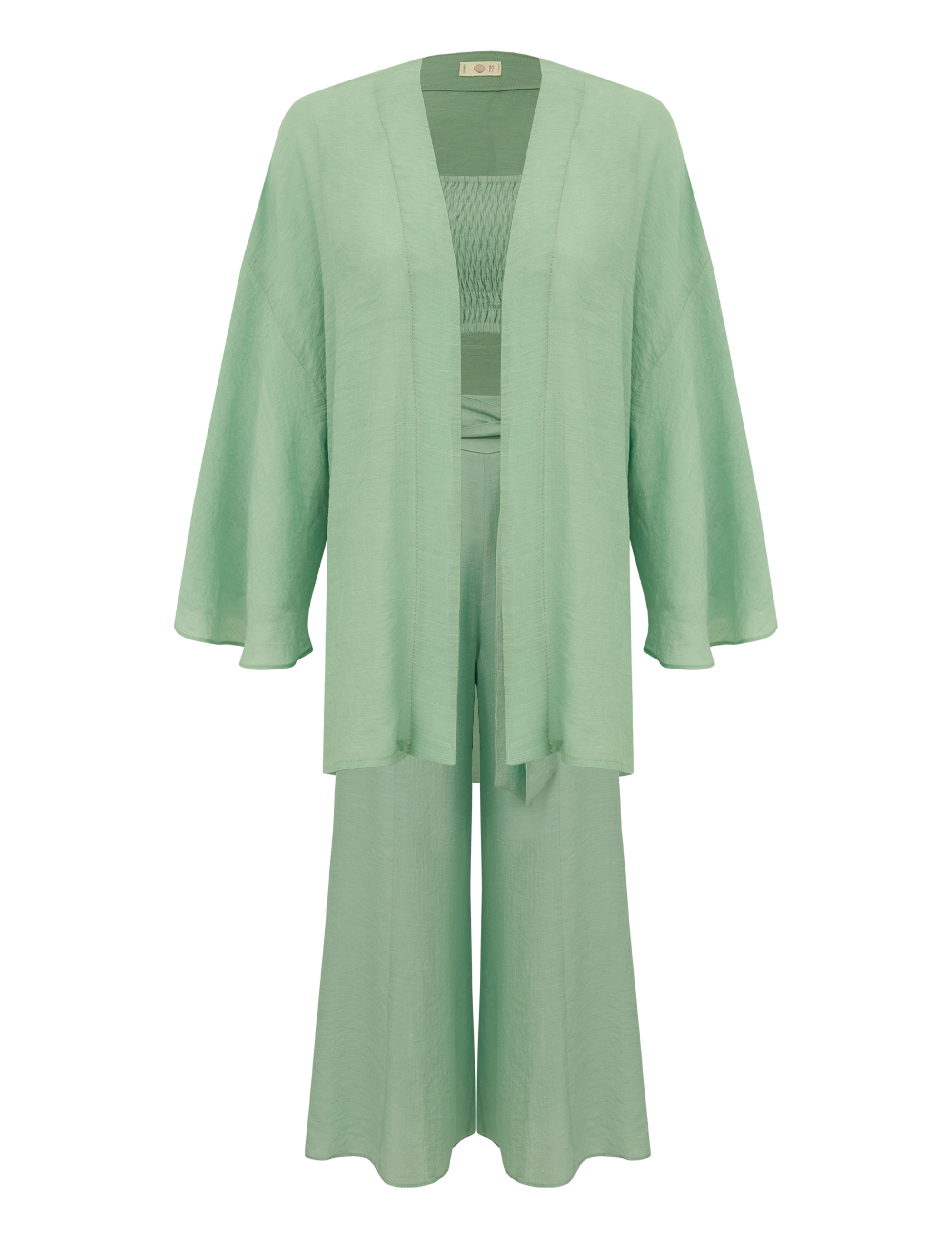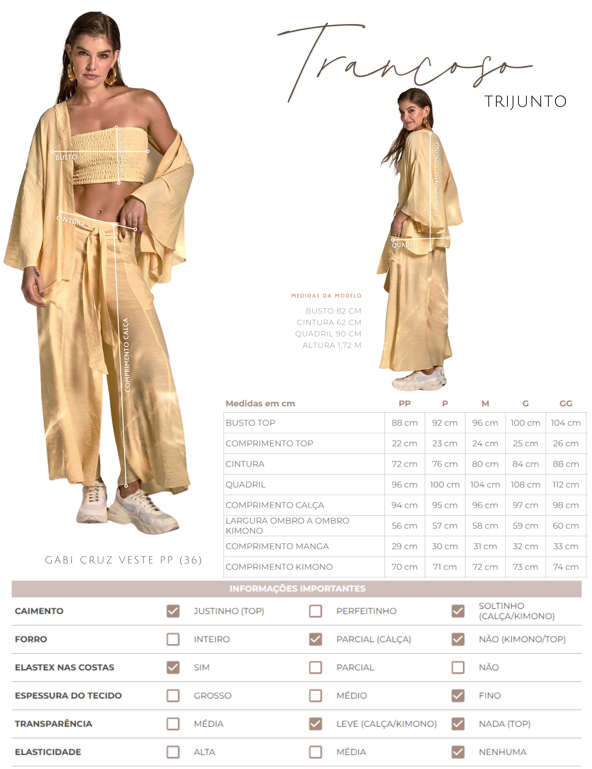 Trijunto confeccionado em poliviscose texturizado com aspecto de linho. O top é inteiro de lastex, o que dá conforto e sustentação. A calça pantacourt com forro possui faixa solta para amarração, bolsos frontais e fechamento por zíper invisível na lateral. O kimono possui mangas sino e abertura nas laterais.