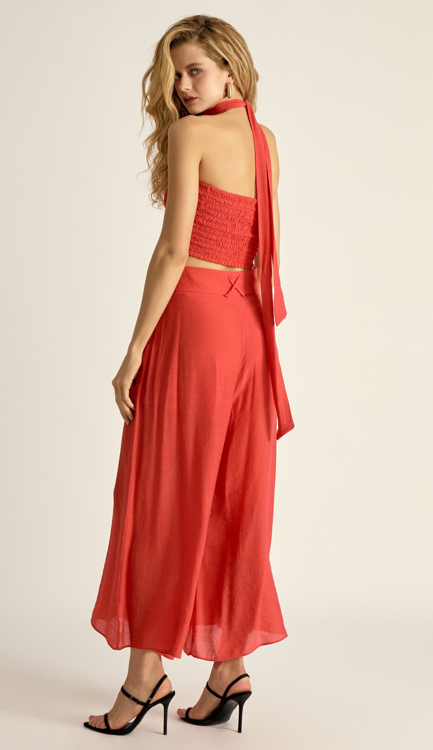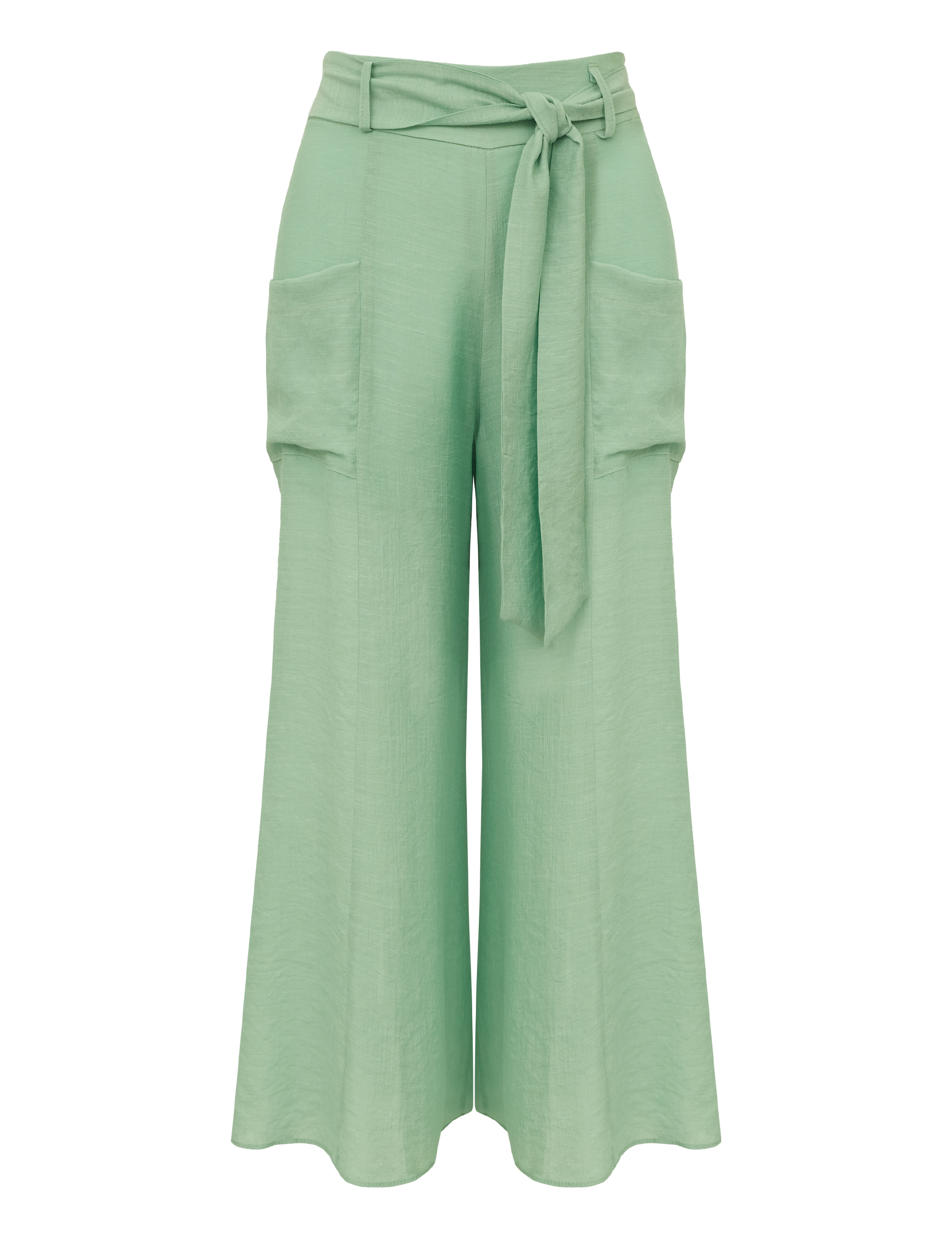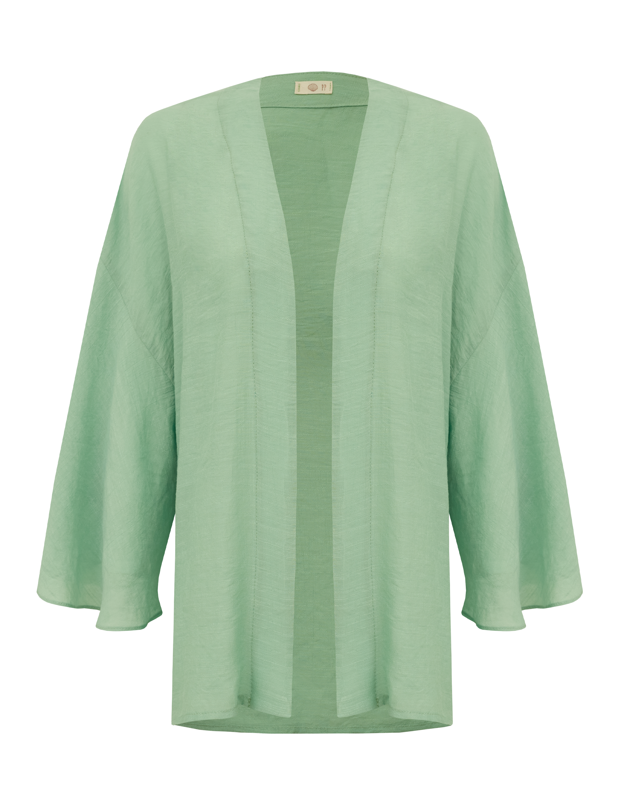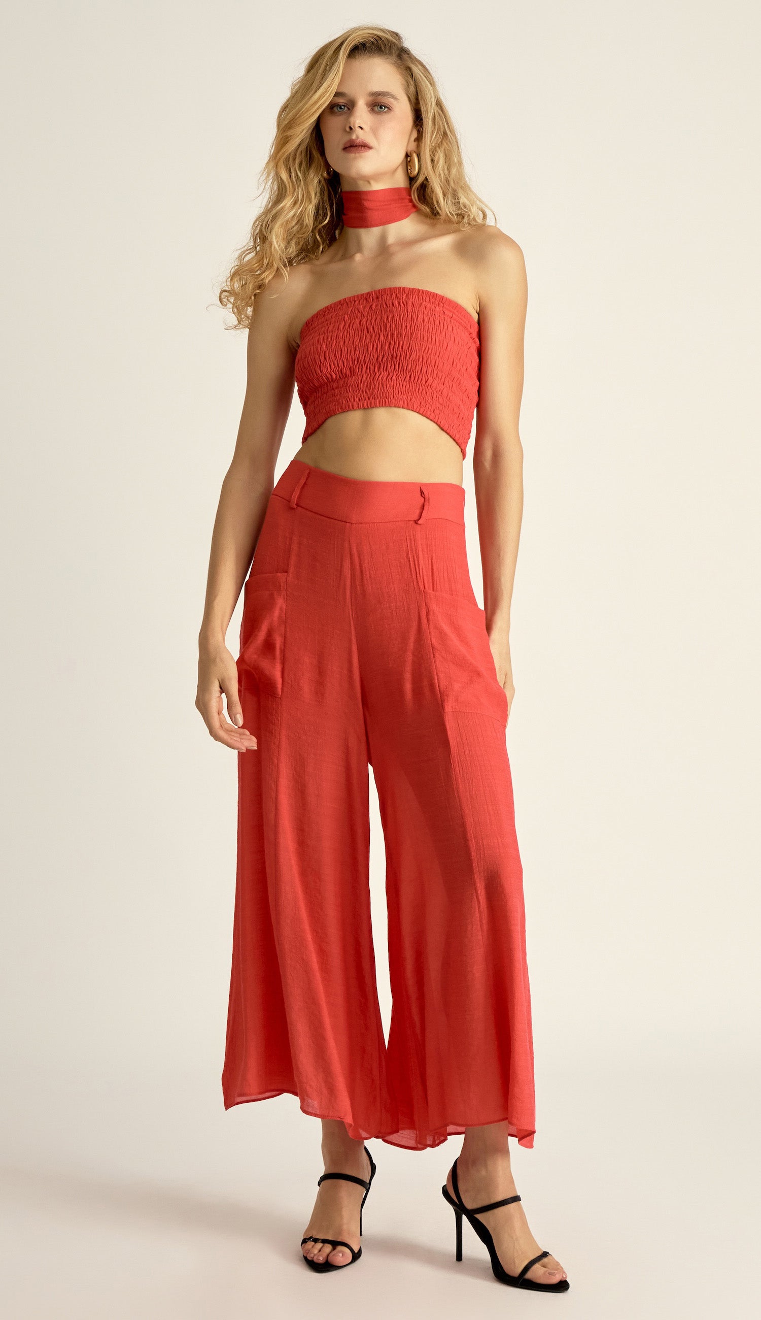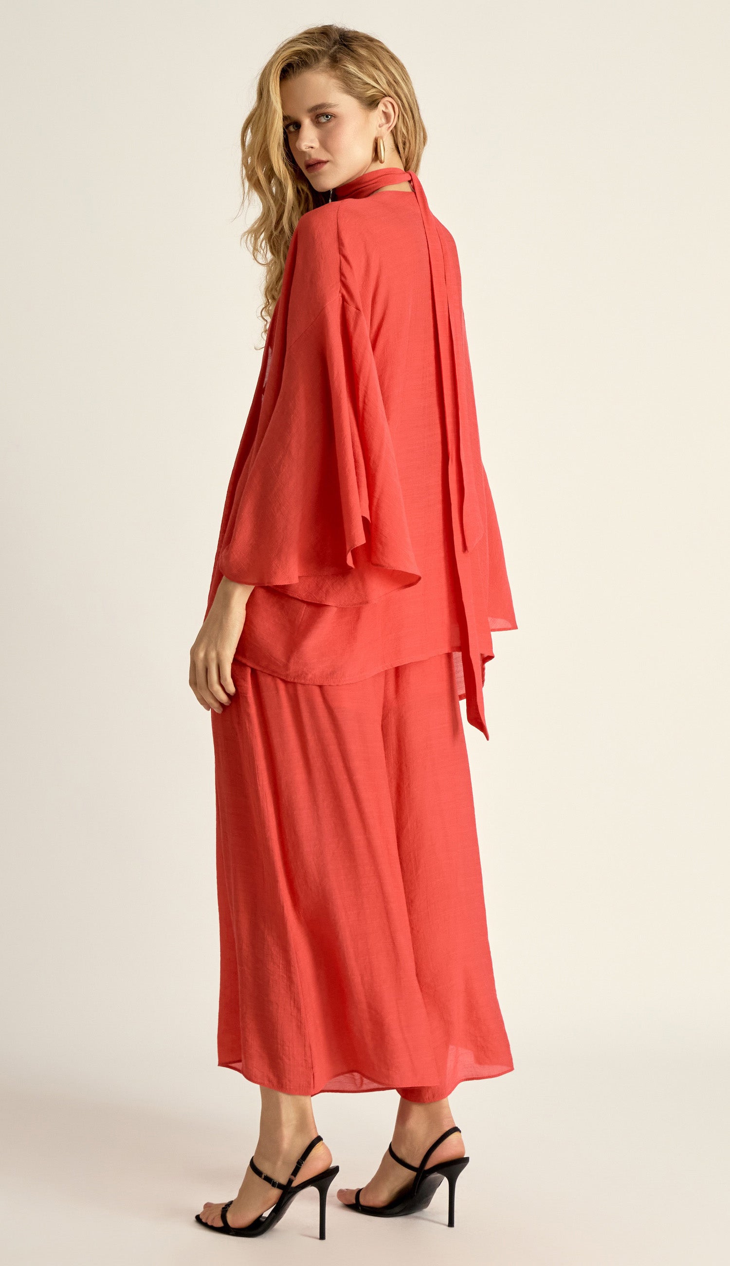 Trijunto confeccionado em poliviscose texturizado com aspecto de linho. O top é inteiro de lastex, o que dá conforto e sustentação. A calça pantacourt com forro possui faixa solta para amarração, bolsos frontais e fechamento por zíper invisível na lateral. O kimono possui mangas sino e abertura nas laterais.