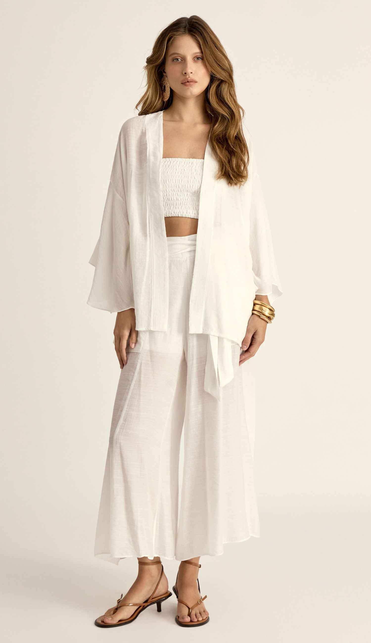 Trijunto confeccionado em poliviscose texturizado com aspecto de linho. O top é inteiro de lastex, o que dá conforto e sustentação. A calça pantacourt com forro possui faixa solta para amarração, bolsos frontais e fechamento por zíper invisível na lateral. O kimono possui mangas sino e abertura nas laterais.