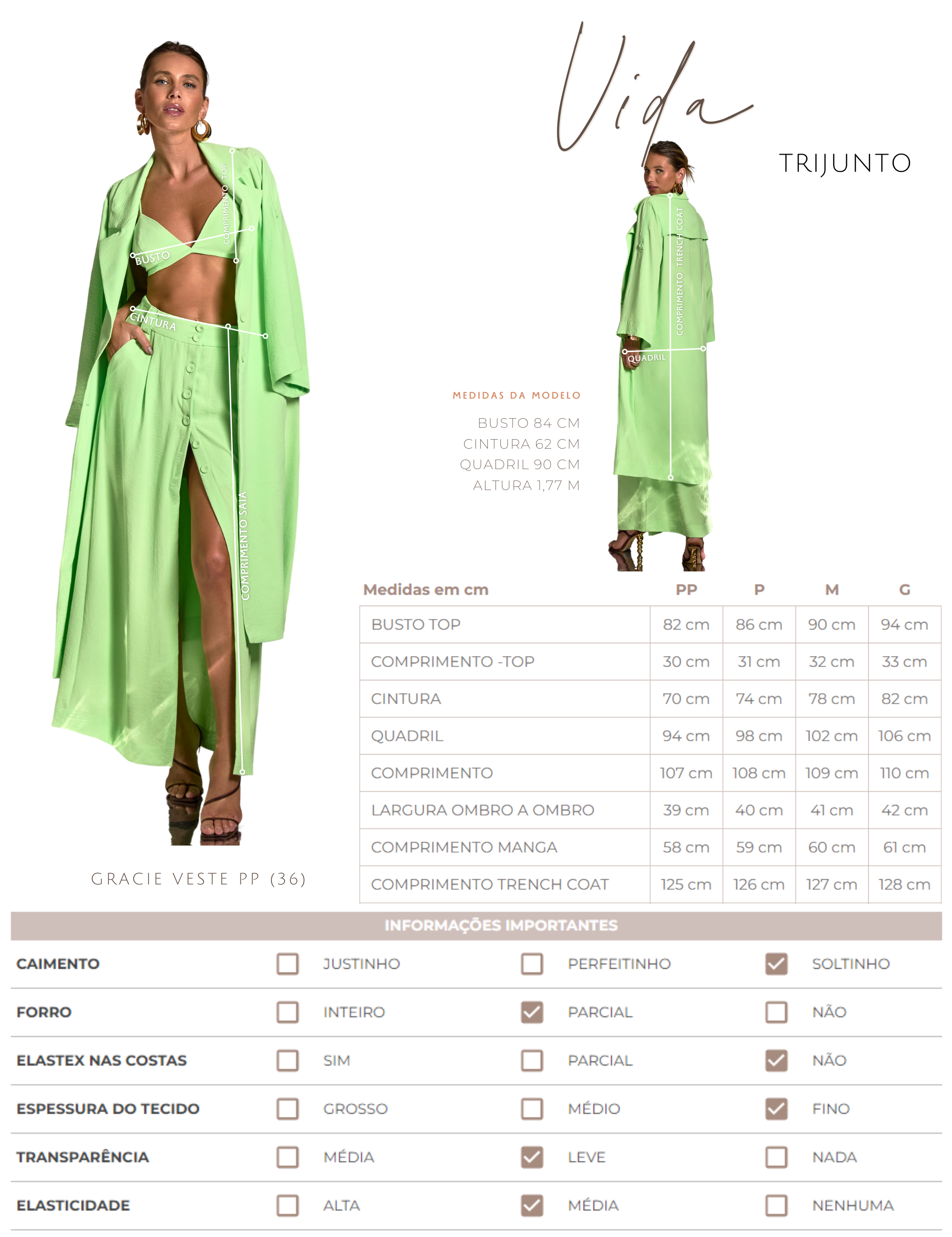 Trijunto em crepe texturizado com efeito amassadinho. O top é tipo "biquini" com decote em V, tecido duplo no busto para não ficar transparente, alcinhas reguláveis e elástico fino logo abaixo do busto com fechamento nas costas por fecho de metal para encaixe. A saia é longa com forro, tem bolsos laterais, fechamento frontal por botões forrados, fenda frontal e passantes no cós. O trench coat é longo com decote em V, lapelas dobradas na gola, fechamento frontal por botões forrados, mangas longas com martingale interno para ajuste na altura.
