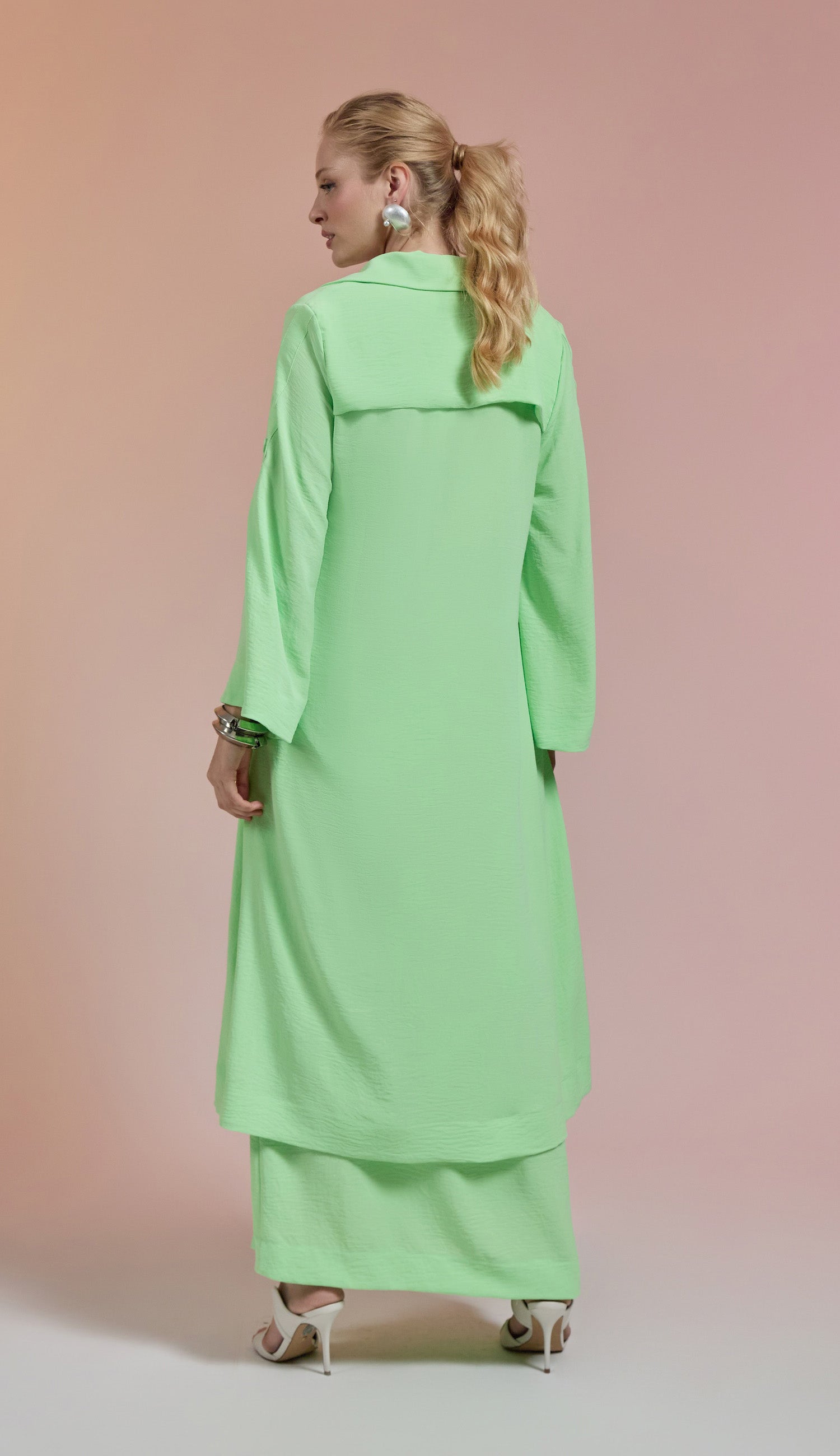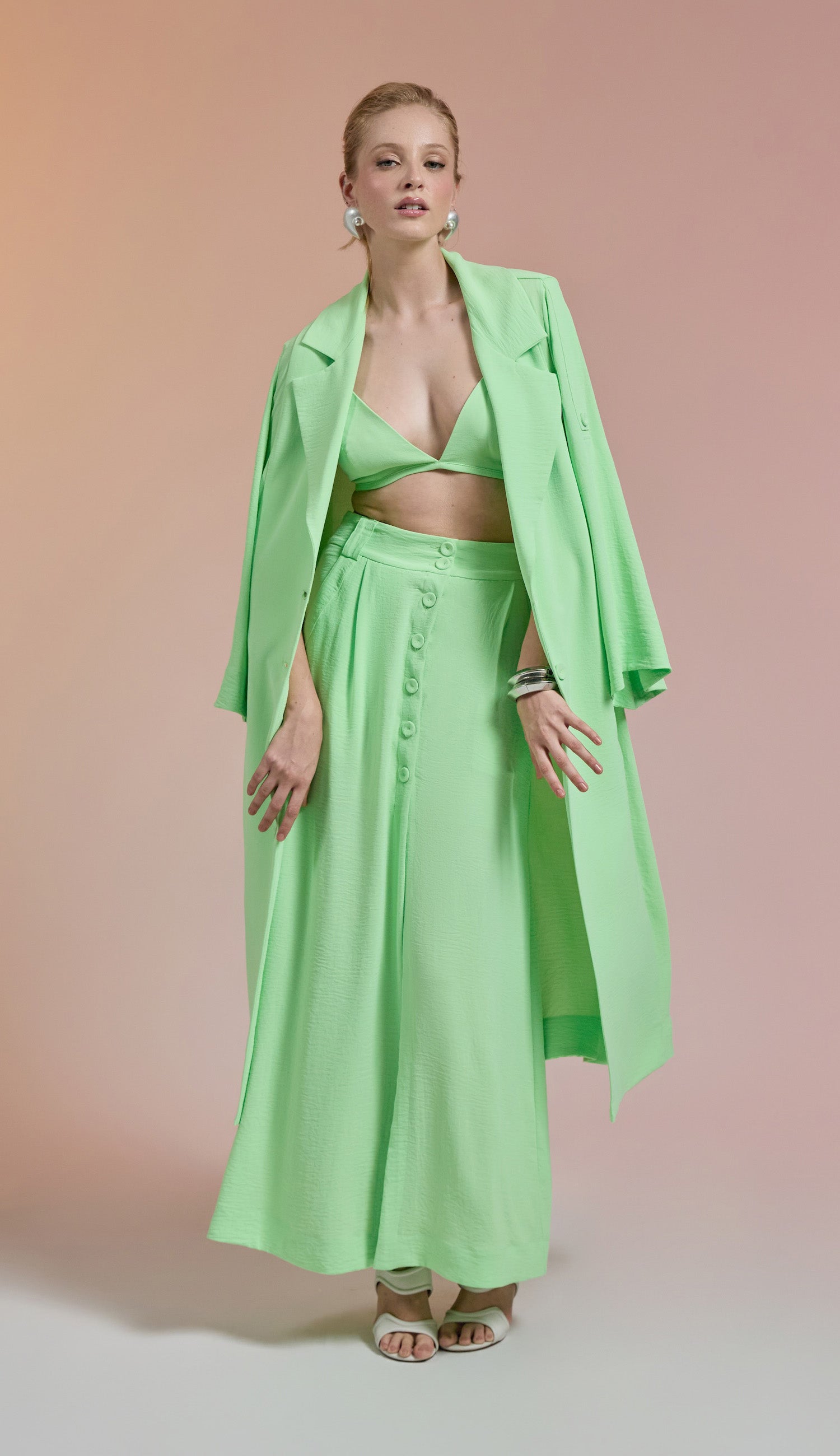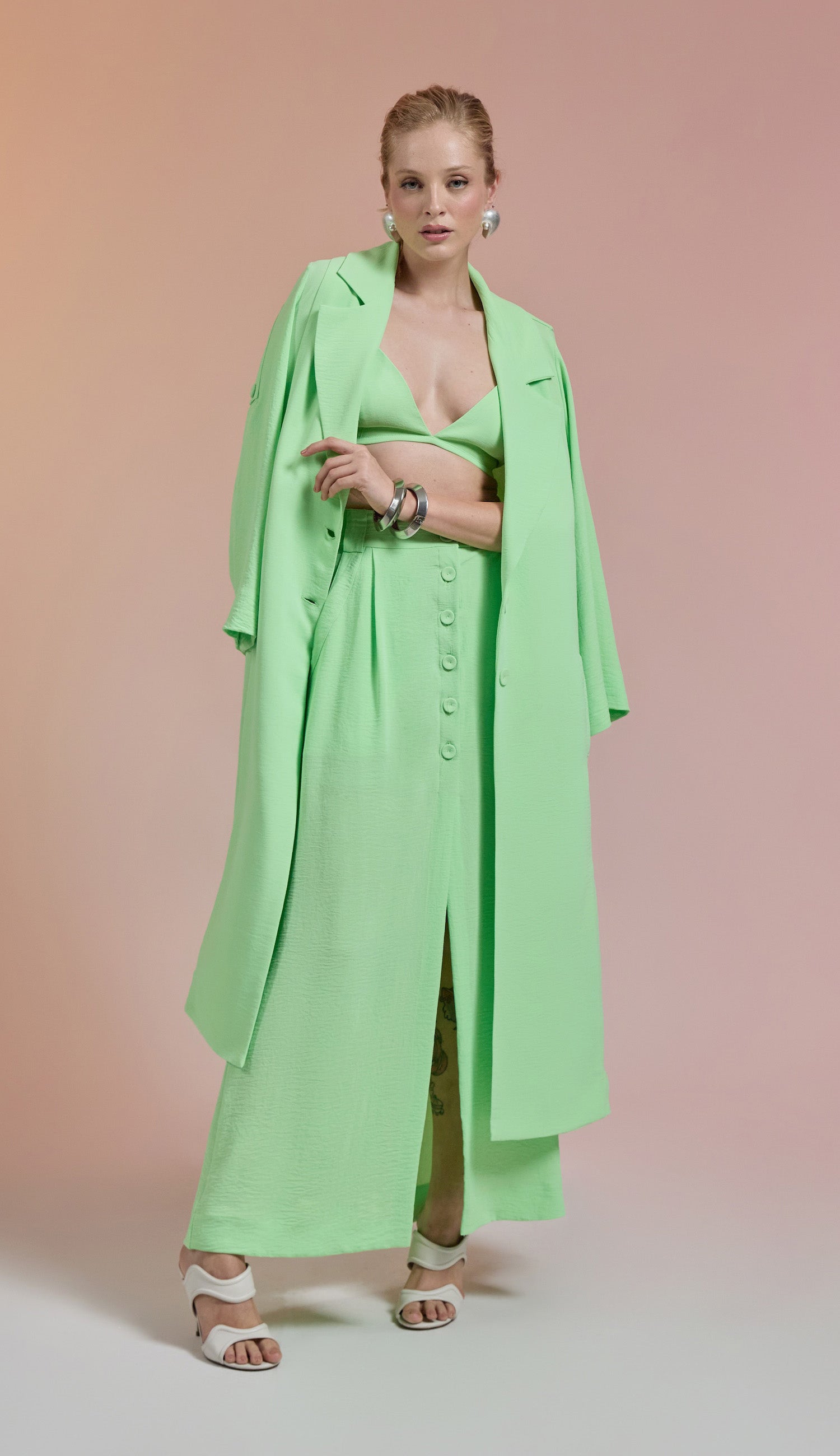 Trijunto em crepe texturizado com efeito amassadinho. O top é tipo "biquini" com decote em V, tecido duplo no busto para não ficar transparente, alcinhas reguláveis e elástico fino logo abaixo do busto com fechamento nas costas por fecho de metal para encaixe. A saia é longa com forro, tem bolsos laterais, fechamento frontal por botões forrados, fenda frontal e passantes no cós. O trench coat é longo com decote em V, lapelas dobradas na gola, fechamento frontal por botões forrados, mangas longas com martingale interno para ajuste na altura.