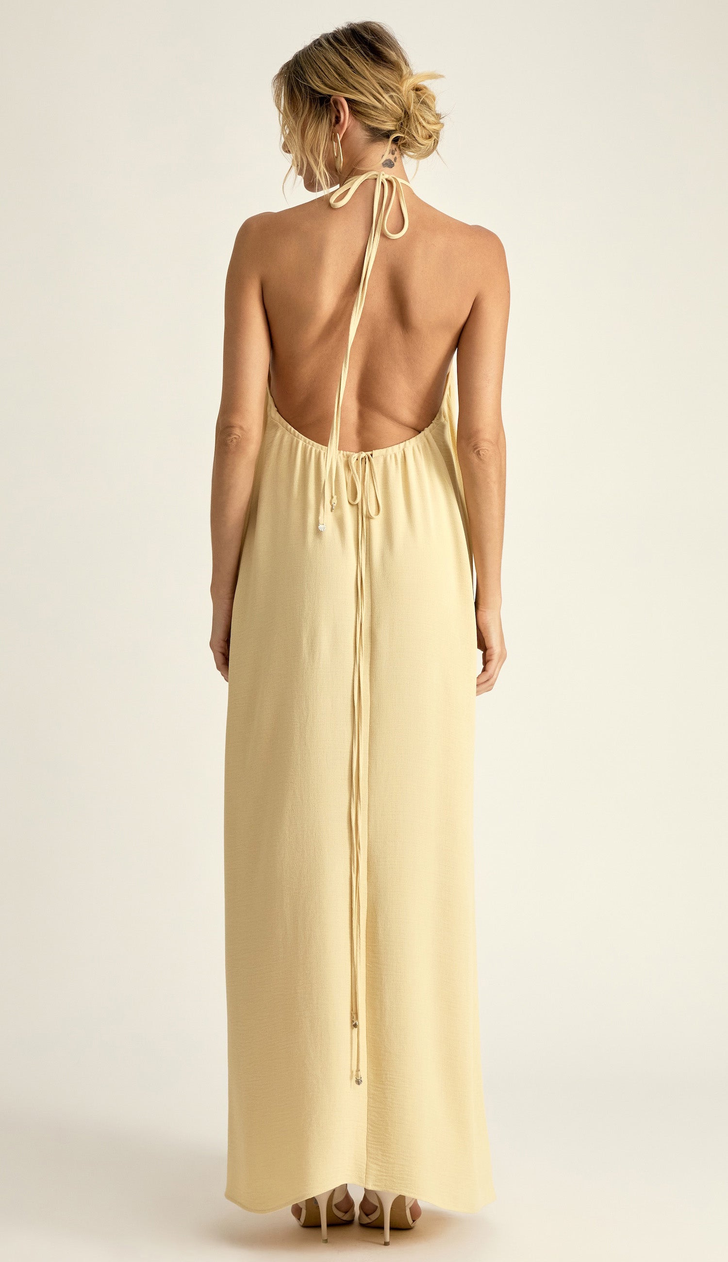 Vestido longo com forro; confeccionado em crepe texturizado mais encorpadinho com aspecto de linho. Possui modelagem ampla, decote halter estilo frente única com detalhe frontal de franzidinhos no decote, tiras fininhas compridas com ponteiras de metal na gola para amarrar no pescoço e tira embutida nas costas para ajuste da altura do decote e amarração.