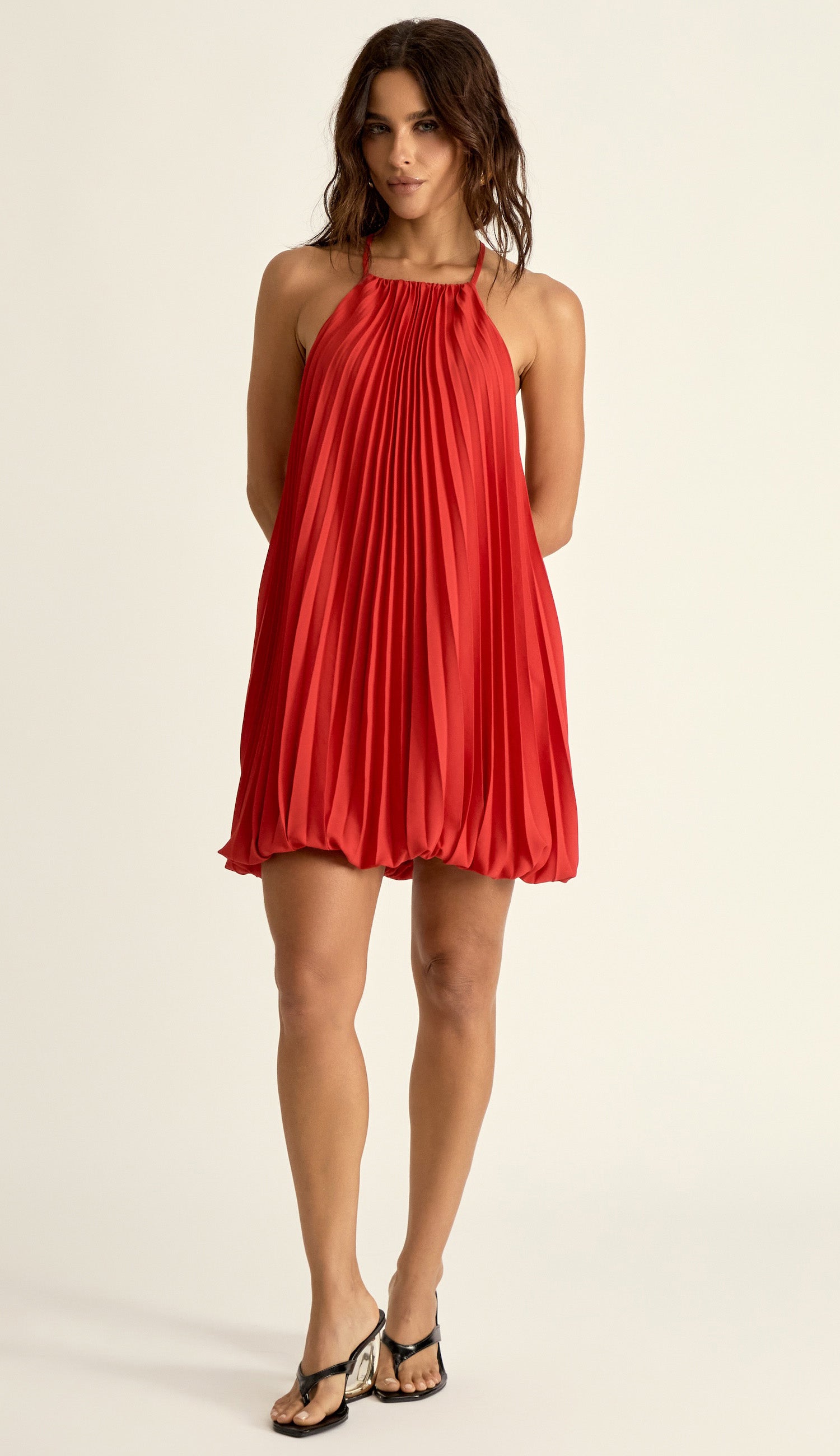 Vestido curto confeccionado em crepe plissado com forro. Possui decote halter, alcinhas finas com fechamento por botão esmaltado na nuca, modelagem soltinha com elástico interno franzido na barra da saia em estilo balonê, lindo decote nas costas com aplicação de tirinhas verticais e elástico nas costas.